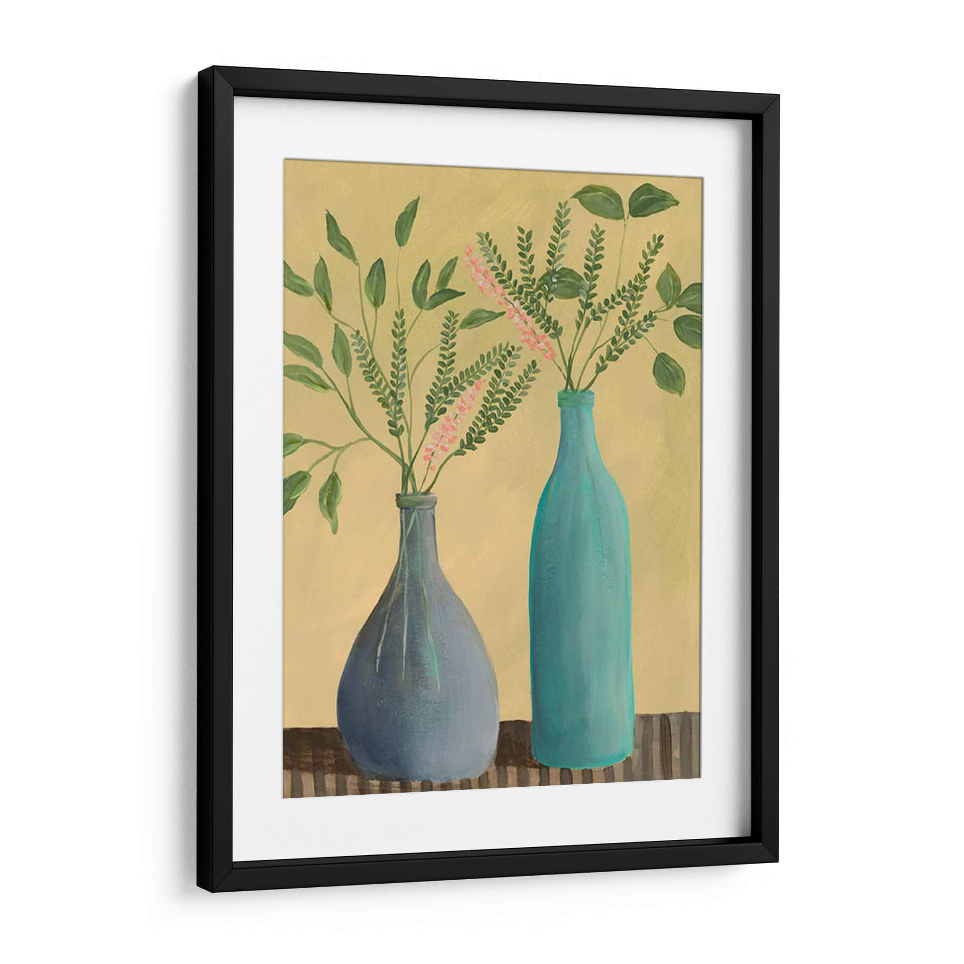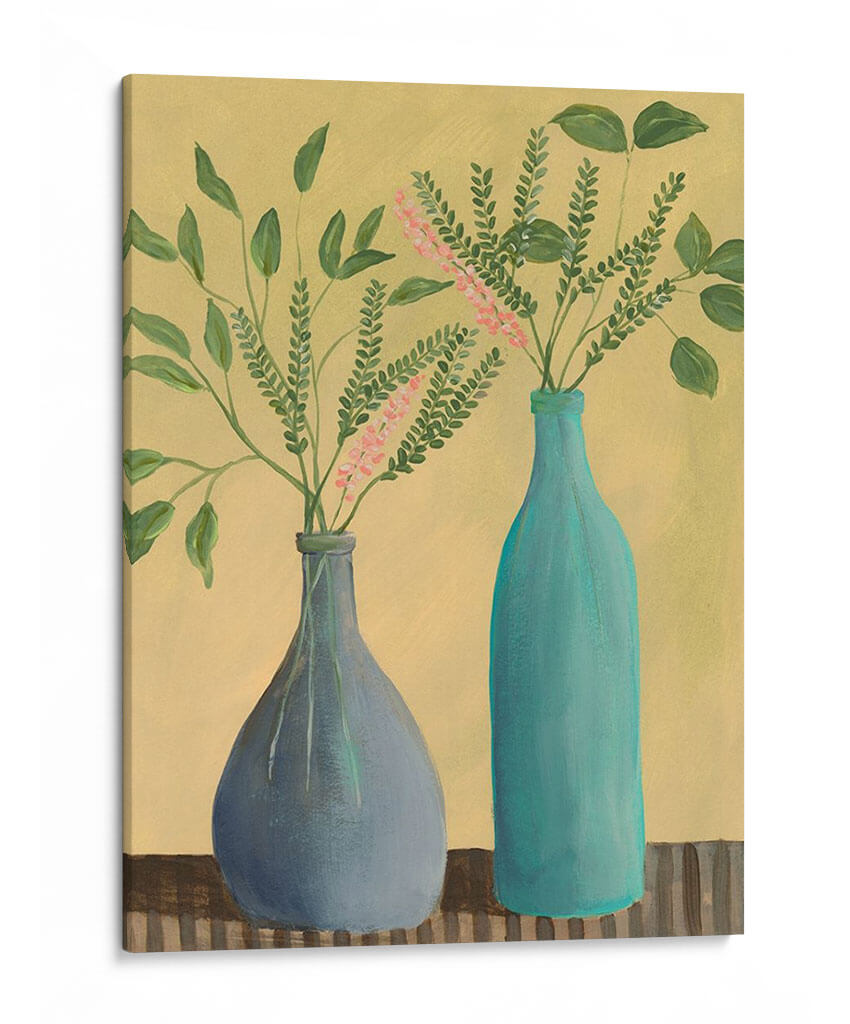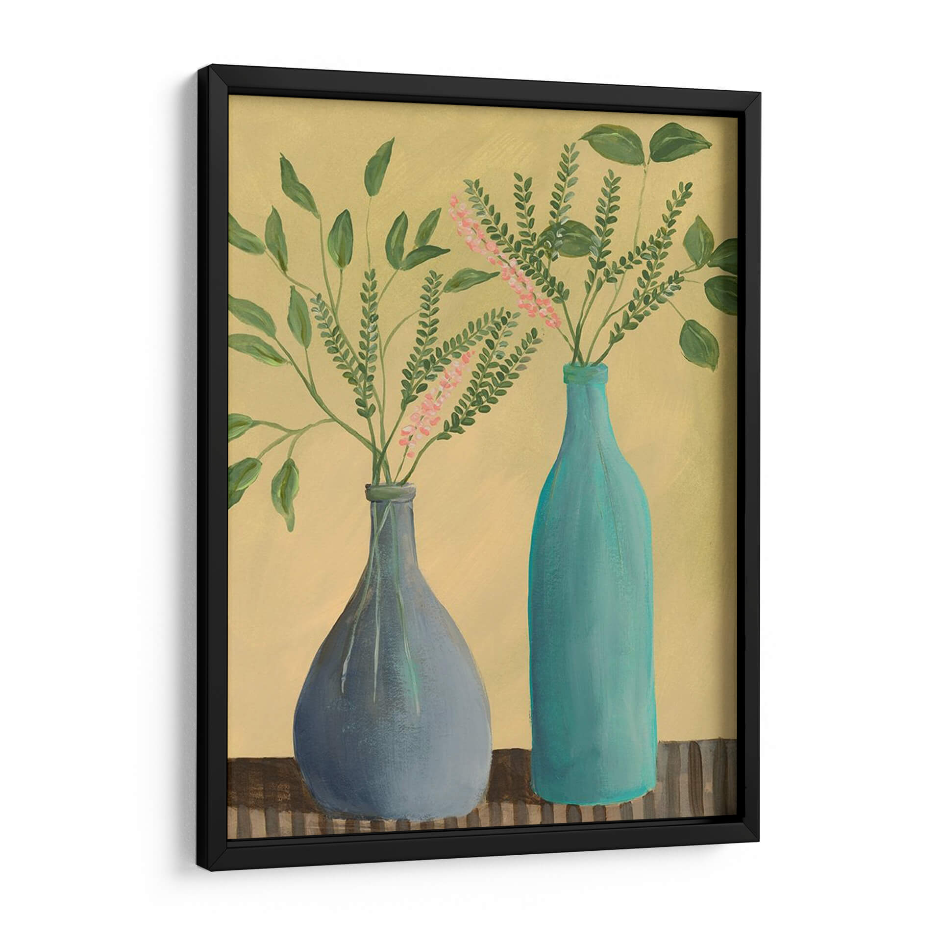 Sumérgete en la serenidad de 'Viñeta De Botella I', una obra de arte contemporáneo que captura la delicadeza de la naturaleza a través de una composición evocadora y una paleta de colores suave. Este cuadro decorativo presenta dos botellas, una en un sereno tono gris azulado y otra en un vibrante verde azulado, que contienen delicados arreglos florales. Las ramas verdes, con sus hojas exuberantes, contrastan sutilmente con las finas espigas de flores rosadas, creando un diálogo visual de texturas y formas. El fondo, bañado en un cálido tono ocre, aporta una sensación de luminosidad y calidez, mientras que la base rayada añade un toque de modernidad sutil. La obra, firmada por Regina Moore, irradia una atmósfera de calma y contemplación, ideal para infundir tranquilidad en cualquier espacio. Este cuadro decorativo es perfecto para añadir un toque de elegancia natural a tu sala de estar, dormitorio u oficina, convirtiéndose en un punto focal que invita a la relajación y al aprecio por la belleza sencilla. Su estilo, que combina elementos botánicos con una estética moderna, lo hace versátil para diversos estilos de decoración.