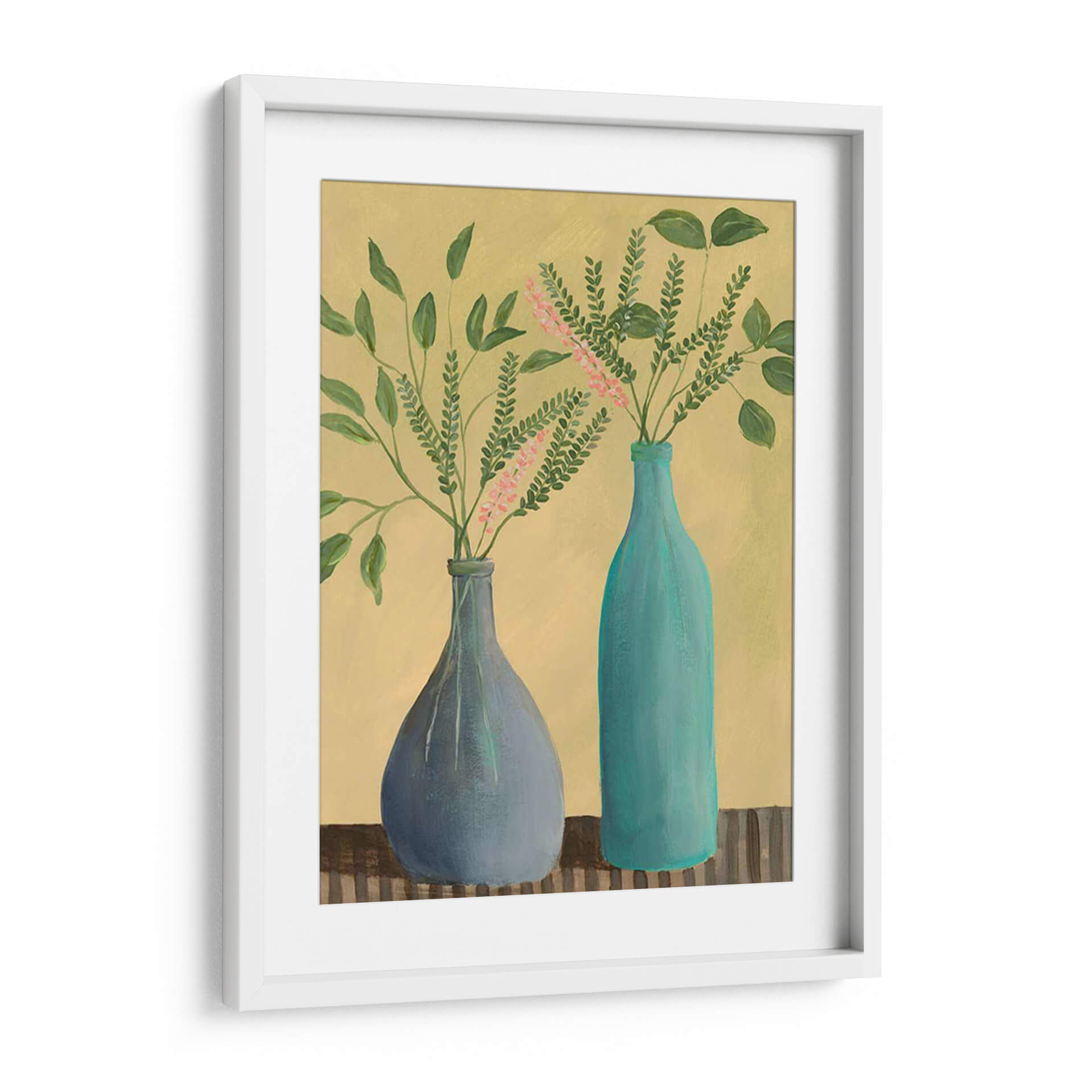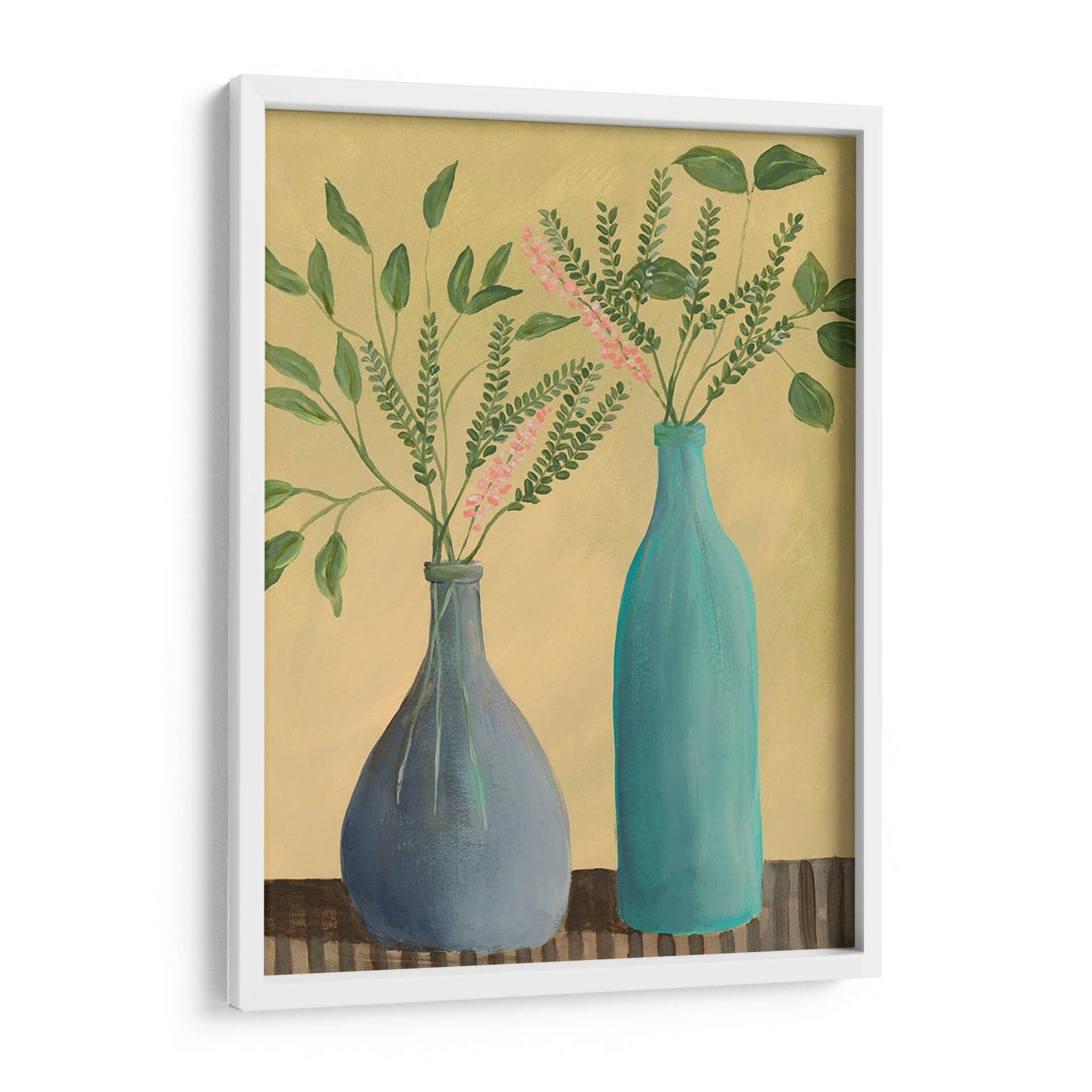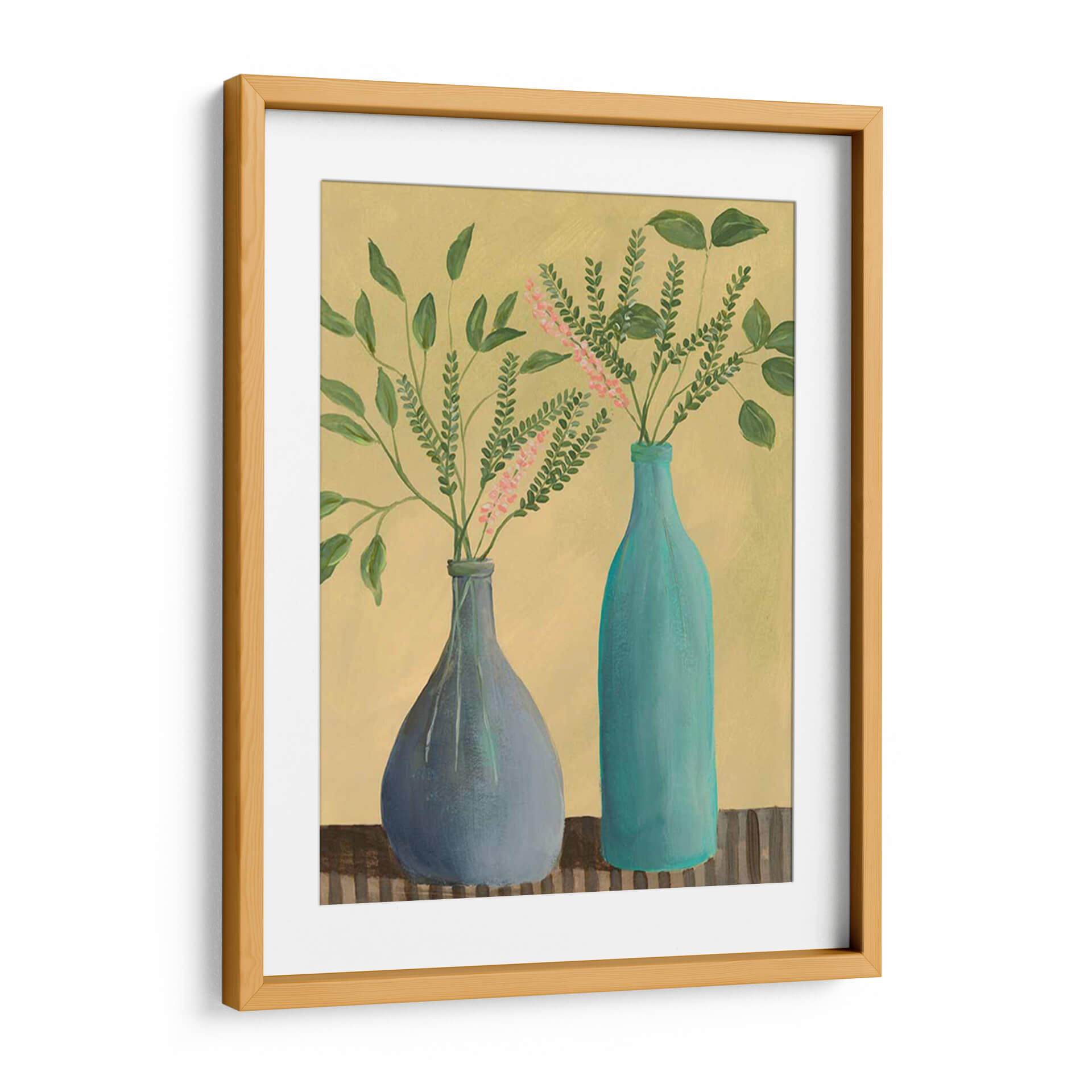 Sumérgete en la serenidad de 'Viñeta De Botella I', una obra de arte contemporáneo que captura la delicadeza de la naturaleza a través de una composición evocadora y una paleta de colores suave. Este cuadro decorativo presenta dos botellas, una en un sereno tono gris azulado y otra en un vibrante verde azulado, que contienen delicados arreglos florales. Las ramas verdes, con sus hojas exuberantes, contrastan sutilmente con las finas espigas de flores rosadas, creando un diálogo visual de texturas y formas. El fondo, bañado en un cálido tono ocre, aporta una sensación de luminosidad y calidez, mientras que la base rayada añade un toque de modernidad sutil. La obra, firmada por Regina Moore, irradia una atmósfera de calma y contemplación, ideal para infundir tranquilidad en cualquier espacio. Este cuadro decorativo es perfecto para añadir un toque de elegancia natural a tu sala de estar, dormitorio u oficina, convirtiéndose en un punto focal que invita a la relajación y al aprecio por la belleza sencilla. Su estilo, que combina elementos botánicos con una estética moderna, lo hace versátil para diversos estilos de decoración.