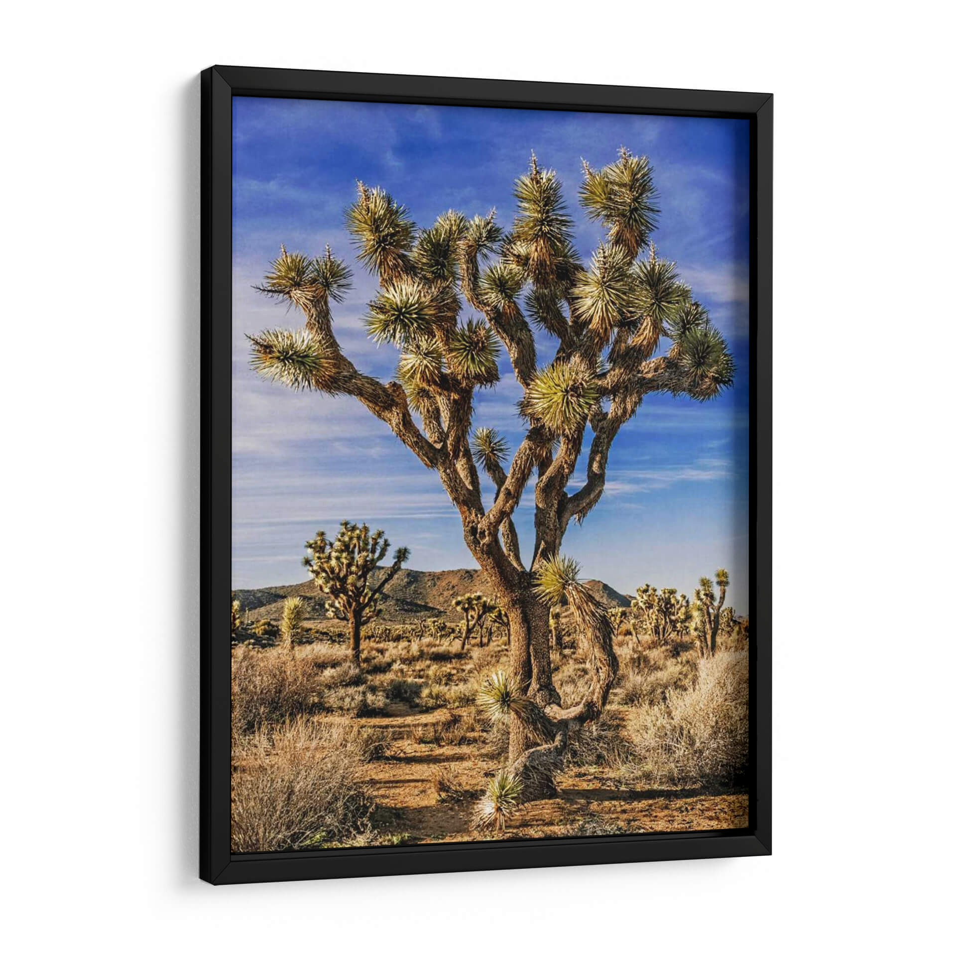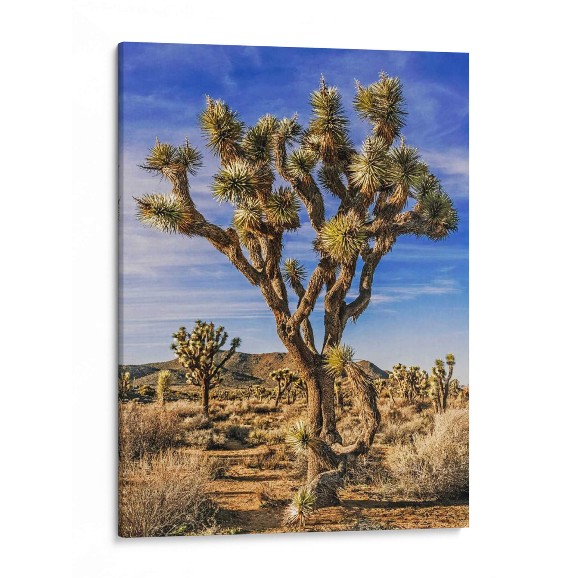 Sumérgete en la majestuosidad del desierto de Mojave con "Vistas De Joshua Tree Iii", una obra de arte que captura la esencia icónica de estos árboles singulares. Rachel Perry nos transporta a un paisaje árido y vasto, dominado por un árbol de Josué retorcido y robusto que se alza con orgullo contra un cielo azul vibrante y nubes tenues. La luz del sol baña la escena, creando sombras definidas y resaltando las texturas rugosas de la corteza y las hojas puntiagudas. La paleta de colores se compone de tonos tierra cálidos, ocres, marrones y verdes secos, contrastando maravillosamente con el azul intenso del cielo, lo que evoca una sensación de calma, resistencia y belleza natural. Este cuadro decorativo es perfecto para añadir un toque de la naturaleza salvaje y serena a cualquier espacio. Su composición, centrada en el imponente árbol y rodeada por la extensión del desierto con otras siluetas de árboles de Josué en el fondo, invita a la contemplación y a la admiración de la resiliencia del paisaje. Ideal para salones, estudios u oficinas que busquen un punto focal inspirador y una conexión con la fuerza de la naturaleza.