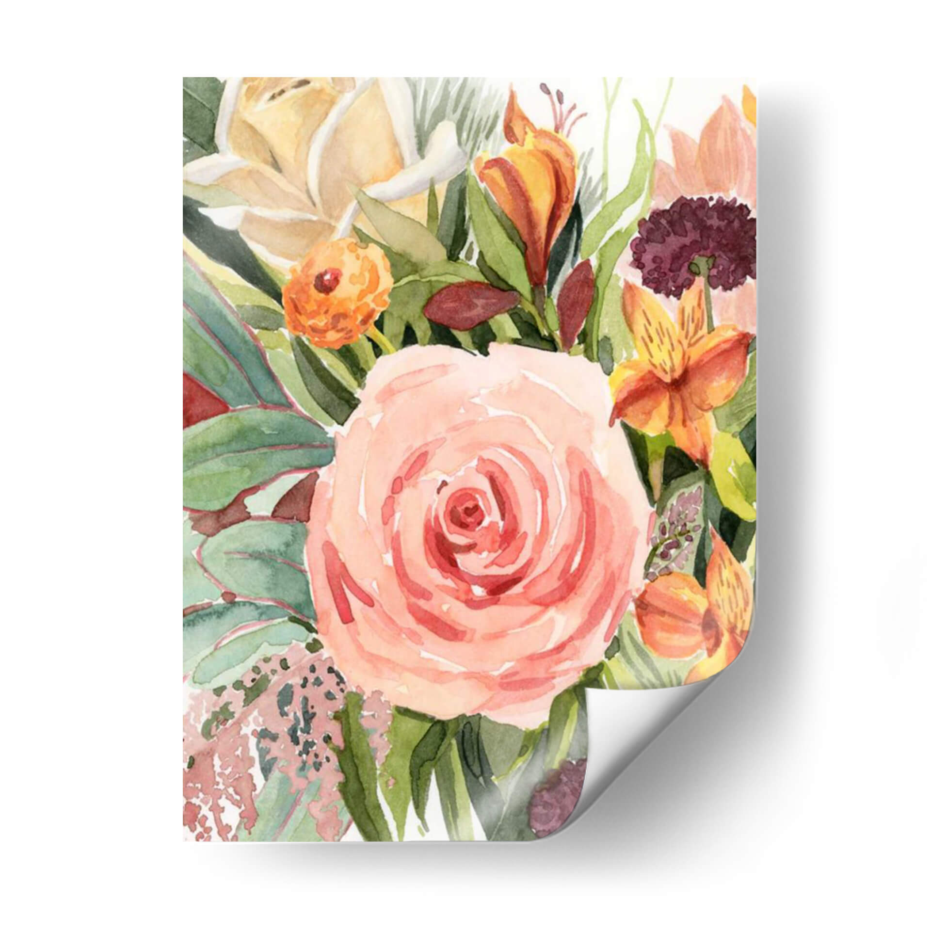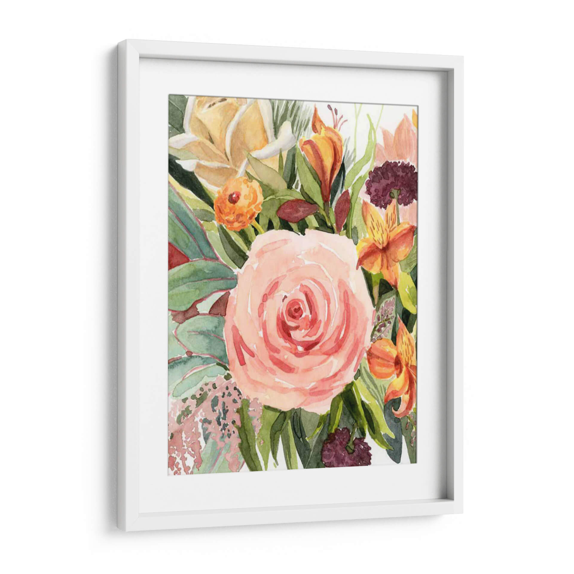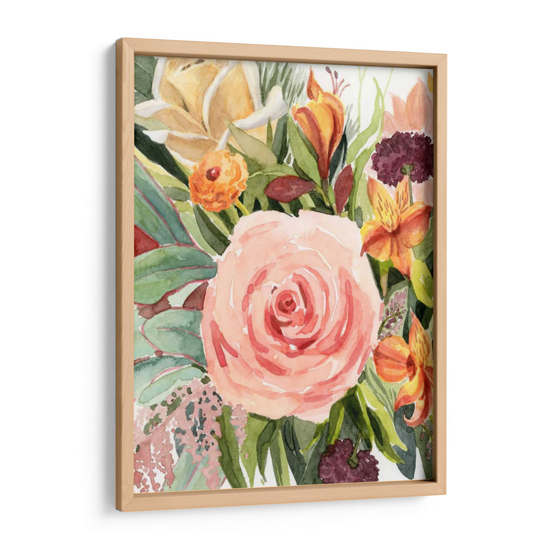 Sumérgete en la delicadeza floral de 'West Flora I', una obra maestra de Grace Popp que captura la esencia vibrante de la naturaleza con una técnica de acuarela exquisita. Este cuadro decorativo presenta un arreglo exuberante de flores en tonos pastel y vibrantes, dominado por una gran rosa en el centro que irradia calidez y serenidad. Las hojas verdes y las flores secundarias en tonos anaranjados, amarillos y púrpuras crean una composición rica y dinámica, llena de vida y movimiento. La aplicación de acuarela aporta una ligereza etérea y una profundidad sutil, invitando a la contemplación y añadiendo un toque de elegancia atemporal a cualquier espacio. "West Flora I" es perfecto para infundir alegría y frescura en salas de estar, dormitorios o estudios, transformando las paredes en un jardín interior lleno de color y belleza. Descubre la armonía y el encanto de esta pieza, ideal para quienes buscan añadir un acento de color y sofisticación natural a su decoración.