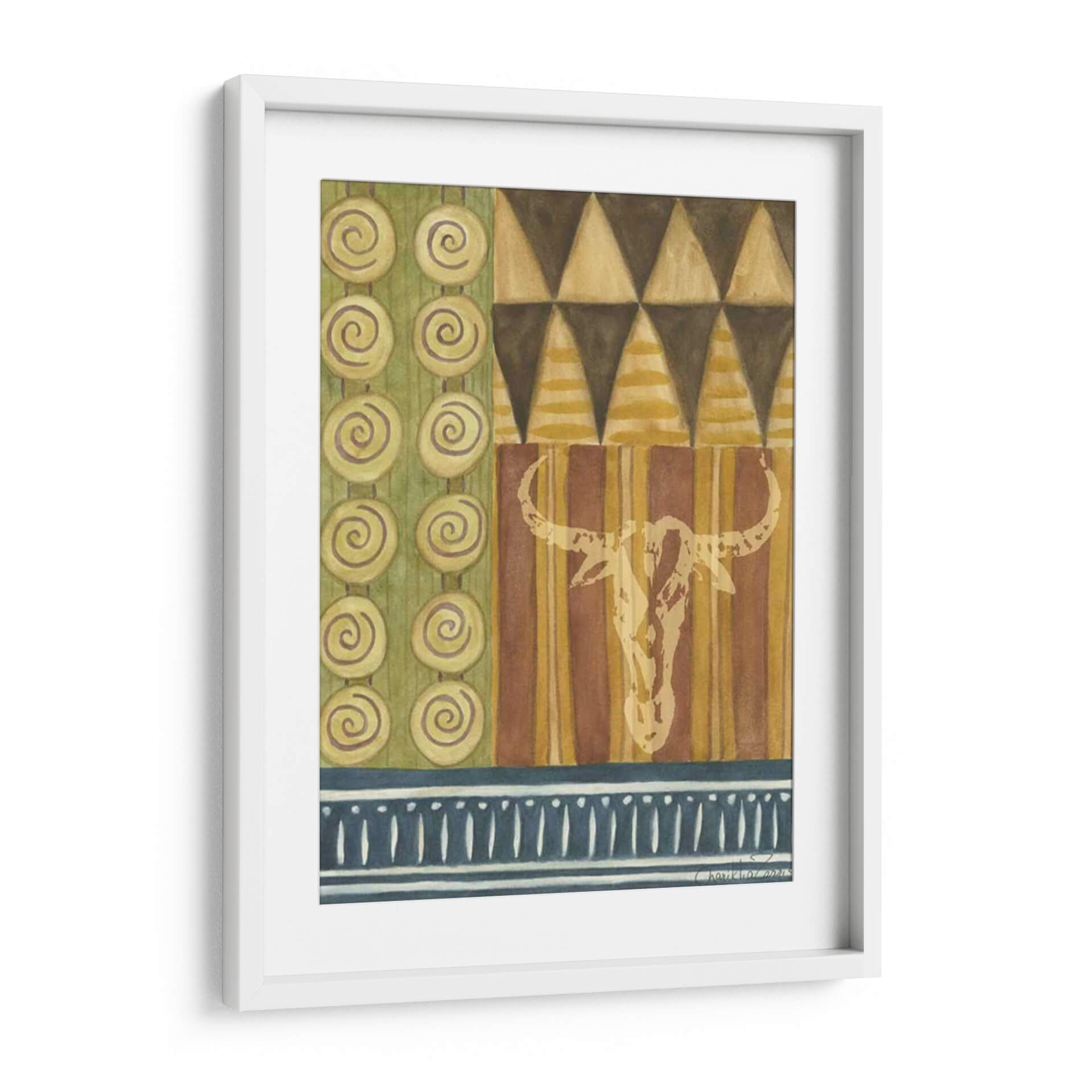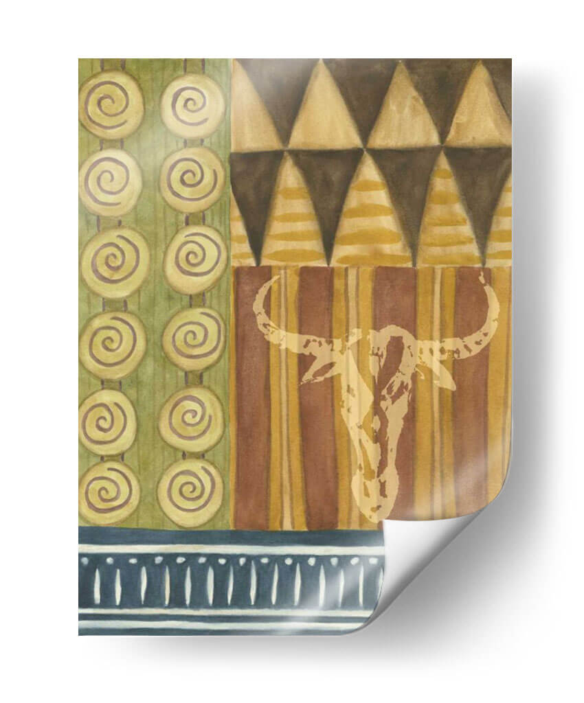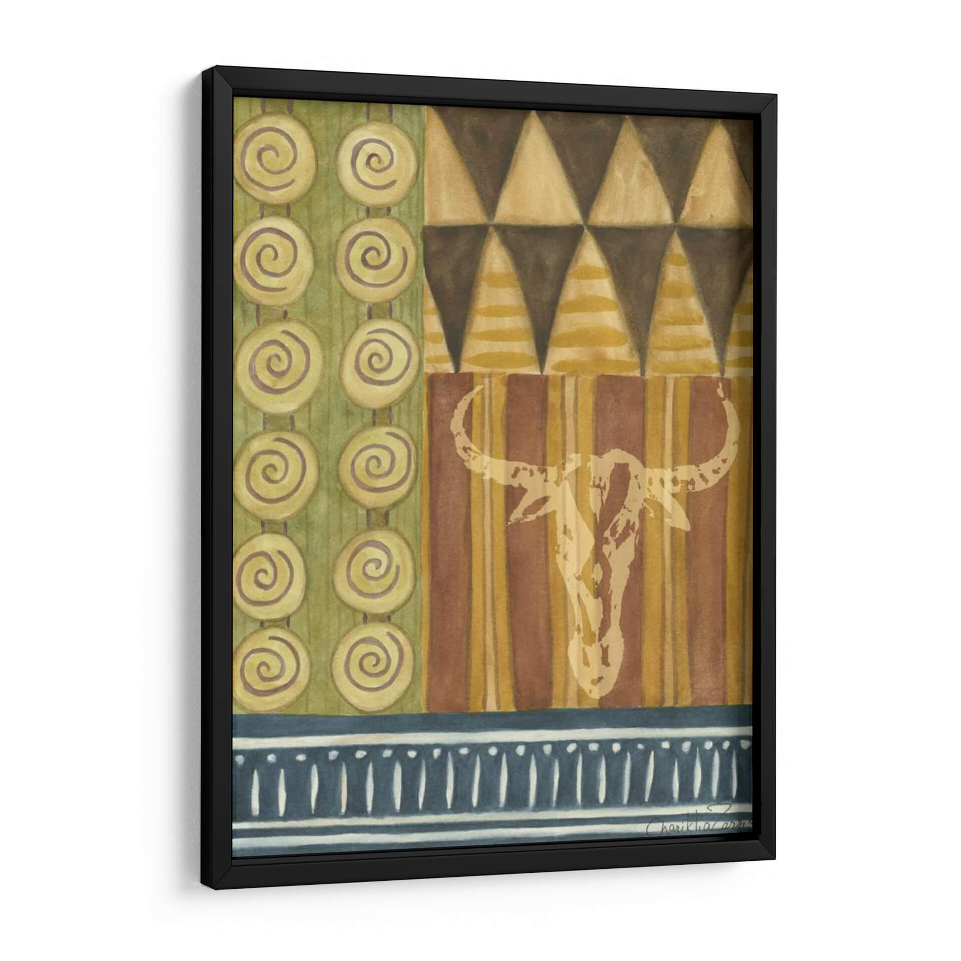 Sumérgete en la esencia ancestral con "Ancestro Espíritu II" de Chariklia Zarris, una obra de arte que evoca fuerza y conexión con la naturaleza. Este cuadro decorativo presenta una composición intrigante, dividida en secciones que combinan patrones geométricos y texturas orgánicas. En el centro, la silueta etérea de un cráneo de toro, con sus imponentes cuernos, emerge sobre un fondo de vibrantes rayas verticales en tonos tierra, ocre y marrón, creando un punto focal cautivador. A la izquierda, una cuadrícula de espirales doradas sobre un verde musgo aporta un elemento de misticismo y movimiento circular, mientras que la sección superior despliega un patrón de triángulos en marrón oscuro y amarillo que añade profundidad y contraste. La franja inferior, con un diseño decorativo en azul marino y blanco, ancla la pieza con un toque de elegancia tribal. "Ancestro Espíritu II" es ideal para espacios que buscan un carácter distintivo, aportando una atmósfera de poder sereno y reverencia por lo antiguo. Perfecto para salas de estar, estudios o comedores, este lienzo es una invitación a contemplar la simbología del espíritu animal y la herencia cultural.