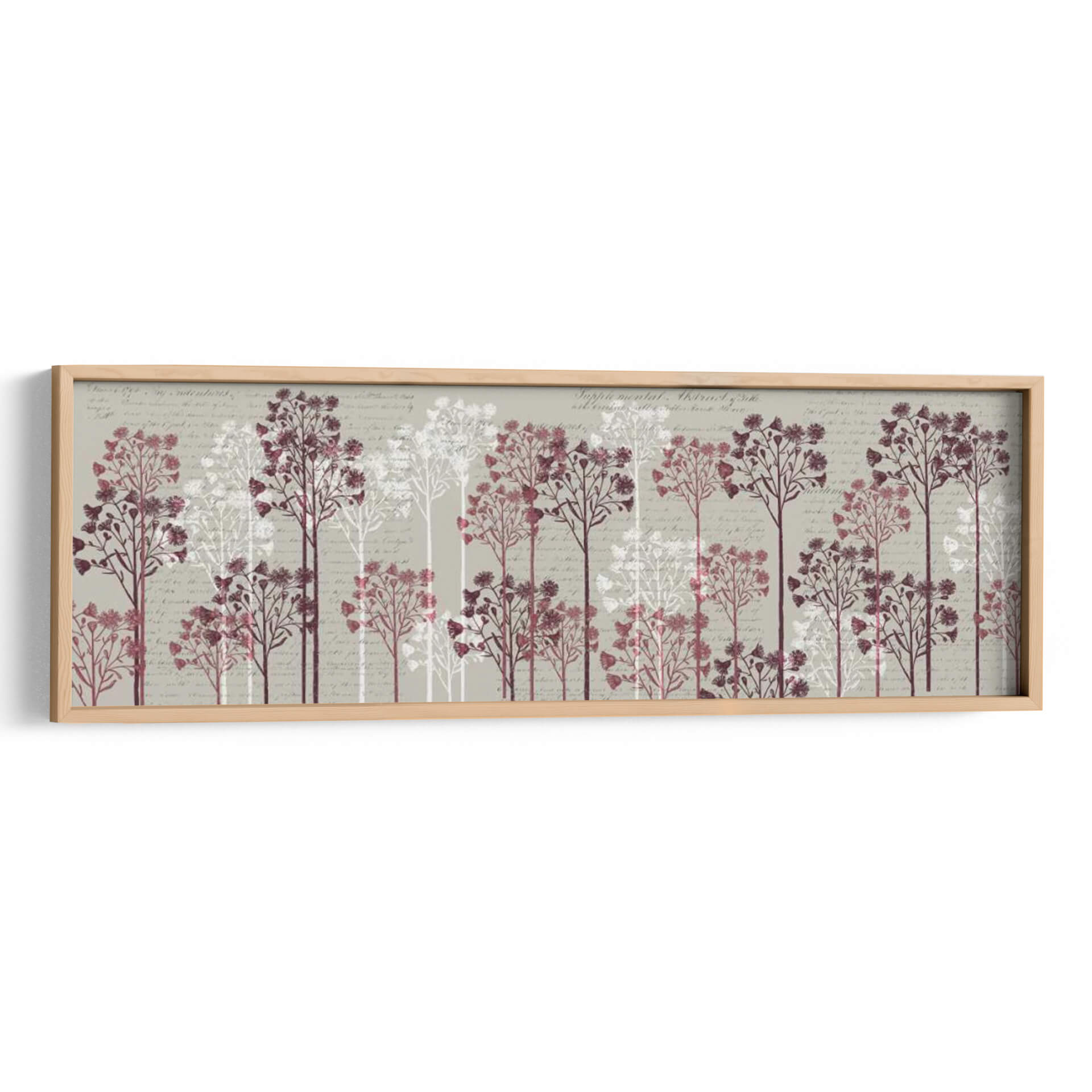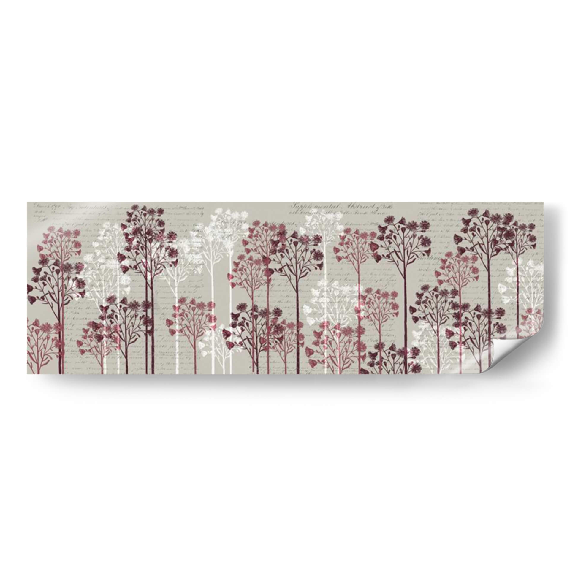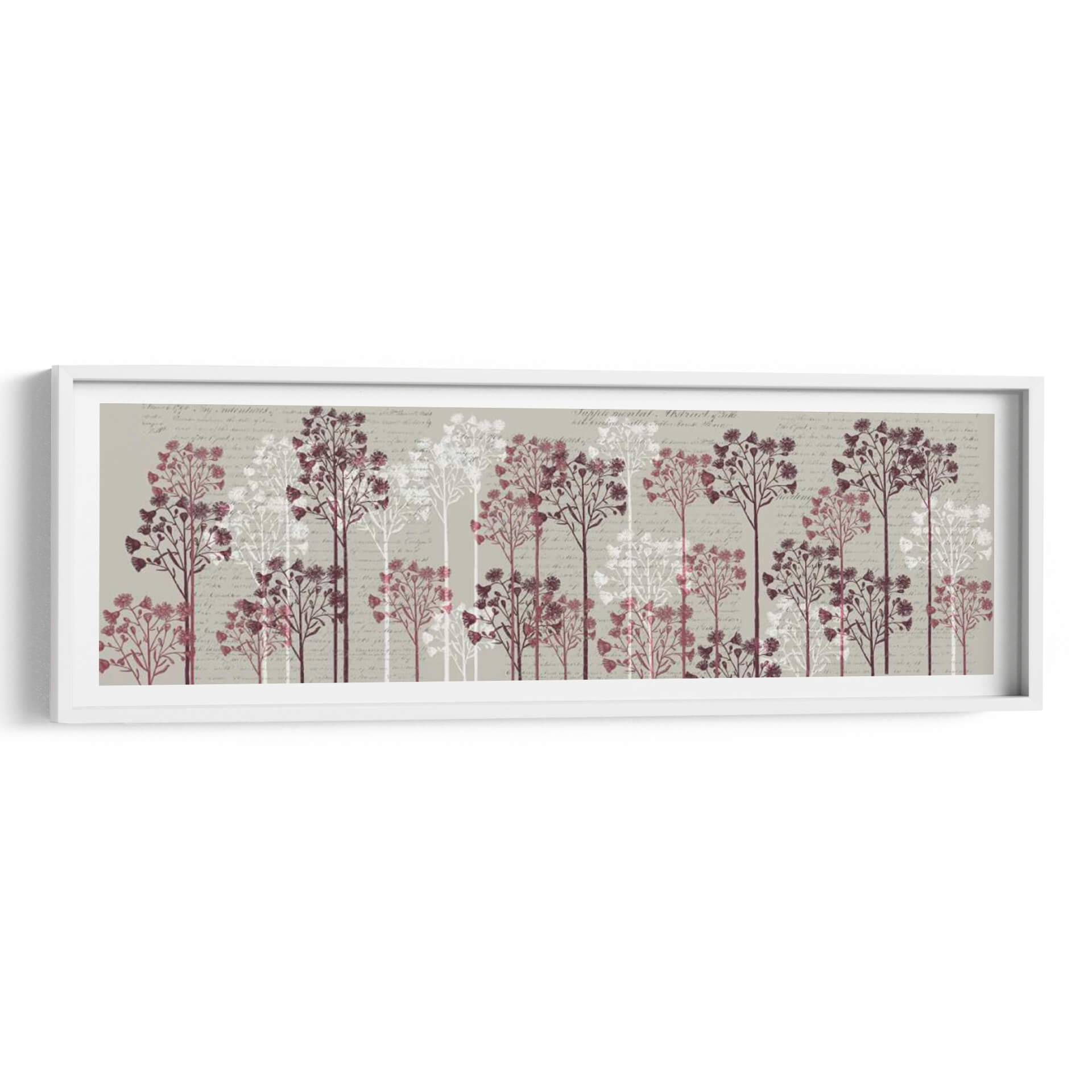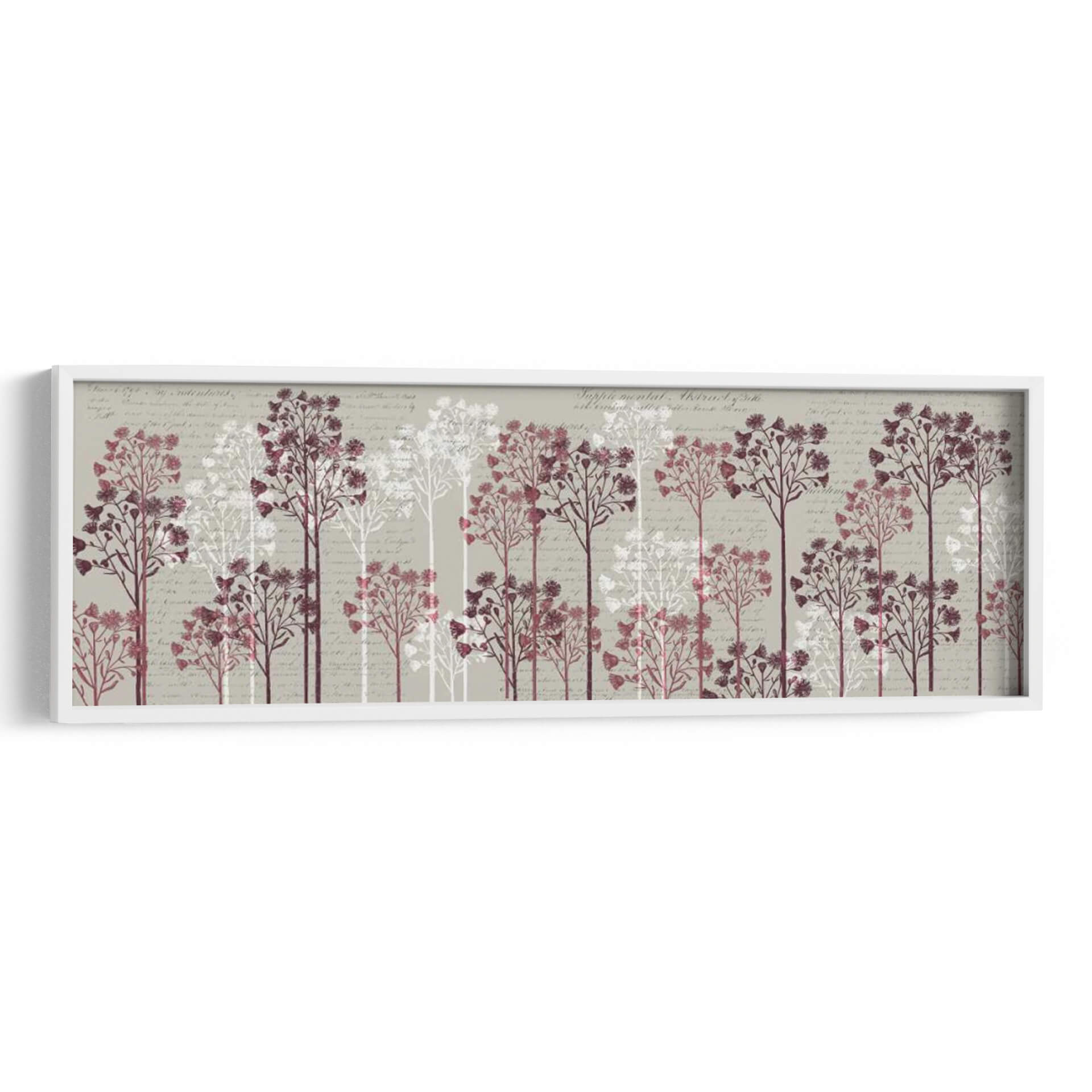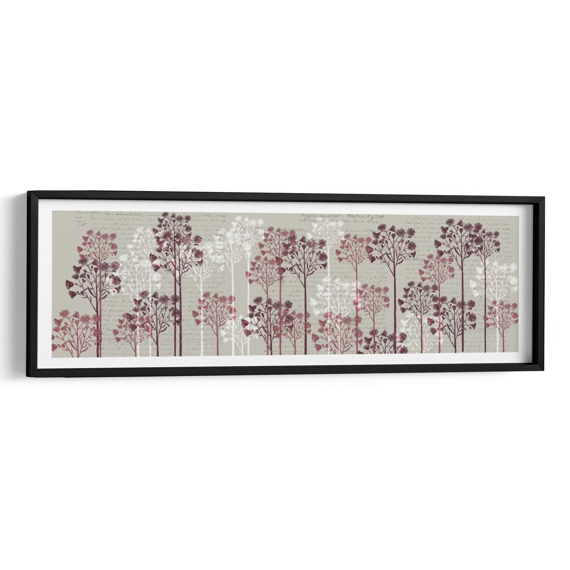 Sumérgete en la serenidad botánica con "Árboles Florales, Vino", una obra de arte que evoca la delicadeza de la naturaleza y la elegancia sutil. Este cuadro decorativo presenta una hilera de árboles estilizados, representados en tonos vino y blanco puro, que se alzan sobre un fondo texturizado con caligrafía antigua. Cada árbol, con sus ramas finas y copas repletas de pequeñas flores o semillas, crea una sensación de profundidad y movimiento pausado. La paleta de colores, dominada por grises neutros, burdeos profundos y blancos etéreos, aporta una atmósfera de calma y sofisticación. El estilo artístico combina elementos botánicos con un toque vintage, resultando en una pieza visualmente atractiva y atemporal. Ideal para añadir un punto de interés sereno y natural a tu salón, dormitorio o incluso a un espacio de oficina que busque un aire de tranquilidad y refinamiento. La composición horizontal, con la repetición rítmica de los árboles, guía la mirada y crea un efecto armonioso, perfecto para paredes amplias o pasillos. Transforma tu hogar en un santuario de paz y estilo con este exquisito cuadro decorativo que celebra la belleza efímera de las flores.