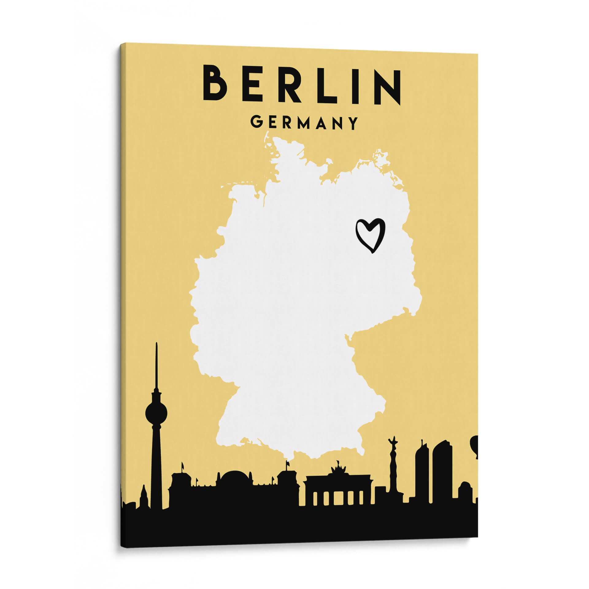 Celebra tu amor por la capital alemana con este cautivador cuadro decorativo de Berlín. La obra presenta un mapa estilizado de Alemania en un vibrante tono amarillo ocre, con el contorno de Berlín resaltado y un delicado corazón negro que marca su ubicación, simbolizando un punto de conexión emocional. La parte inferior de la pieza se adorna con una silueta detallada del icónico horizonte de Berlín, que incluye la Torre de Televisión y el Arco de Brandeburgo, capturando la esencia arquitectónica de la ciudad. Este diseño minimalista y gráfico, con un claro contraste entre el fondo amarillo, el mapa blanco y las siluetas negras, crea una pieza visualmente atractiva y moderna. Es ideal para infundir un toque de personalidad y un sentido de pertenencia a cualquier espacio, ya sea una sala de estar contemporánea, una oficina con inspiración urbana o incluso un dormitorio acogedor. Este cuadro decorativo de Berlín no es solo una pieza de arte, sino una declaración de afecto por una ciudad llena de historia, cultura y energía vibrante, perfecta para aquellos que han vivido, soñado o se han enamorado de Berlín.