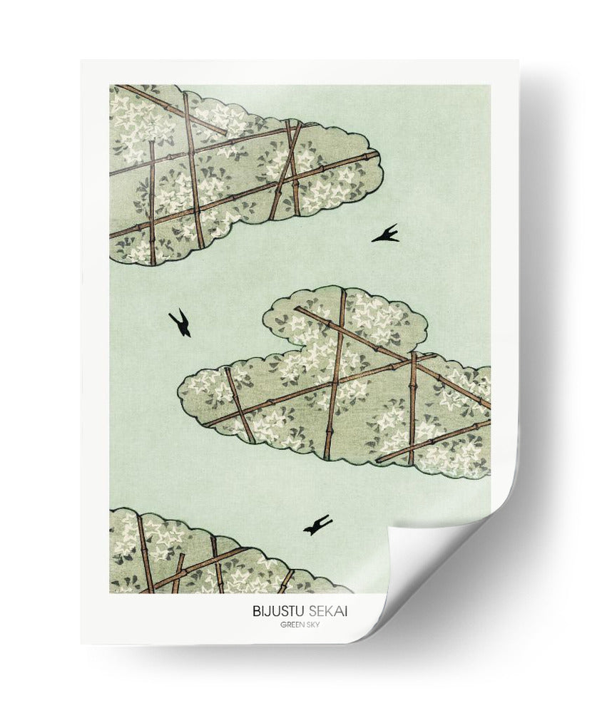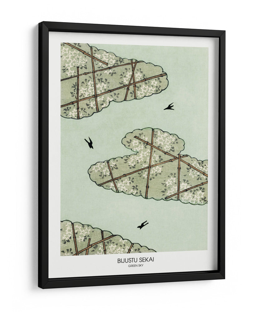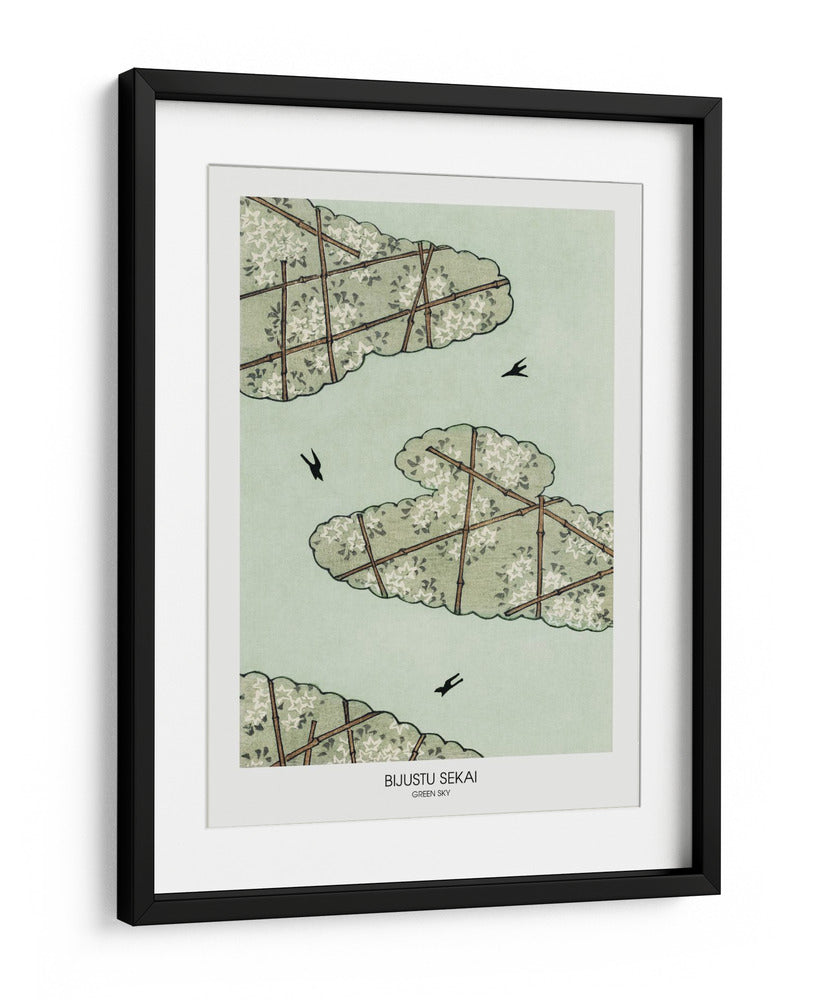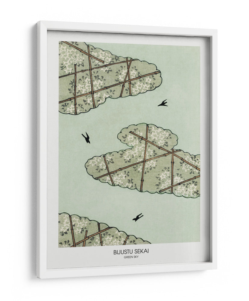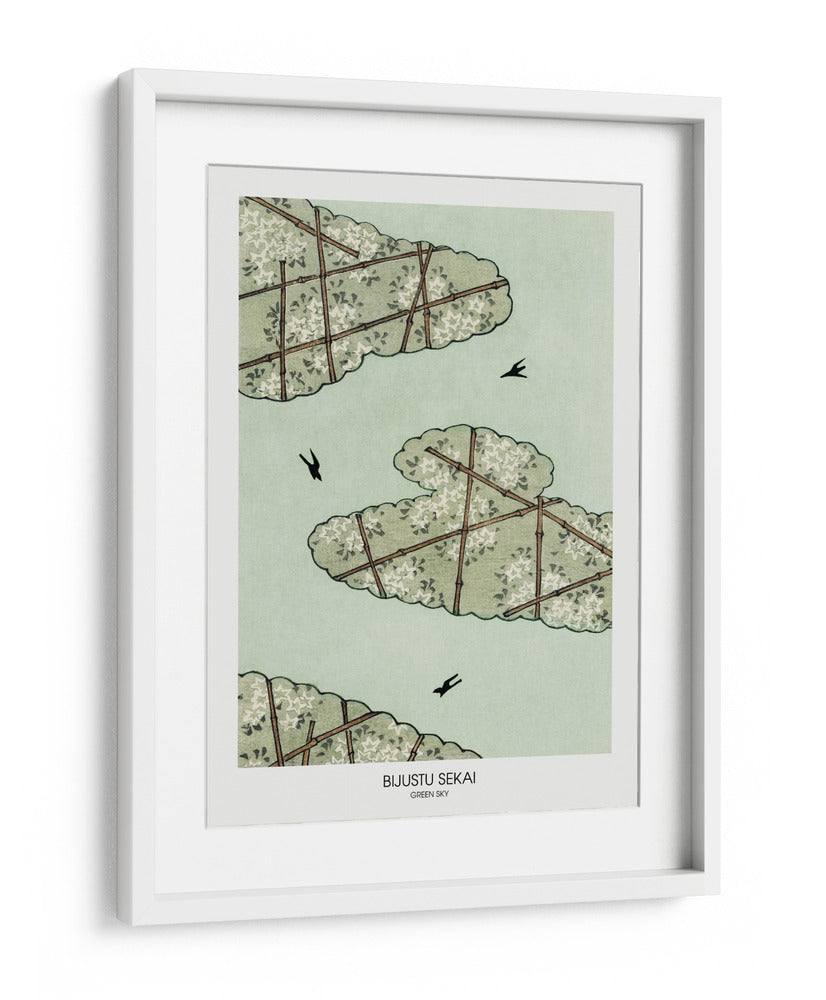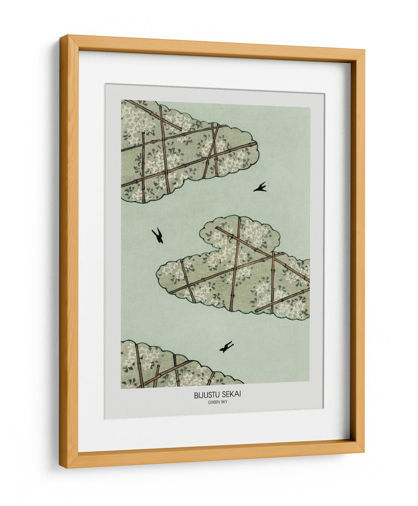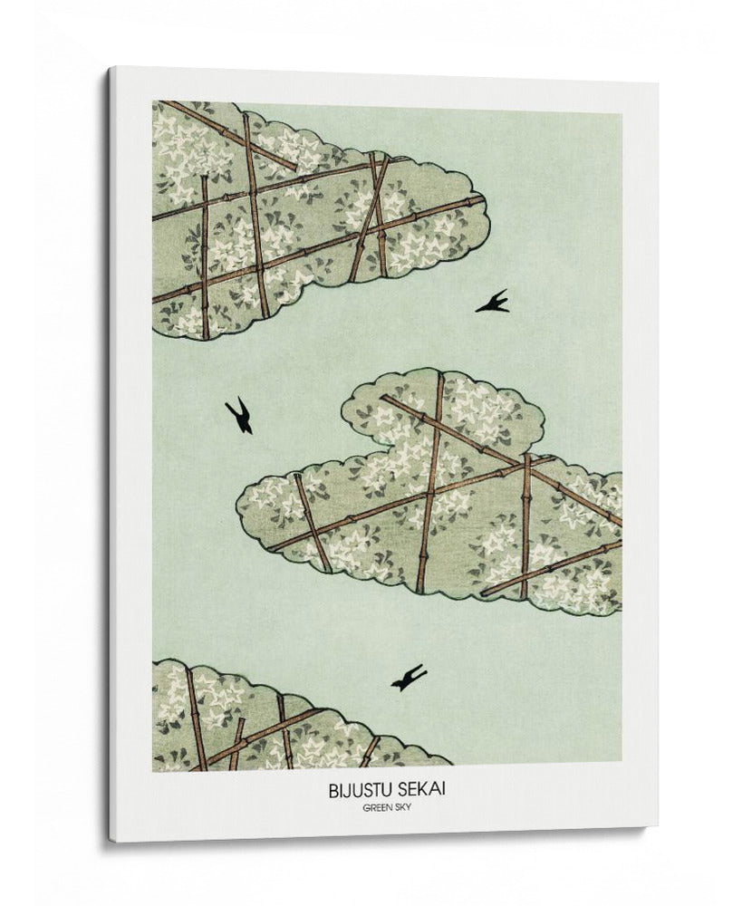 Sumérgete en la serena belleza de "Cielo Verde", una obra de arte contemporáneo que evoca la tranquilidad de la naturaleza y la delicadeza de la vida aviar. Este cuadro decorativo presenta un cielo de un suave tono verdoso, salpicado por nubes etéreas que parecen flotar suavemente. Las nubes están sutilmente adornadas con delicadas flores blancas, entrelazadas con estructuras de bambú que aportan un toque orgánico y zen. Tres pequeñas siluetas de pájaros en pleno vuelo cruzan el firmamento, añadiendo una sensación de movimiento y libertad a la composición. La paleta de colores, dominada por verdes pálidos y acentos de blanco y marrón claro del bambú, crea una atmósfera de calma y armonía. Este estilo, que recuerda al arte japonés tradicional Ukiyo-e pero con un giro moderno, hace de "Cielo Verde" una pieza versátil, ideal para cualquier espacio que busque un aire de sofisticación natural y serenidad. Es perfecto para dar un toque de paz a tu dormitorio, un acento relajante en tu oficina o un punto de inspiración en tu sala de estar. Un cuadro decorativo que invita a la contemplación y al bienestar.