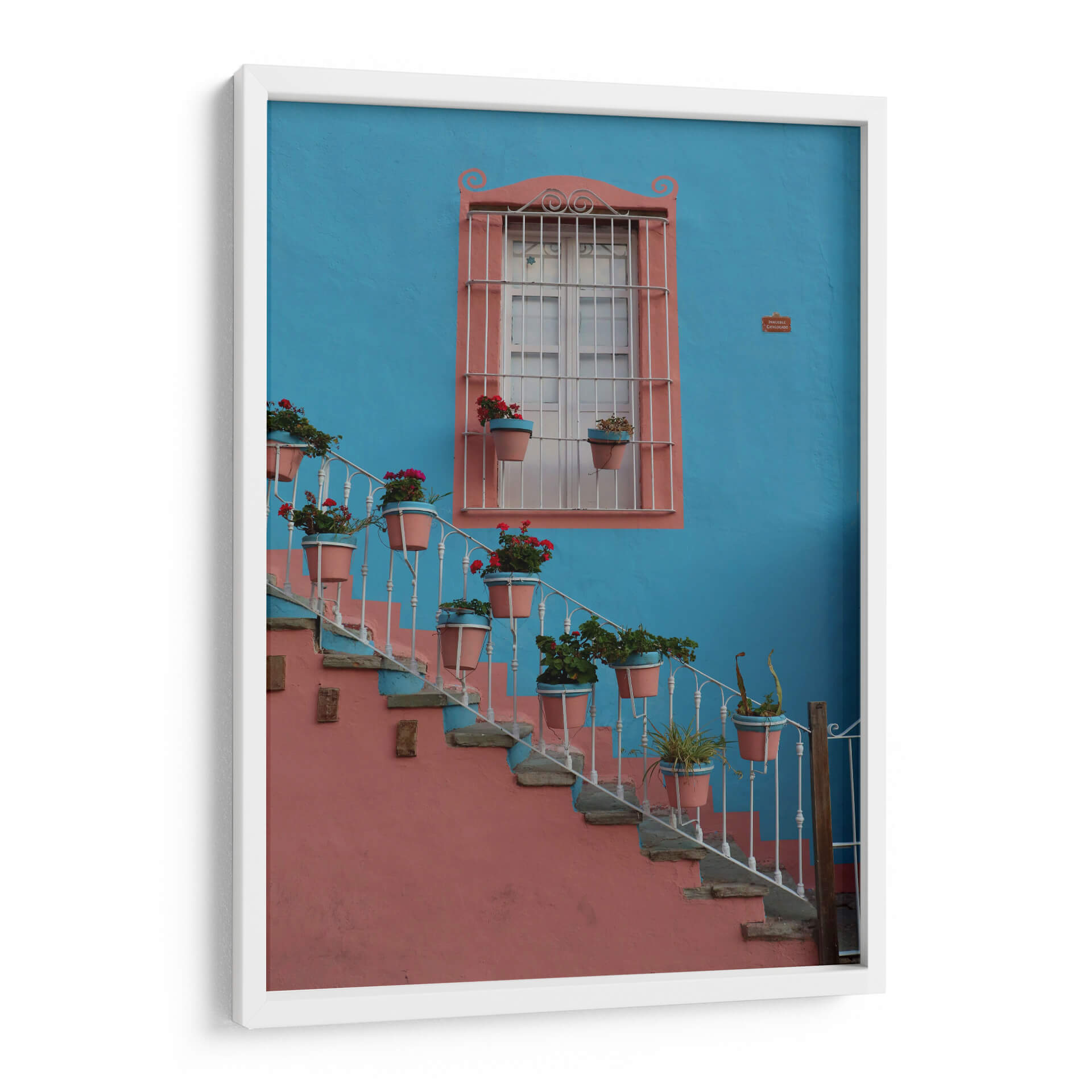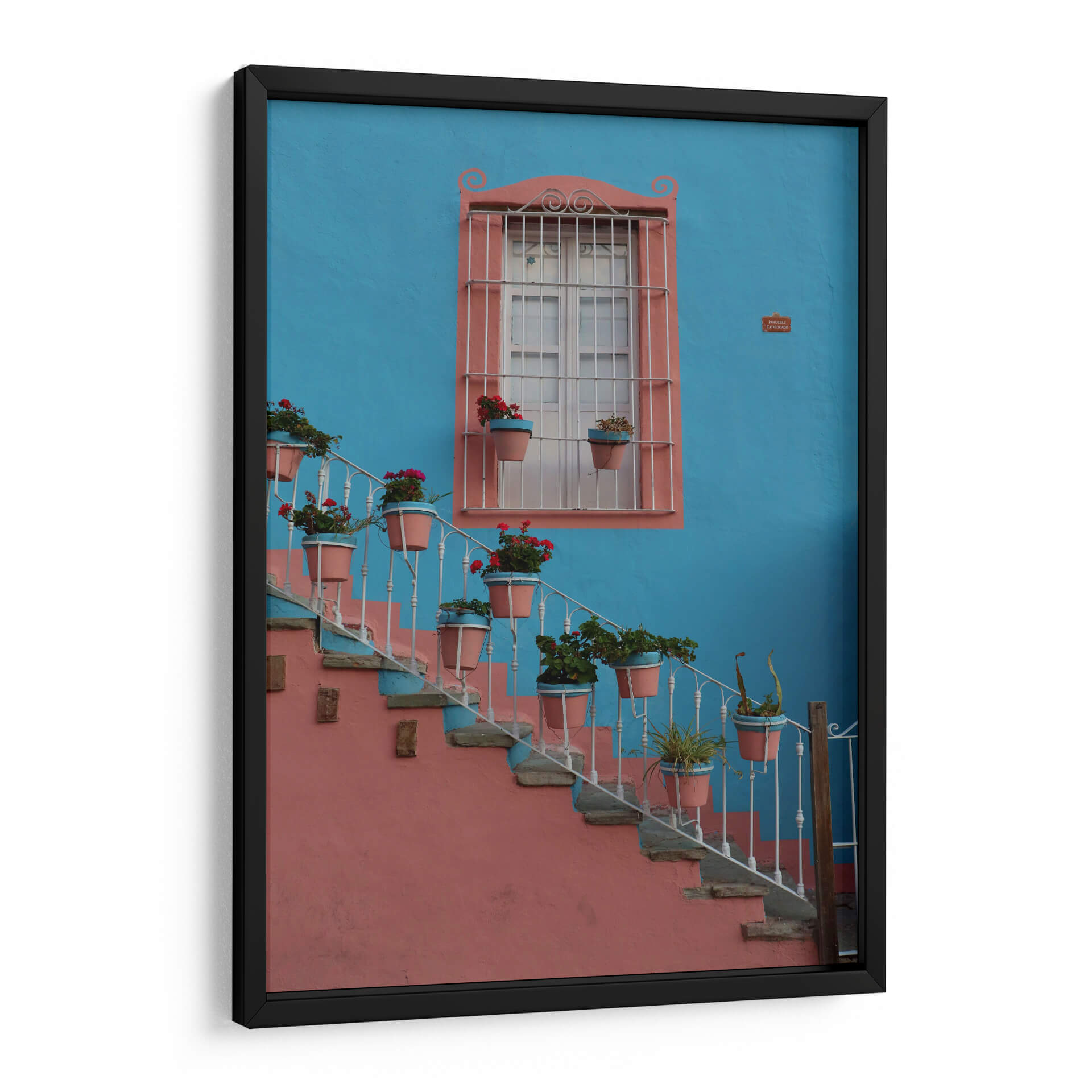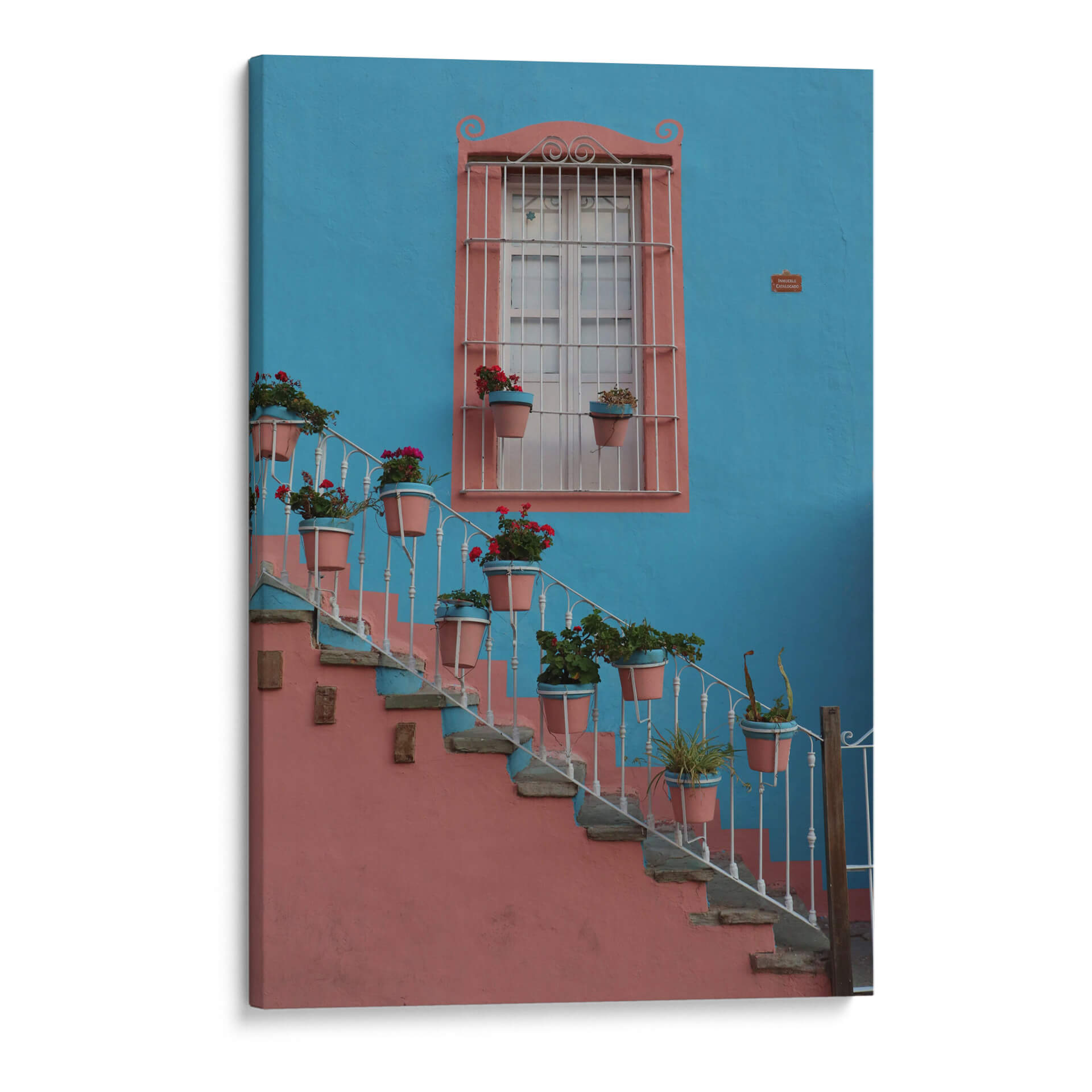 Sumérgete en la vibrante atmósfera de Guanajuato con este cautivador cuadro decorativo, 'Ventana Colorida en Guanajuato', del artista Luis Rodrigo Magaña Andrade. Esta obra captura la esencia de un rincón pintoresco, donde una imponente pared de un azul cerúleo intenso sirve de telón de fondo para una encantadora ventana enmarcada en un cálido tono salmón. La arquitectura se embellece con una escalera de caracol adornada con macetas que desbordan flores rojas y verdes, aportando un estallido de vida y color a la escena. La barandilla blanca, con sus elegantes volutas, contrasta delicadamente con la robustez de la pared y la piedra de los escalones, creando una composición visualmente rica y armoniosa. La luz parece jugar sobre las texturas, invitando a imaginar la brisa y el sol de México. Este cuadro es ideal para añadir un toque de alegría y calidez mediterránea o latinoamericana a cualquier espacio, ya sea una sala de estar, un recibidor o un estudio. Su paleta de colores contrastantes y su temática evocadora lo convierten en un punto focal que atrae miradas y fomenta conversaciones, transportando a quien lo observa a un lugar de belleza arquitectónica y naturaleza exuberante. Una pieza que celebra la vida y el color, perfecta para quienes buscan infundir energía y carácter en su decoración.