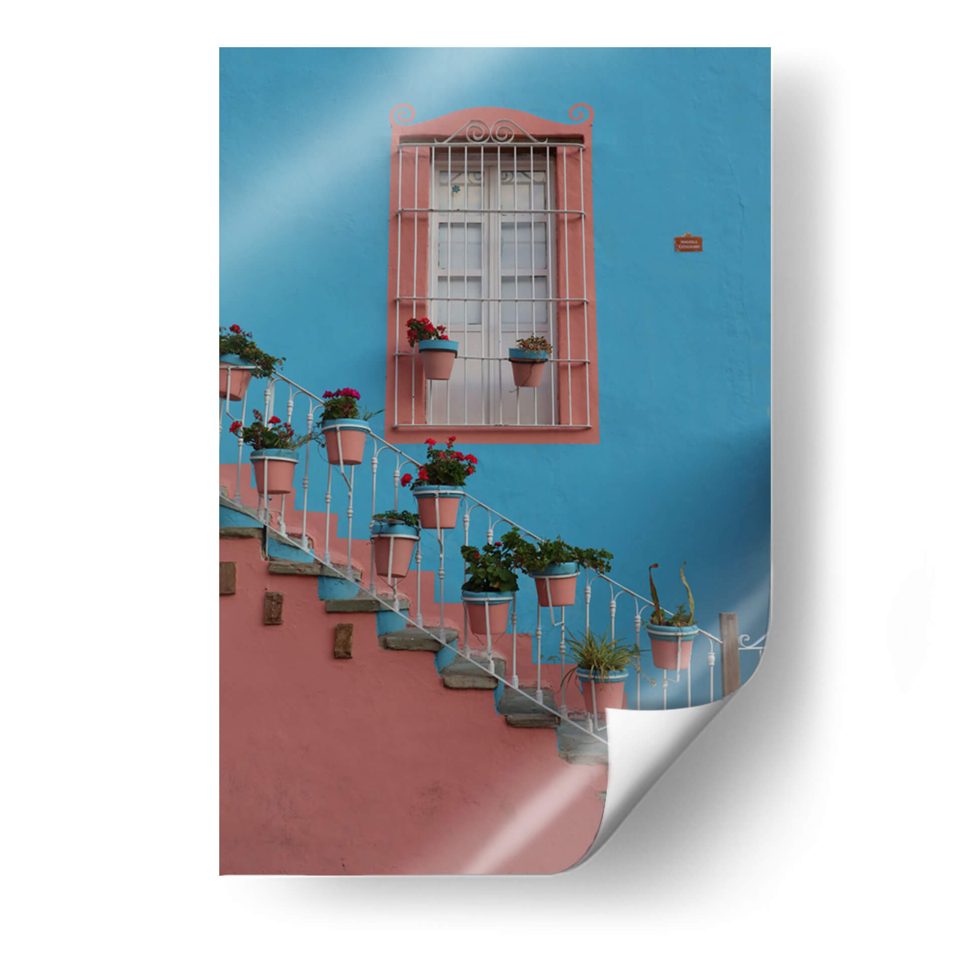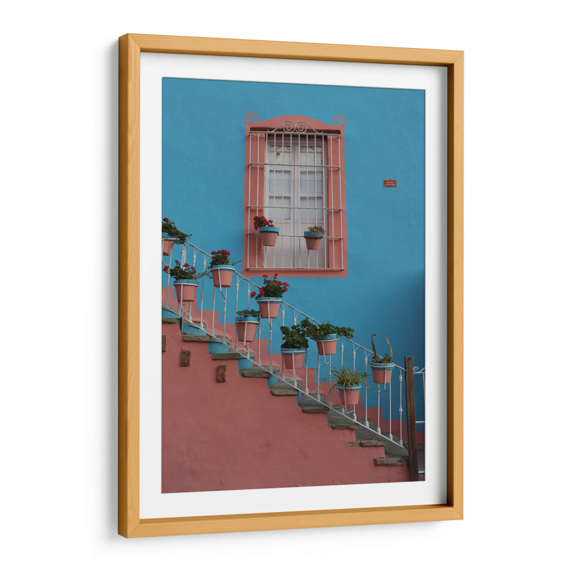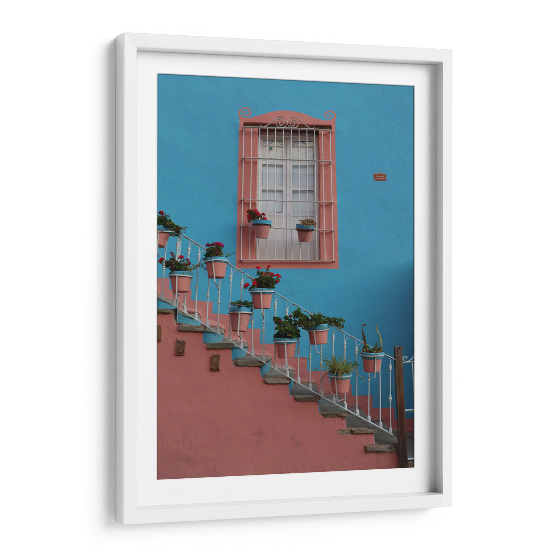 Sumérgete en la vibrante atmósfera de Guanajuato con este cautivador cuadro decorativo, 'Ventana Colorida en Guanajuato', del artista Luis Rodrigo Magaña Andrade. Esta obra captura la esencia de un rincón pintoresco, donde una imponente pared de un azul cerúleo intenso sirve de telón de fondo para una encantadora ventana enmarcada en un cálido tono salmón. La arquitectura se embellece con una escalera de caracol adornada con macetas que desbordan flores rojas y verdes, aportando un estallido de vida y color a la escena. La barandilla blanca, con sus elegantes volutas, contrasta delicadamente con la robustez de la pared y la piedra de los escalones, creando una composición visualmente rica y armoniosa. La luz parece jugar sobre las texturas, invitando a imaginar la brisa y el sol de México. Este cuadro es ideal para añadir un toque de alegría y calidez mediterránea o latinoamericana a cualquier espacio, ya sea una sala de estar, un recibidor o un estudio. Su paleta de colores contrastantes y su temática evocadora lo convierten en un punto focal que atrae miradas y fomenta conversaciones, transportando a quien lo observa a un lugar de belleza arquitectónica y naturaleza exuberante. Una pieza que celebra la vida y el color, perfecta para quienes buscan infundir energía y carácter en su decoración.