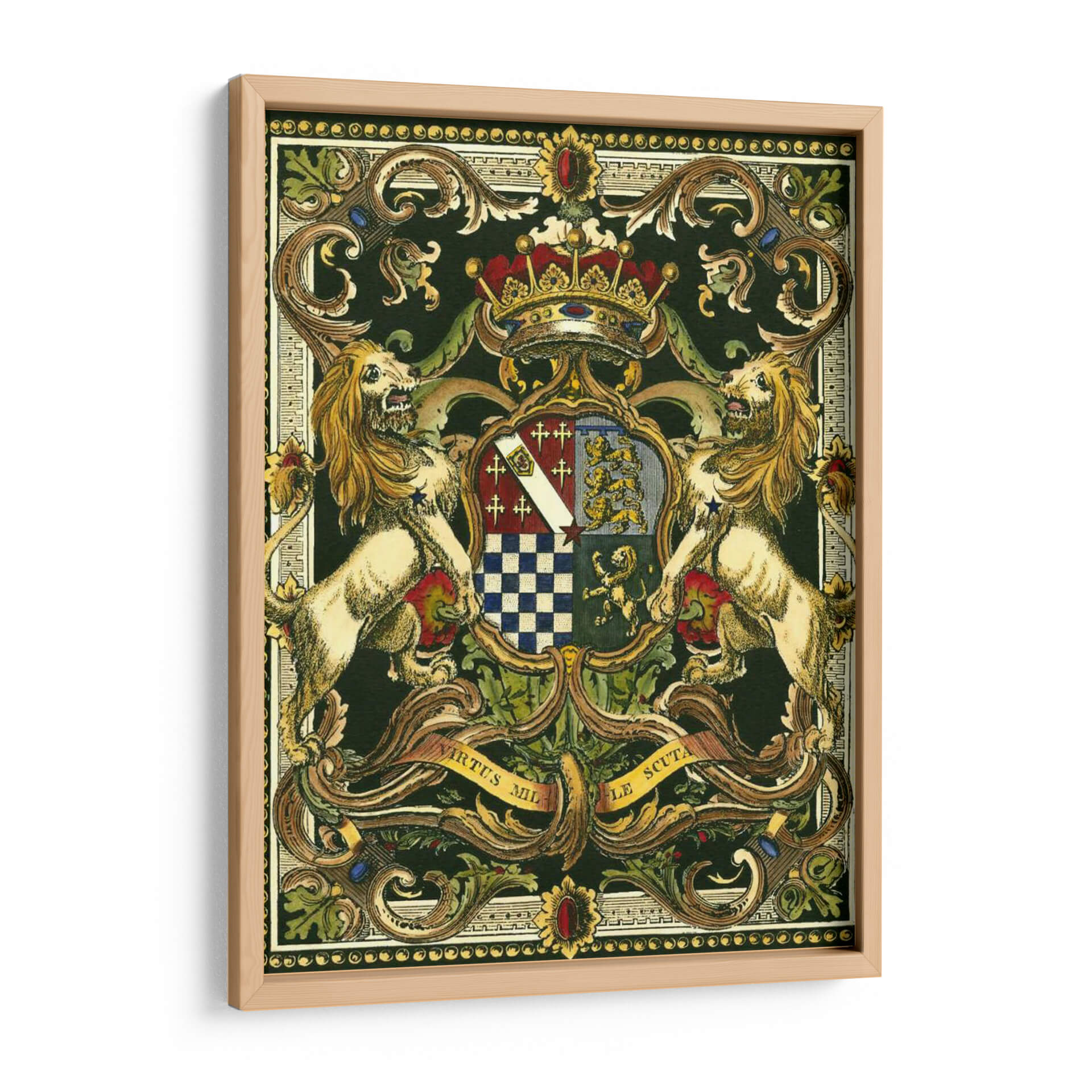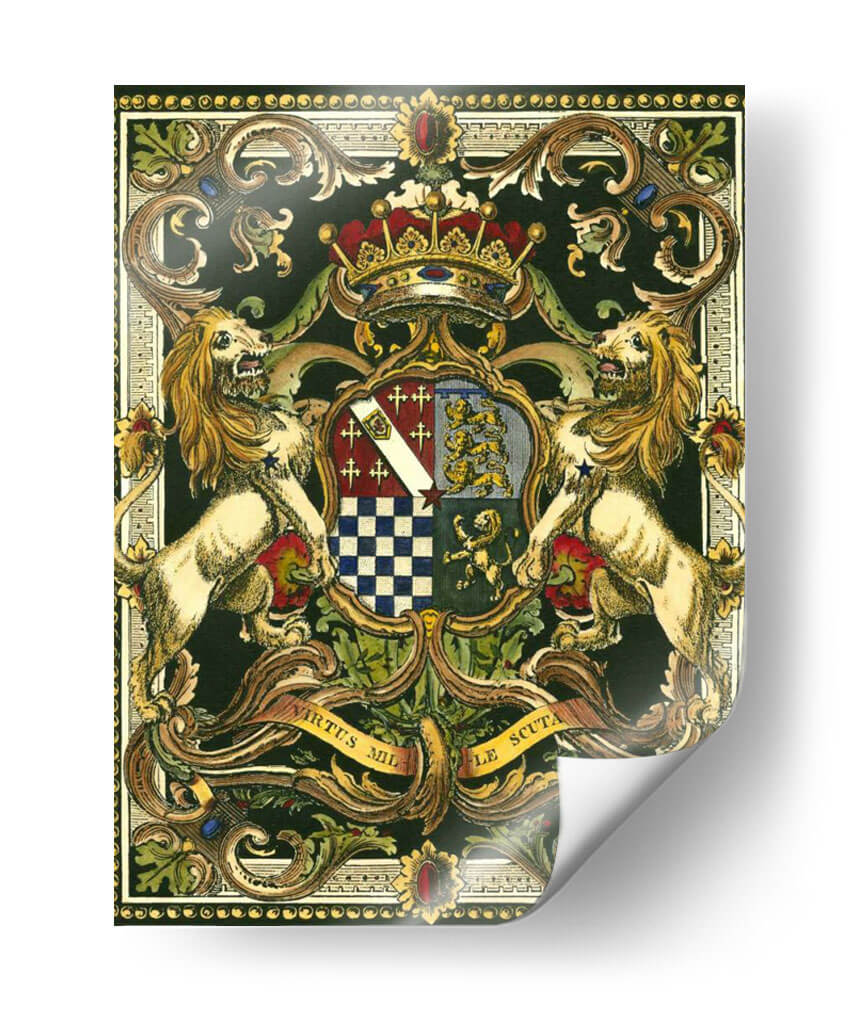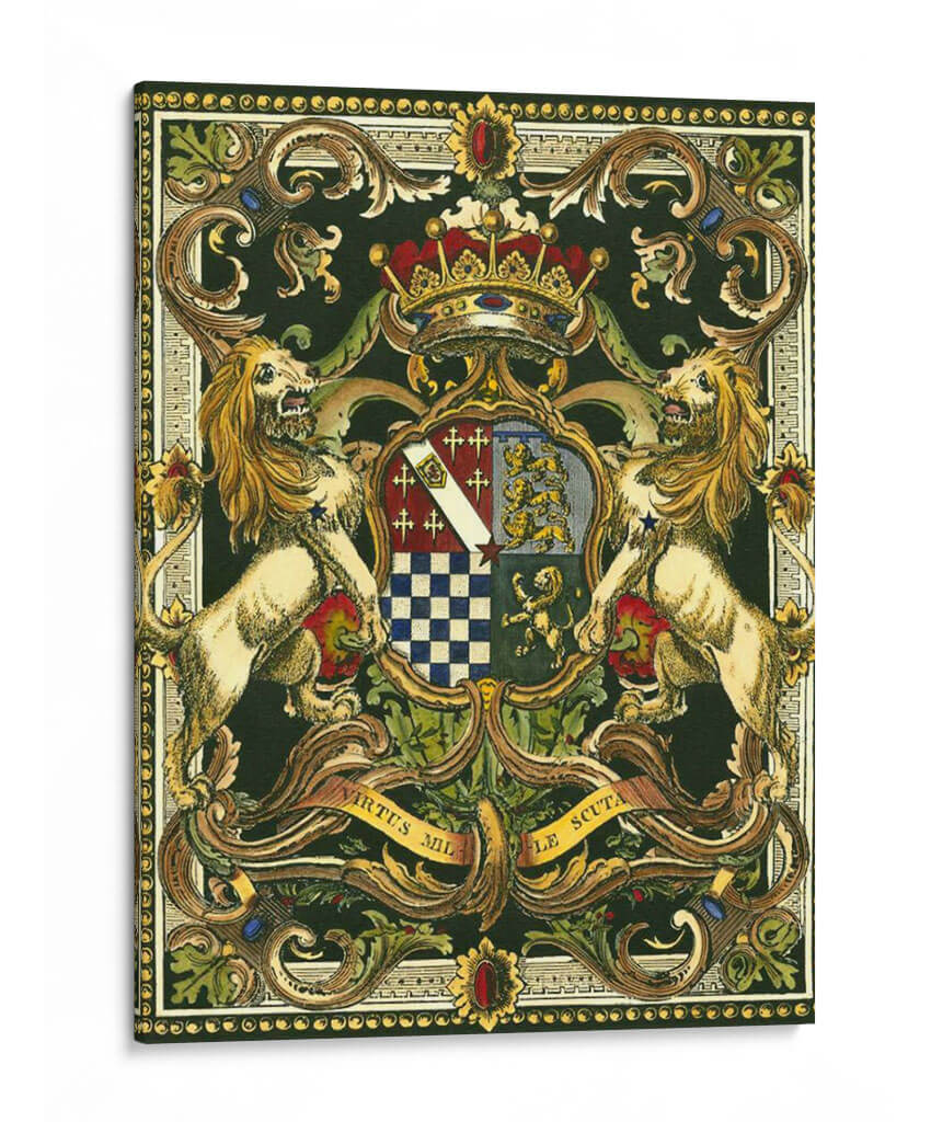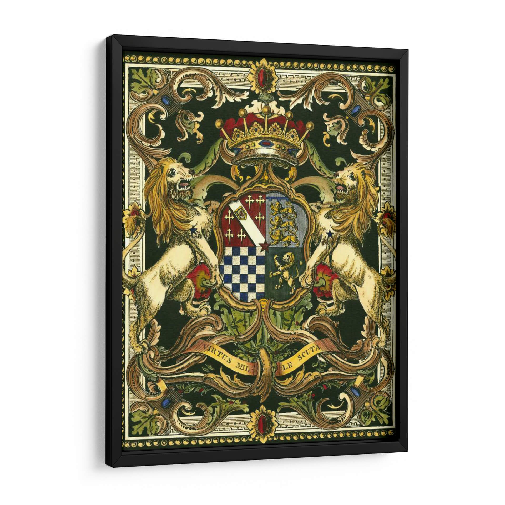 Sumérgete en la majestuosidad y el legado histórico con "Cresta En Negro II", una obra de arte que evoca poder y tradición. Este cuadro decorativo presenta un intrincado diseño heráldico, coronado por un escudo de armas ricamente detallado, flanqueado por dos leones dorados rampantes que transmiten fuerza y nobleza. La paleta de colores, dominada por profundos verdes, negros y acentos dorados y rojos, crea una atmósfera de sofisticación y autoridad. Los motivos ornamentales barrocos, con sus volutas y detalles dorados, enmarcan el escudo de manera teatral, añadiendo una capa de opulencia y detalle. La presencia de inscripciones latinas como "VIRTUS MIL" y "LE SCUTA" en cintas doradas, sugiere un origen nobiliario o una celebración de virtudes y escudos protectores, invitando a la reflexión sobre la historia y el linaje. Ideal para espacios que buscan un toque de distinción y carácter, como estudios privados, bibliotecas, despachos ejecutivos o salas de estar que apuestan por una decoración con personalidad y un aire de antigüedad renovada. "Cresta En Negro II" no es solo una pieza decorativa, sino una declaración de estilo que combina la elegancia atemporal con un impacto visual innegable, transformando cualquier pared en un punto focal de conversación y admiración. Añade un toque de realeza y herencia a tu hogar u oficina con este impresionante cuadro decorativo.