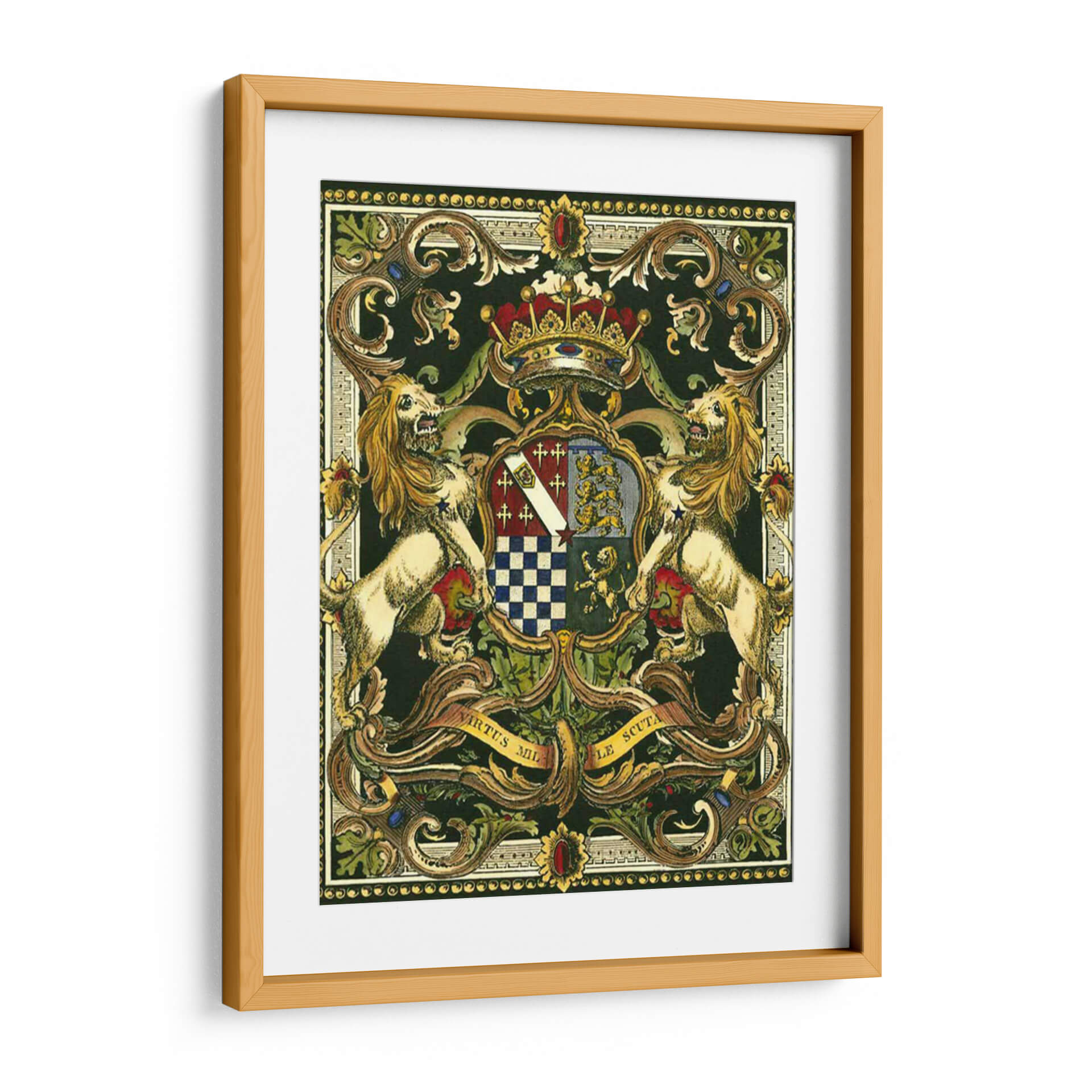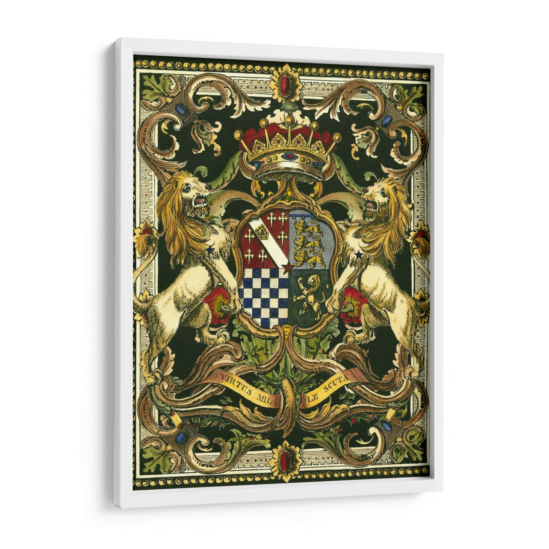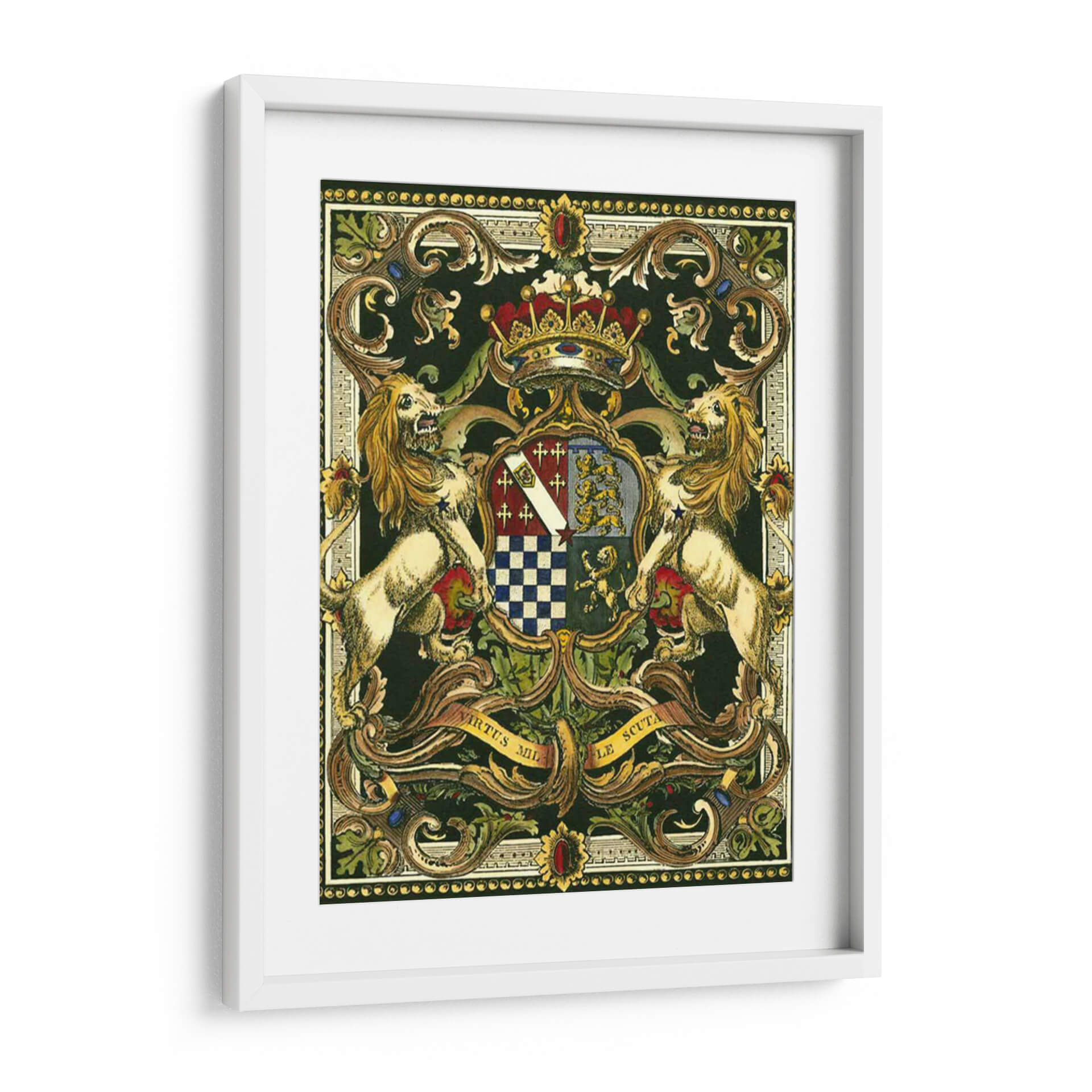 Sumérgete en la majestuosidad y el legado histórico con "Cresta En Negro II", una obra de arte que evoca poder y tradición. Este cuadro decorativo presenta un intrincado diseño heráldico, coronado por un escudo de armas ricamente detallado, flanqueado por dos leones dorados rampantes que transmiten fuerza y nobleza. La paleta de colores, dominada por profundos verdes, negros y acentos dorados y rojos, crea una atmósfera de sofisticación y autoridad. Los motivos ornamentales barrocos, con sus volutas y detalles dorados, enmarcan el escudo de manera teatral, añadiendo una capa de opulencia y detalle. La presencia de inscripciones latinas como "VIRTUS MIL" y "LE SCUTA" en cintas doradas, sugiere un origen nobiliario o una celebración de virtudes y escudos protectores, invitando a la reflexión sobre la historia y el linaje. Ideal para espacios que buscan un toque de distinción y carácter, como estudios privados, bibliotecas, despachos ejecutivos o salas de estar que apuestan por una decoración con personalidad y un aire de antigüedad renovada. "Cresta En Negro II" no es solo una pieza decorativa, sino una declaración de estilo que combina la elegancia atemporal con un impacto visual innegable, transformando cualquier pared en un punto focal de conversación y admiración. Añade un toque de realeza y herencia a tu hogar u oficina con este impresionante cuadro decorativo.