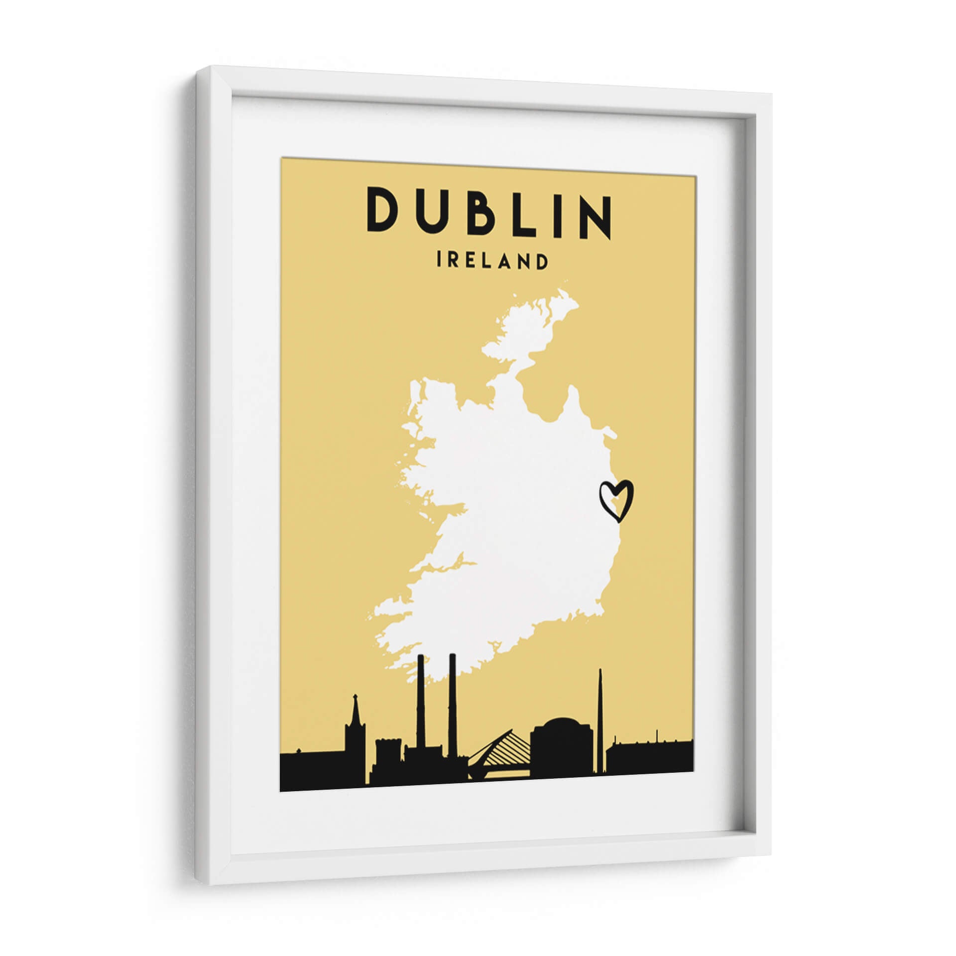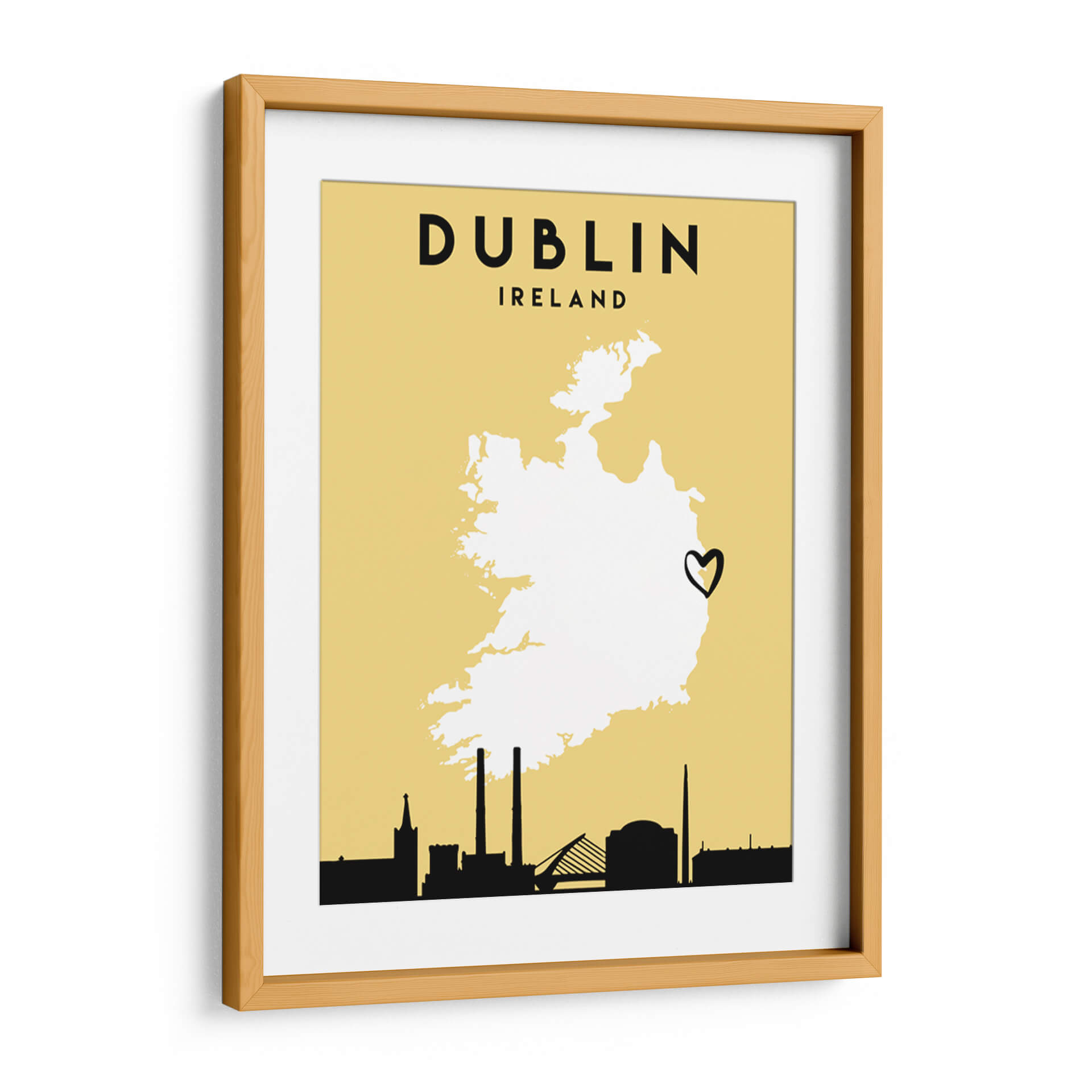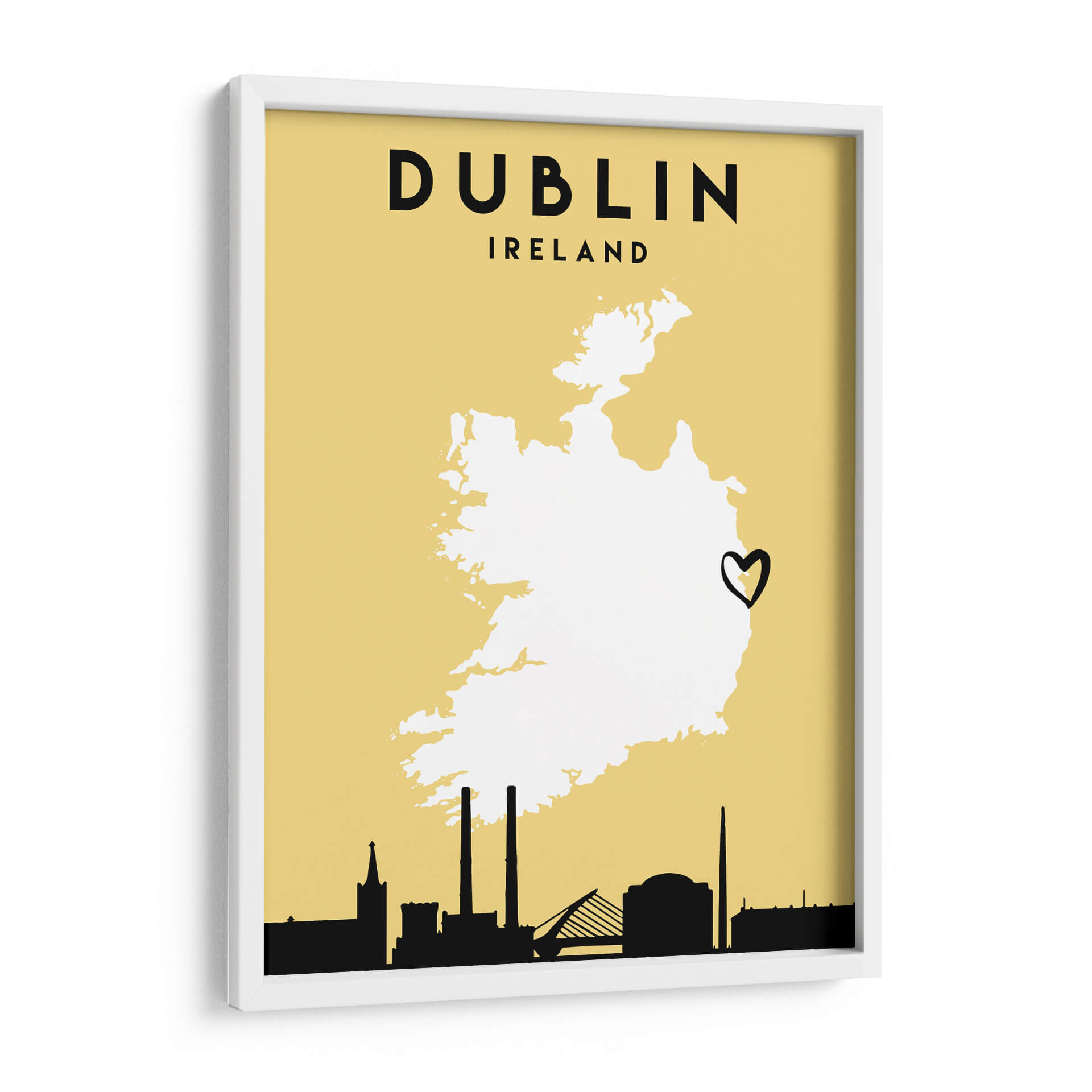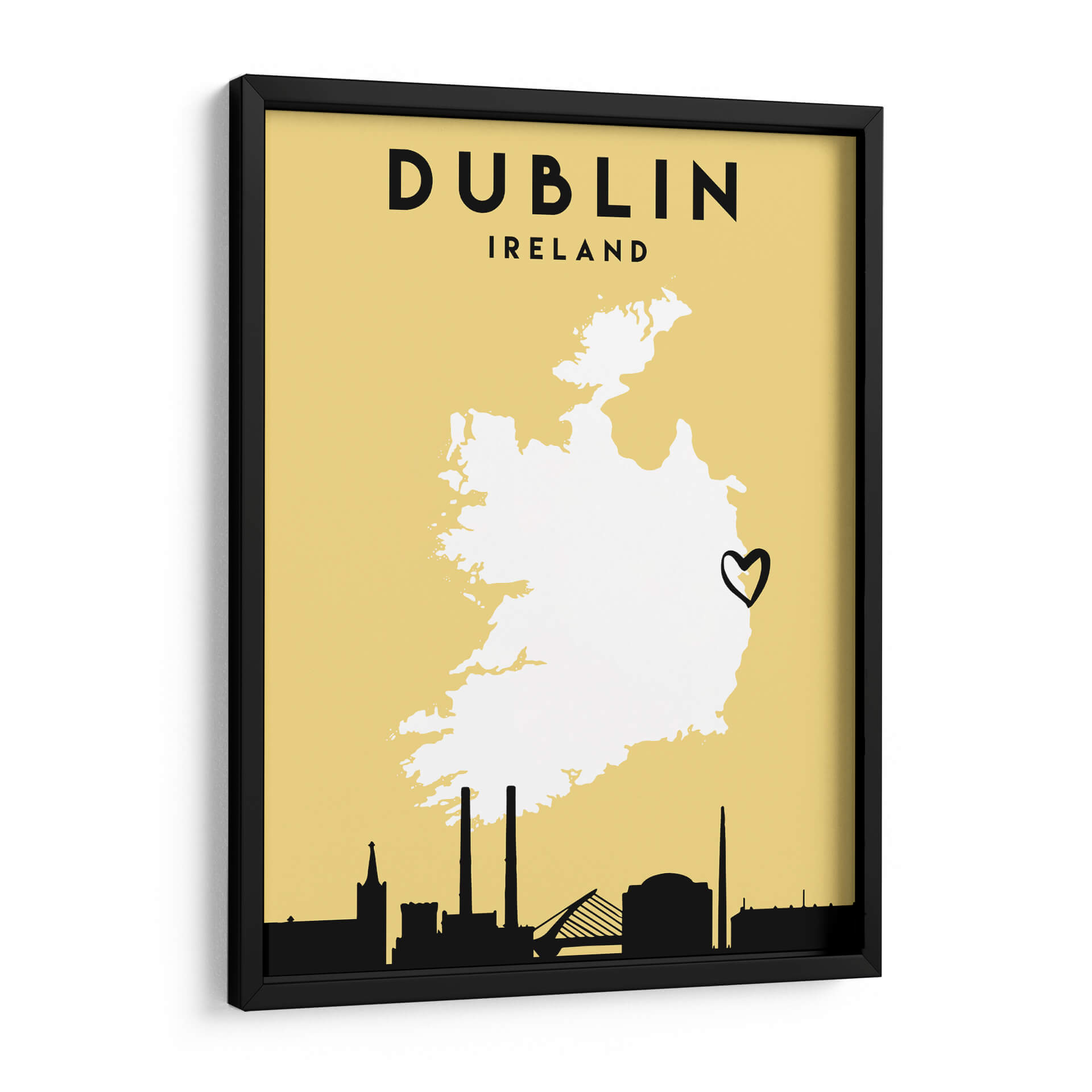 Celebra el espíritu de Irlanda con este cautivador cuadro decorativo de "Dublin - Mapas de amor de la ciudad 28". La obra presenta una silueta estilizada de Irlanda sobre un fondo amarillo cálido y vibrante, con el nombre "DUBLIN" y "IRELAND" en una tipografía audaz y moderna. Un corazón dibujado a mano, posicionado sobre el mapa, añade un toque personal y romántico, simbolizando un profundo afecto por la capital irlandesa. La línea del horizonte de Dublín, representada en negro sólido en la parte inferior, incluye monumentos icónicos como la torre de la Iglesia de San Patricio, las chimeneas de la planta de Poolbeg y el Puente Samuel Beckett, anclando la pieza en su contexto geográfico y cultural. Este diseño minimalista y gráfico es ideal para quienes buscan una decoración de pared que sea a la vez sofisticada y llena de significado personal. Aporta un toque de personalidad y un recordatorio de viajes o aspiraciones a cualquier habitación, desde salas de estar y oficinas hasta dormitorios o vestíbulos. La paleta de colores, aunque sencilla, es impactante, con el amarillo evocando calidez y optimismo, y el contraste nítido del negro y el blanco aportando claridad y estilo. "Dublin - Mapas de amor de la ciudad 28" es más que un simple mapa; es una declaración de amor por una ciudad vibrante y su gente, un recordatorio visual de experiencias compartidas y sueños por cumplir. Añade esta pieza única a tu colección y deja que la esencia de Dublín ilumine tu espacio, creando un ambiente acogedor y lleno de carácter.