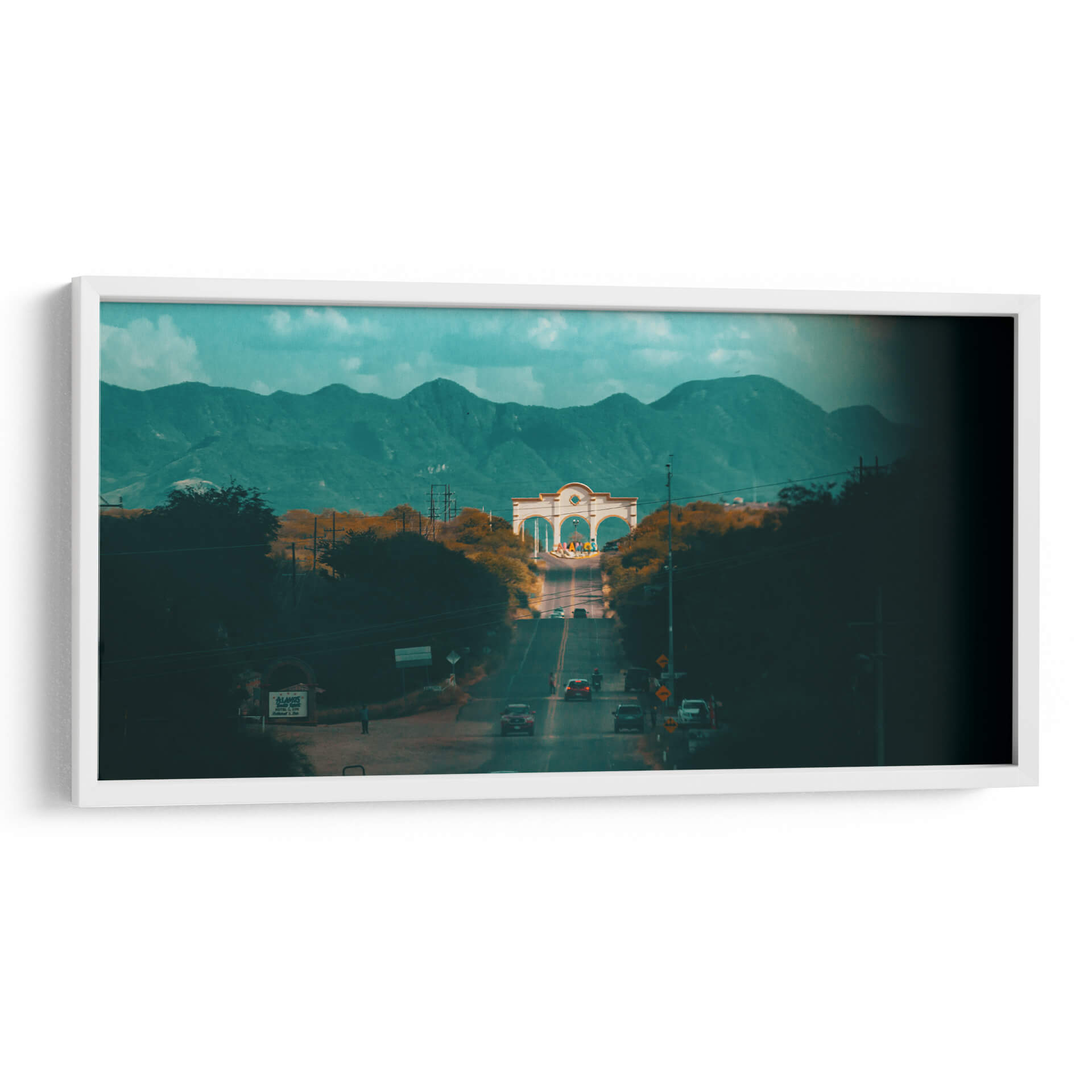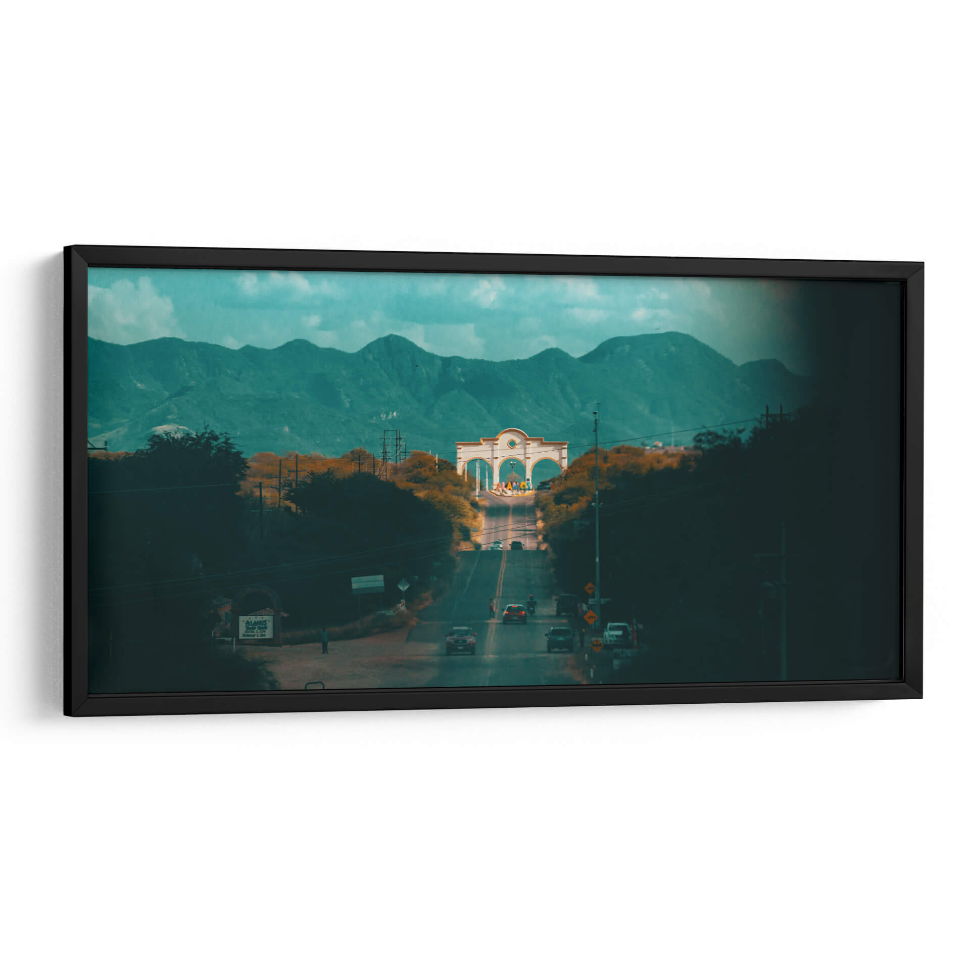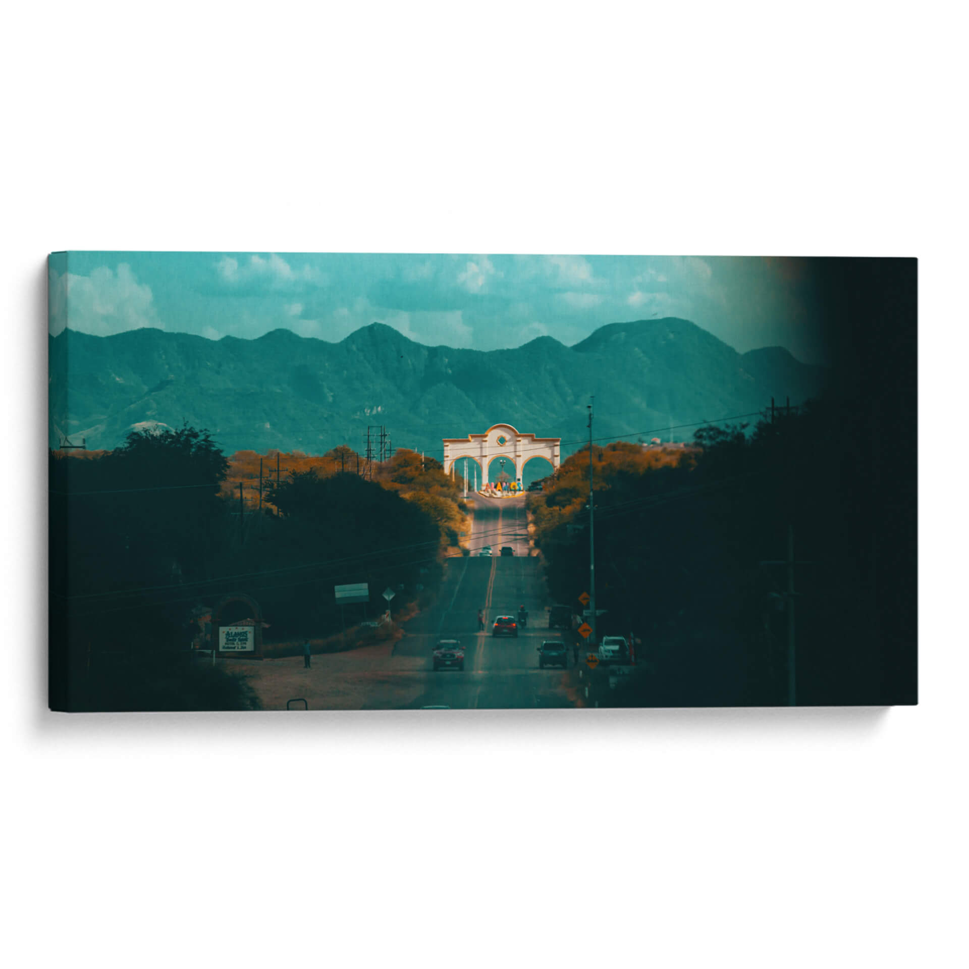 Sumérgete en la evocadora escena de 'En Camino', una obra de arte que captura la esencia de un viaje hacia un destino prometedor. Esta pieza visual transporta al espectador a una carretera que serpentea entre exuberante vegetación y se dirige hacia un icónico arco arquitectónico, con majestuosas montañas como telón de fondo. Los tonos teal profundos y los verdes oscuros de la vegetación y las montañas contrastan sutilmente con los colores más cálidos y la iluminación del arco, creando una atmósfera de misterio y anticipación. La presencia de vehículos en la carretera añade una sensación de movimiento y dinamismo, sugiriendo el continuo fluir de la vida y el progreso. El estilo fotográfico con un toque de cine, realzado por una paleta de colores estilizada, confiere a esta obra un carácter moderno y cautivador. Es el cuadro decorativo perfecto para inspirar reflexión sobre los caminos recorridos y los que están por venir, ideal para salones, estudios u oficinas donde se busque un punto focal que invite a la contemplación y al diálogo. Transforma tu espacio con esta representación visual del viaje y la esperanza, un lienzo que habla de movimiento y destino.