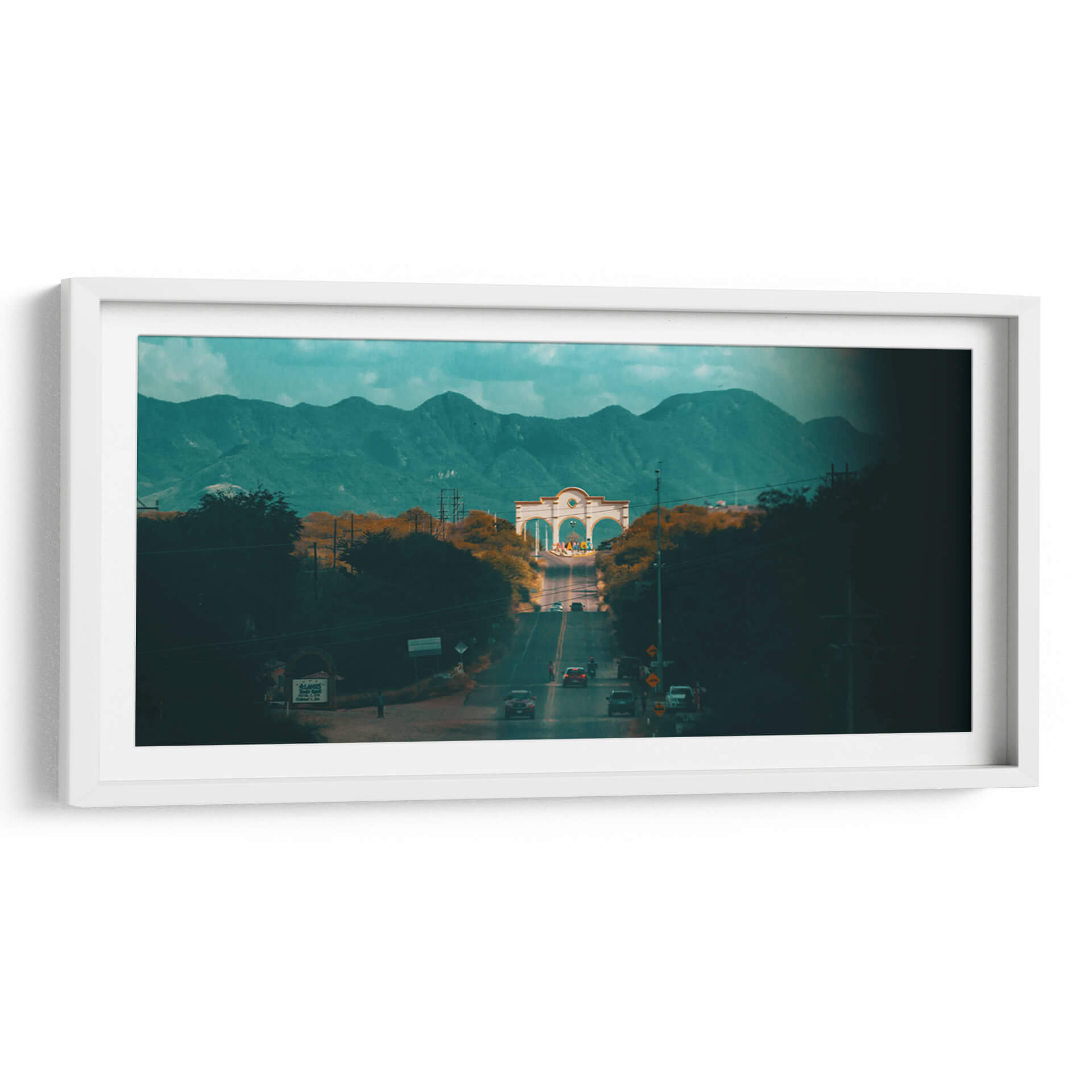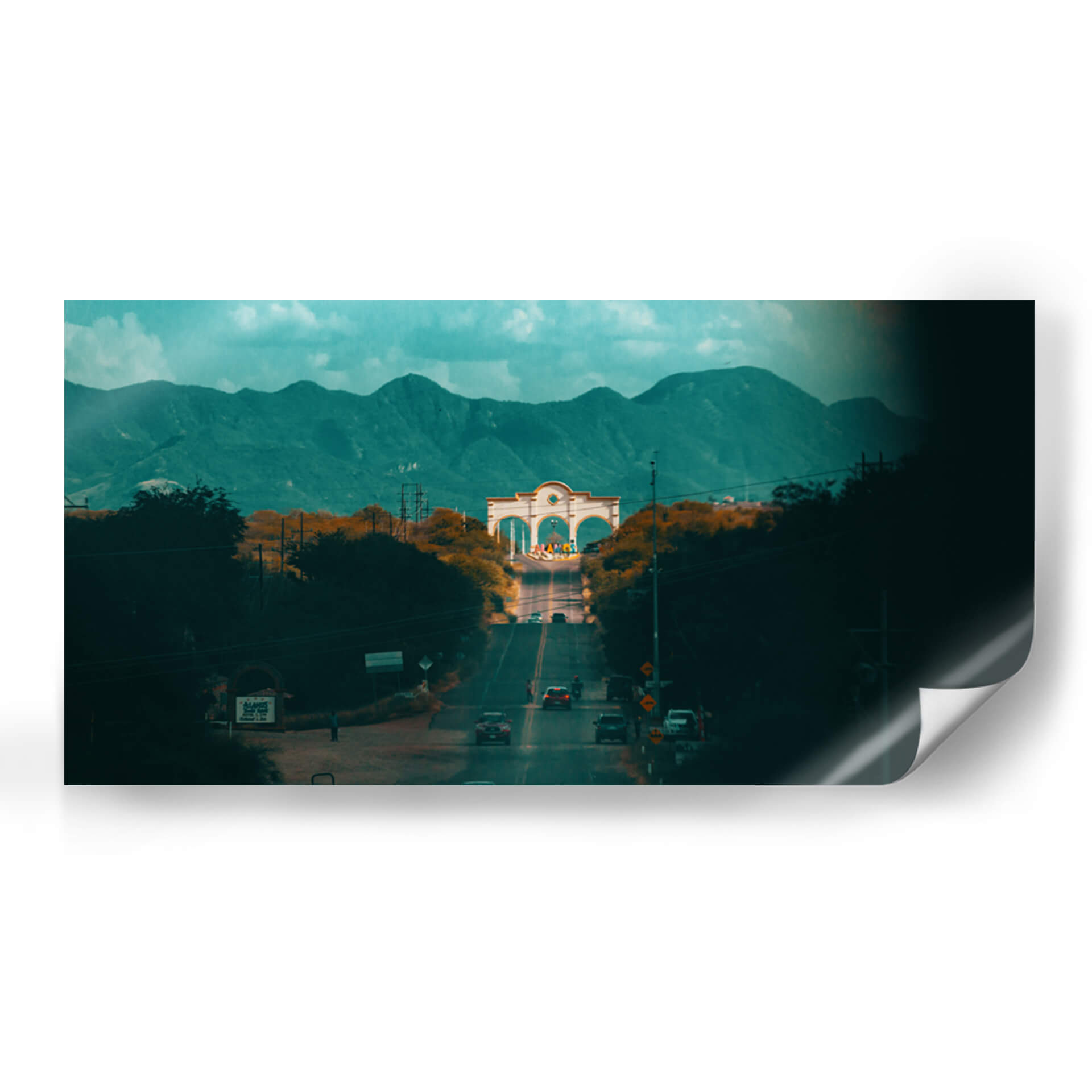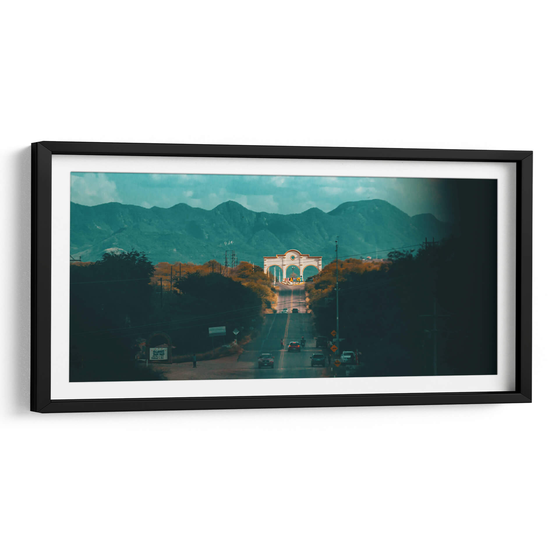Sumérgete en la evocadora escena de 'En Camino', una obra de arte que captura la esencia de un viaje hacia un destino prometedor. Esta pieza visual transporta al espectador a una carretera que serpentea entre exuberante vegetación y se dirige hacia un icónico arco arquitectónico, con majestuosas montañas como telón de fondo. Los tonos teal profundos y los verdes oscuros de la vegetación y las montañas contrastan sutilmente con los colores más cálidos y la iluminación del arco, creando una atmósfera de misterio y anticipación. La presencia de vehículos en la carretera añade una sensación de movimiento y dinamismo, sugiriendo el continuo fluir de la vida y el progreso. El estilo fotográfico con un toque de cine, realzado por una paleta de colores estilizada, confiere a esta obra un carácter moderno y cautivador. Es el cuadro decorativo perfecto para inspirar reflexión sobre los caminos recorridos y los que están por venir, ideal para salones, estudios u oficinas donde se busque un punto focal que invite a la contemplación y al diálogo. Transforma tu espacio con esta representación visual del viaje y la esperanza, un lienzo que habla de movimiento y destino.
