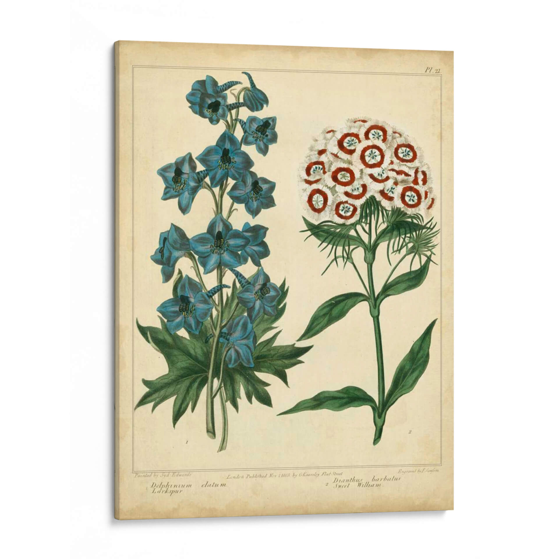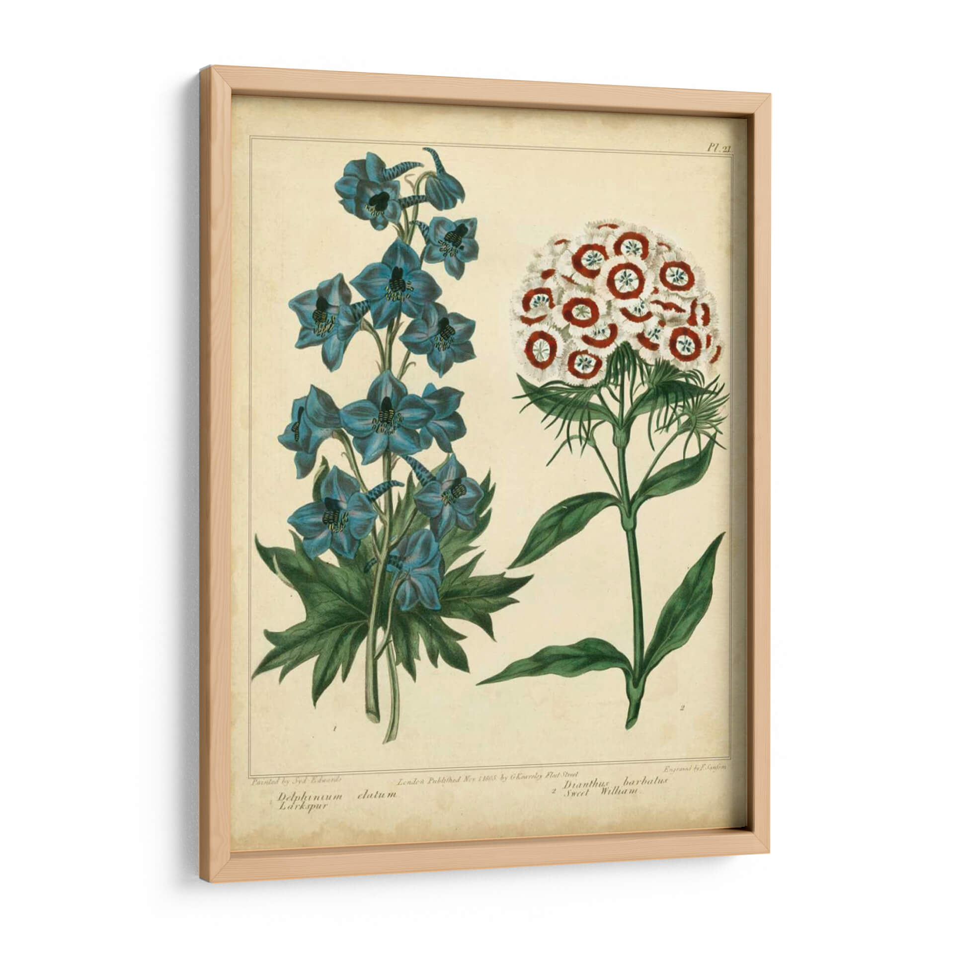 Embellece tu hogar con el encanto atemporal de 'Garden Flora II', una exquisita obra de arte botánica que captura la delicadeza de la naturaleza. Esta pieza presenta una detallada ilustración de dos flores distintas: un racimo vibrante de delphinium azul, con sus espirales de pétalos profundos y cautivadores, y un delicado clavel rojo y blanco, conocido como 'Sweet William', con sus bordes festoneados y centros detallados. La paleta de colores, dominada por verdes profundos, azules intensos y acentos rojos y blancos, se asienta sobre un fondo de tono pergamino que evoca una sensación de historia y elegancia clásica. El estilo, reminiscente de las ilustraciones científicas del siglo XIX, ofrece una claridad y precisión que atraen la mirada. Ideal para quienes buscan añadir un toque de sofisticación botánica a sus espacios, este cuadro decorativo es perfecto para salas de estar, estudios o incluso como un elemento distintivo en un dormitorio. Su composición equilibrada y la belleza intrínseca de las flores invitan a la contemplación y aportan una atmósfera de serenidad y conexión con el mundo natural. Añade un toque de historia natural y belleza botánica a tu decoración con esta impresionante obra de arte floral, diseñada para resonar con los amantes de la naturaleza y el diseño clásico.