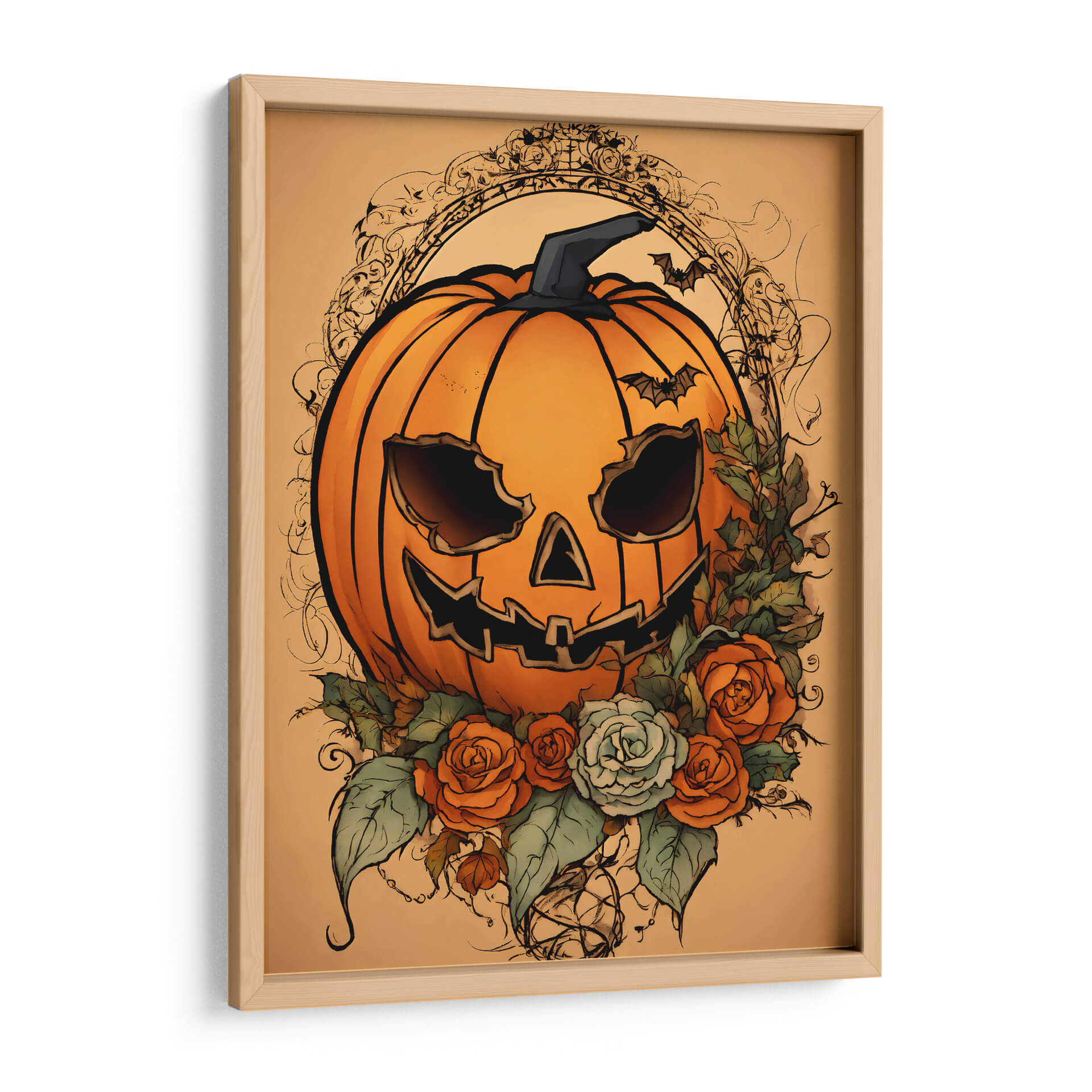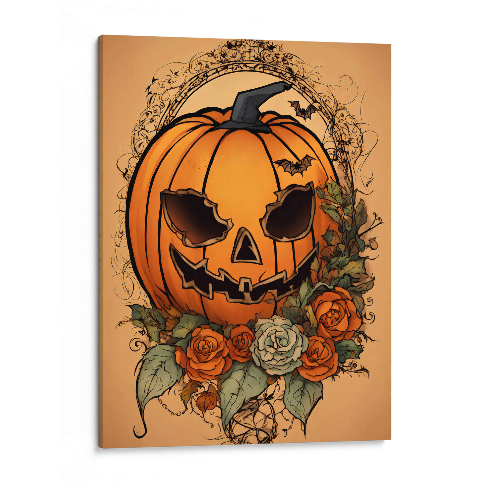 Celebra la temporada otoñal y el espíritu de Halloween con este cautivador cuadro decorativo, "Halloween 023". La obra presenta una icónica calabaza de Halloween, tallada con una expresión juguetona y ligeramente tenebrosa, rodeada por un exuberante ramillete de rosas en tonos anaranjados y blancos verdosos. El fondo en tono sepia y los delicados adornos florales y de murciélagos le otorgan un aire vintage y misterioso, ideal para quienes buscan añadir un toque temático y artístico a su hogar u oficina. Su estilo digital detallado, con líneas definidas y una paleta de colores cálidos y terrosos, crea una atmósfera única que evoca la magia de Halloween sin perder la elegancia. Este cuadro decorativo es perfecto para salas de estar, comedores o cualquier espacio que desee un punto focal original y lleno de personalidad durante la época de festividades o durante todo el año para los amantes de lo gótico-romántico. Añade un toque de encanto espeluznante y sofisticación a tu decoración.