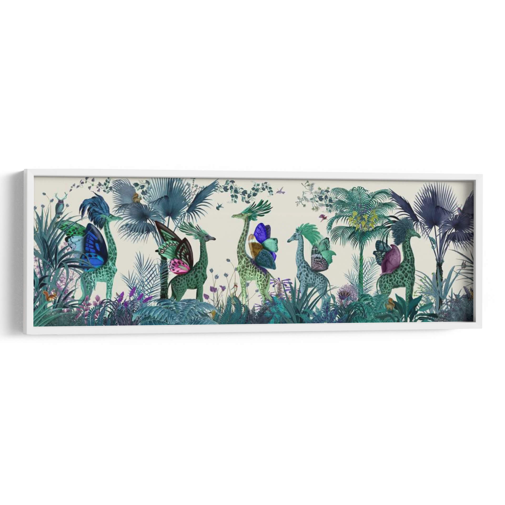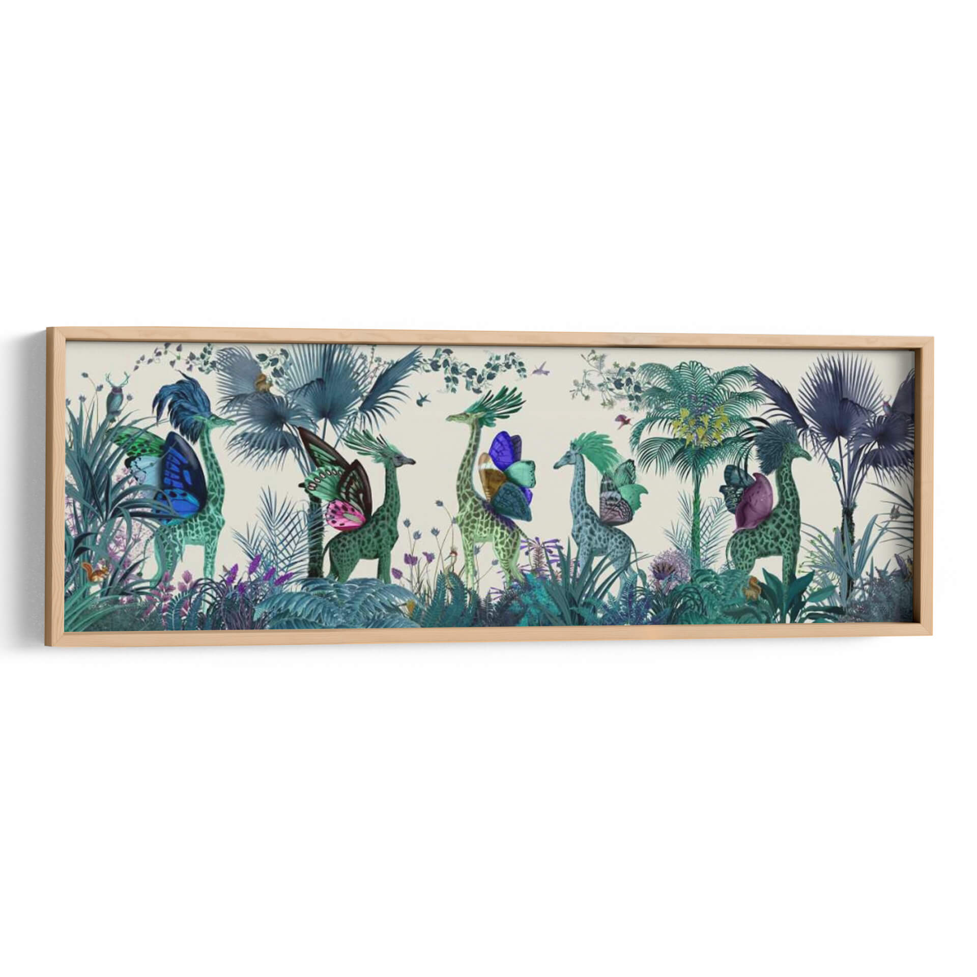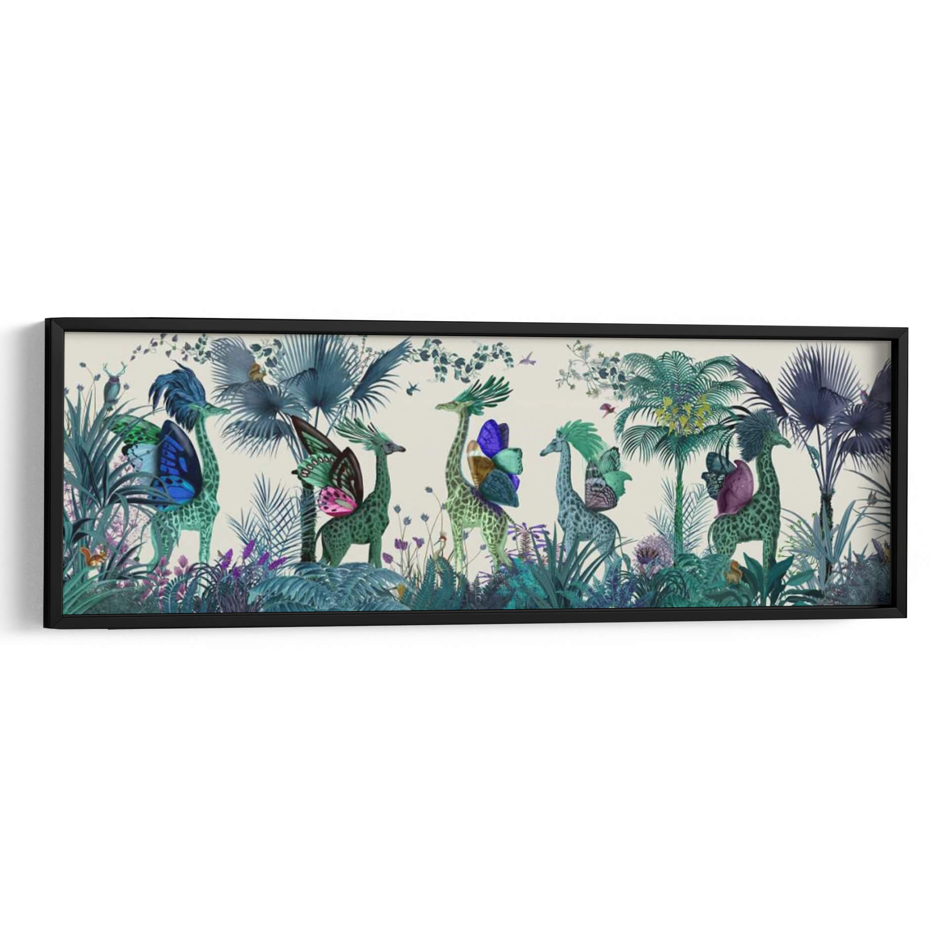 Embárcate en un viaje visual cautivador con nuestro cuadro decorativo 'Jirafas Tropicales, Azul', una obra de arte que fusiona la serenidad de la naturaleza con un toque de fantasía surrealista. Esta pieza presenta una hilera de jirafas estilizadas, cada una adornada con alas de mariposa vibrantes y emplumadas, emergiendo de un exuberante y misterioso follaje tropical. La paleta de colores se centra en profundos tonos de azul y verde esmeralda, evocando la calma de un bosque frondoso al amanecer, con sutiles toques de color en las alas que añaden un elemento de sorpresa y alegría. El estilo, una mezcla única de realismo fantástico y arte digital, crea una atmósfera etérea y soñadora. Las texturas detalladas de las hojas y las plumas, junto con la delicadeza de las jirafas, invitan a la contemplación. Ideal para quienes buscan añadir un punto focal único y lleno de carácter a su hogar u oficina, este cuadro es perfecto para salas de estar modernas, dormitorios que buscan un toque de magia, o incluso espacios creativos y de inspiración. Su formato panorámico lo convierte en una pieza ideal para destacar en paredes amplias, creando una experiencia inmersiva. Deja que 'Jirafas Tropicales, Azul' transforme tu espacio en un santuario de imaginación y estilo.