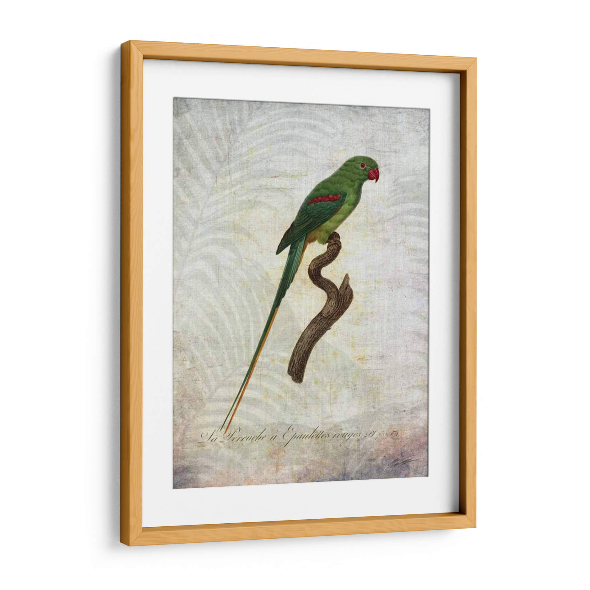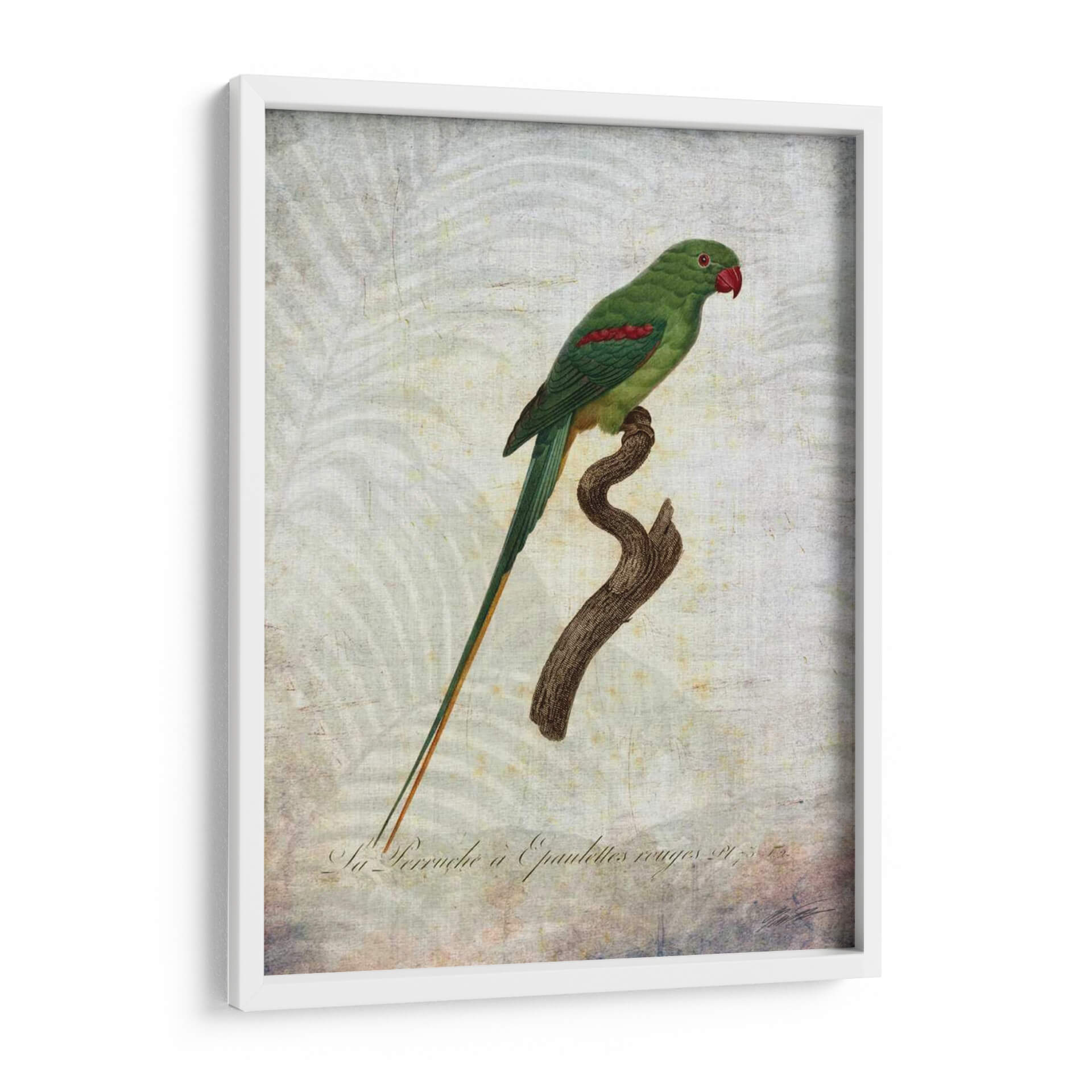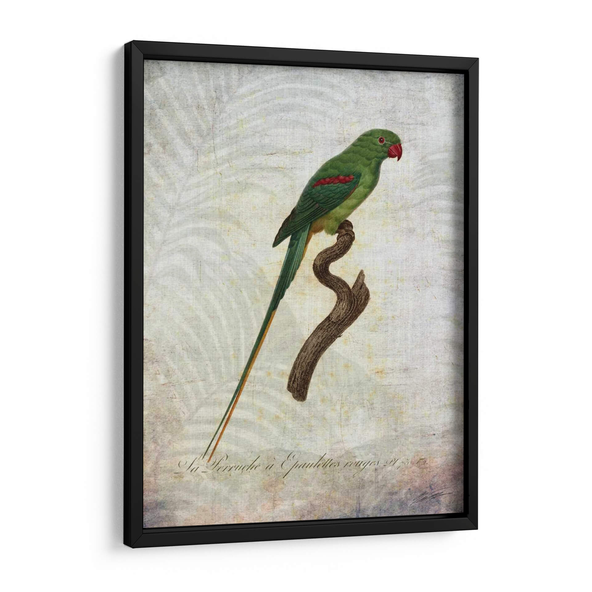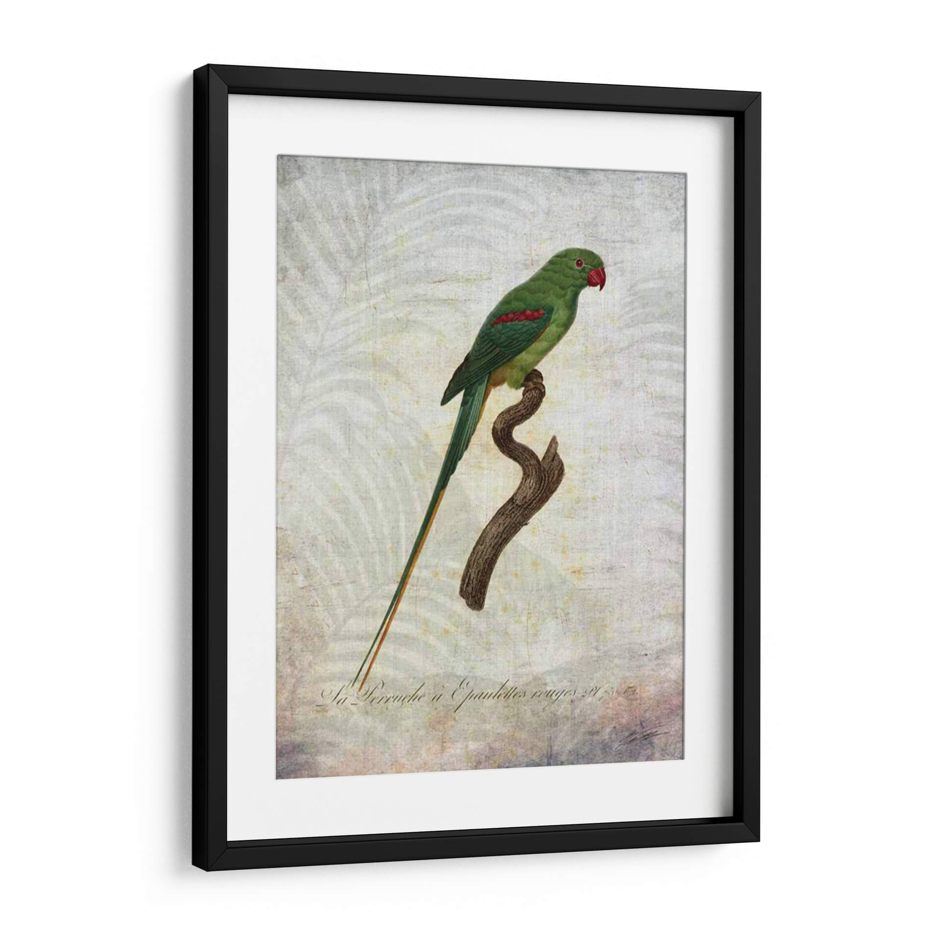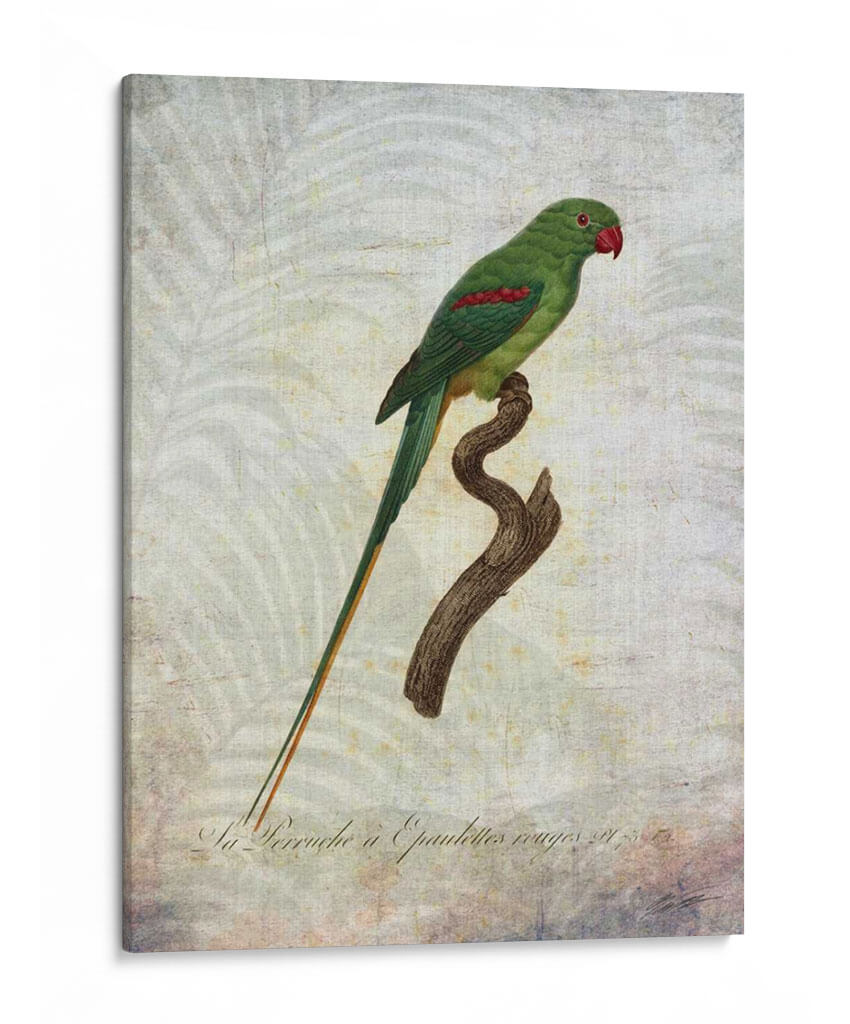 Sumérgete en la exuberancia tropical con "Parrot Jungle Iii", una obra de arte que captura la majestuosidad de un loro verde vibrante posado sobre una rama rústica. Los detalles intrincados de las plumas del ave, resaltados por sutiles toques de rojo en sus hombros y un pico carmesí, contrastan elegantemente con el delicado y texturizado fondo que evoca un ambiente botánico etéreo. La paleta de colores, dominada por verdes profundos, toques de rojo y tonos tierra suaves, crea una atmósfera de serenidad y conexión con la naturaleza. Este cuadro decorativo, con su estilo que recuerda a las ilustraciones científicas clásicas pero con un toque contemporáneo, es ideal para añadir un punto focal de color y vida a cualquier espacio. Perfecto para salones, dormitorios o estudios que busquen una dosis de elegancia natural y un aire de sofisticación exótica. La composición centrada y la calidad detallada de la obra la convierten en una pieza versátil, capaz de complementar desde decoraciones clásicas hasta interiores más modernos y eclécticos, invitando a la contemplación y al disfrute de la belleza natural en tu hogar.