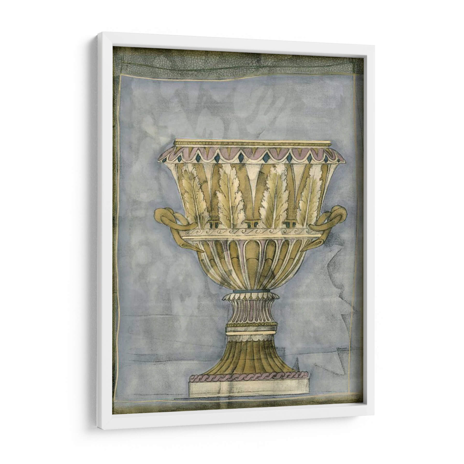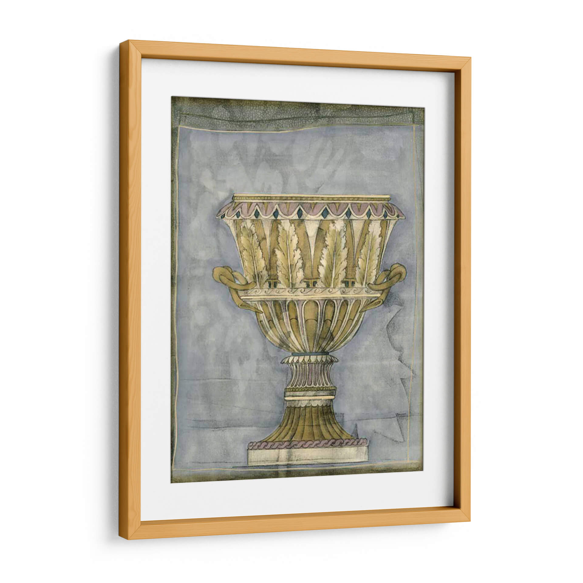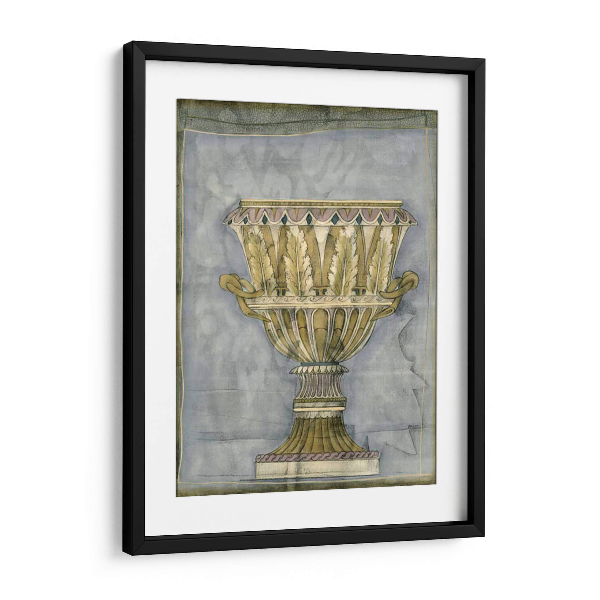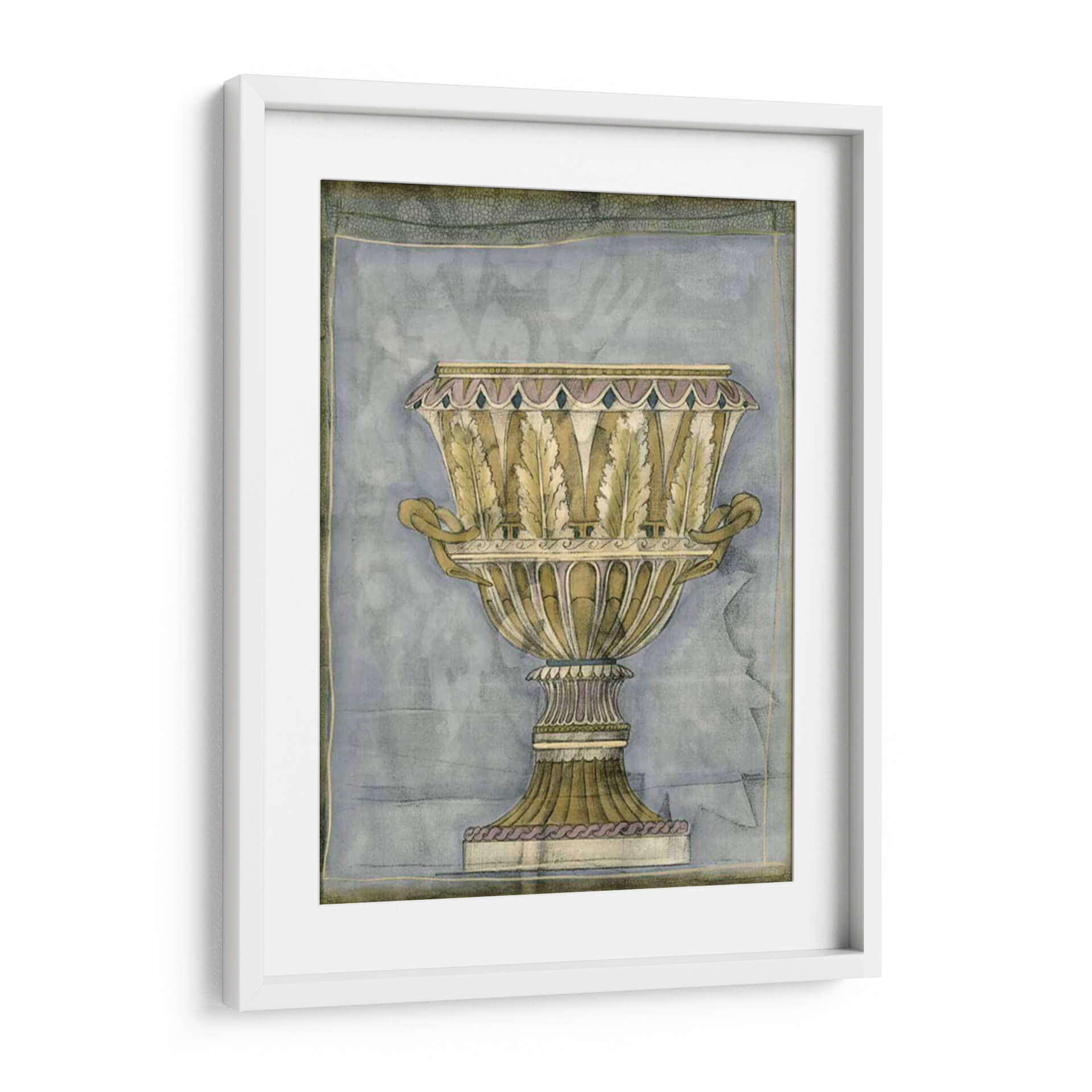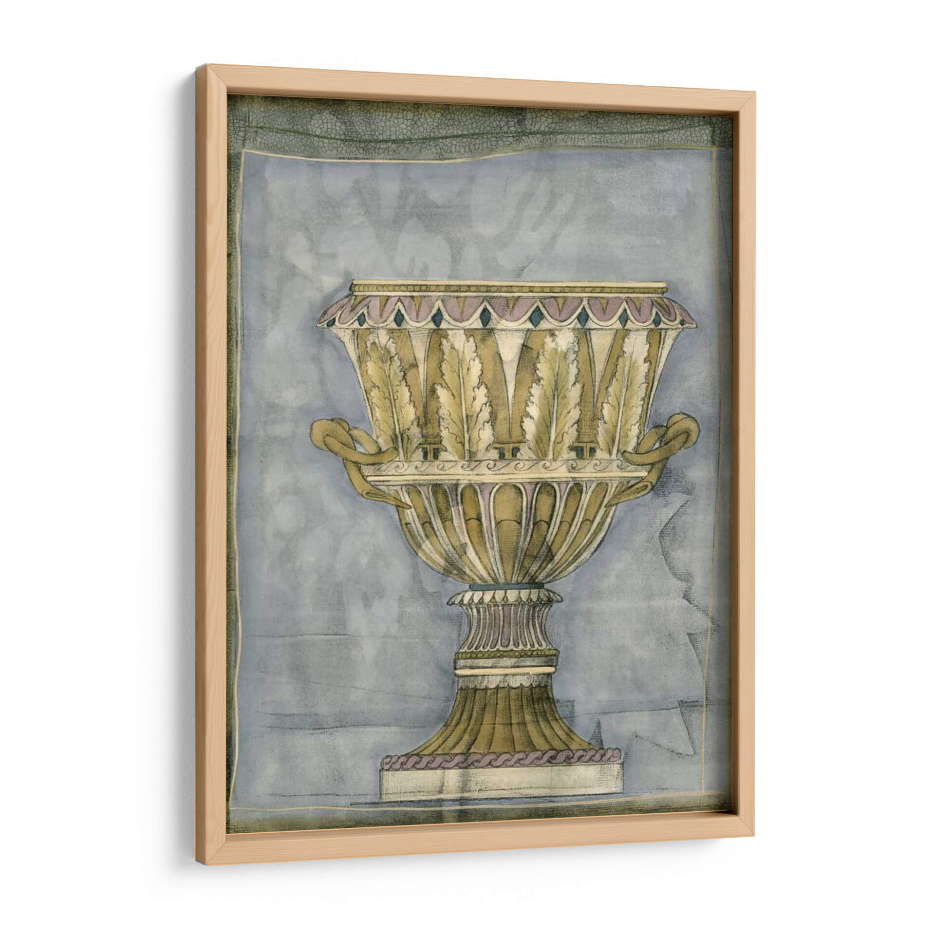 Sumérgete en la elegancia clásica con 'Pequeña Urna Y Damasco Iv', una obra de arte que evoca la opulencia y el detalle del diseño neoclásico. Esta pieza, creada por Jennifer Goldberger, presenta una elaborada urna central adornada con motivos de hojas de acanto doradas y detalles en púrpura y blanco roto. La composición se enmarca dentro de un sutil tapiz o fondo texturizado en tonos azulados y grises, bordeado por una delicada línea dorada y un patrón decorativo en la parte superior, reminiscentes de un tapiz antiguo o un fresco. La paleta de colores, dominada por tonos dorados, ocres, azules pálidos y toques de malva, confiere a la obra una atmósfera de serenidad y sofisticación atemporal. El estilo combina elementos de ilustración botánica y arte decorativo, con un tratamiento que podría asemejarse a la acuarela o al gouache, aportando una cualidad etérea. Ideal para espacios que buscan un toque de refinamiento clásico y calidez, como salones formales, estudios o incluso dormitorios principales, este cuadro decorativo es una invitación a la contemplación y al aprecio por la belleza ornamental. Su presencia aportará un aire de distinción y un punto focal de interés histórico y artístico.