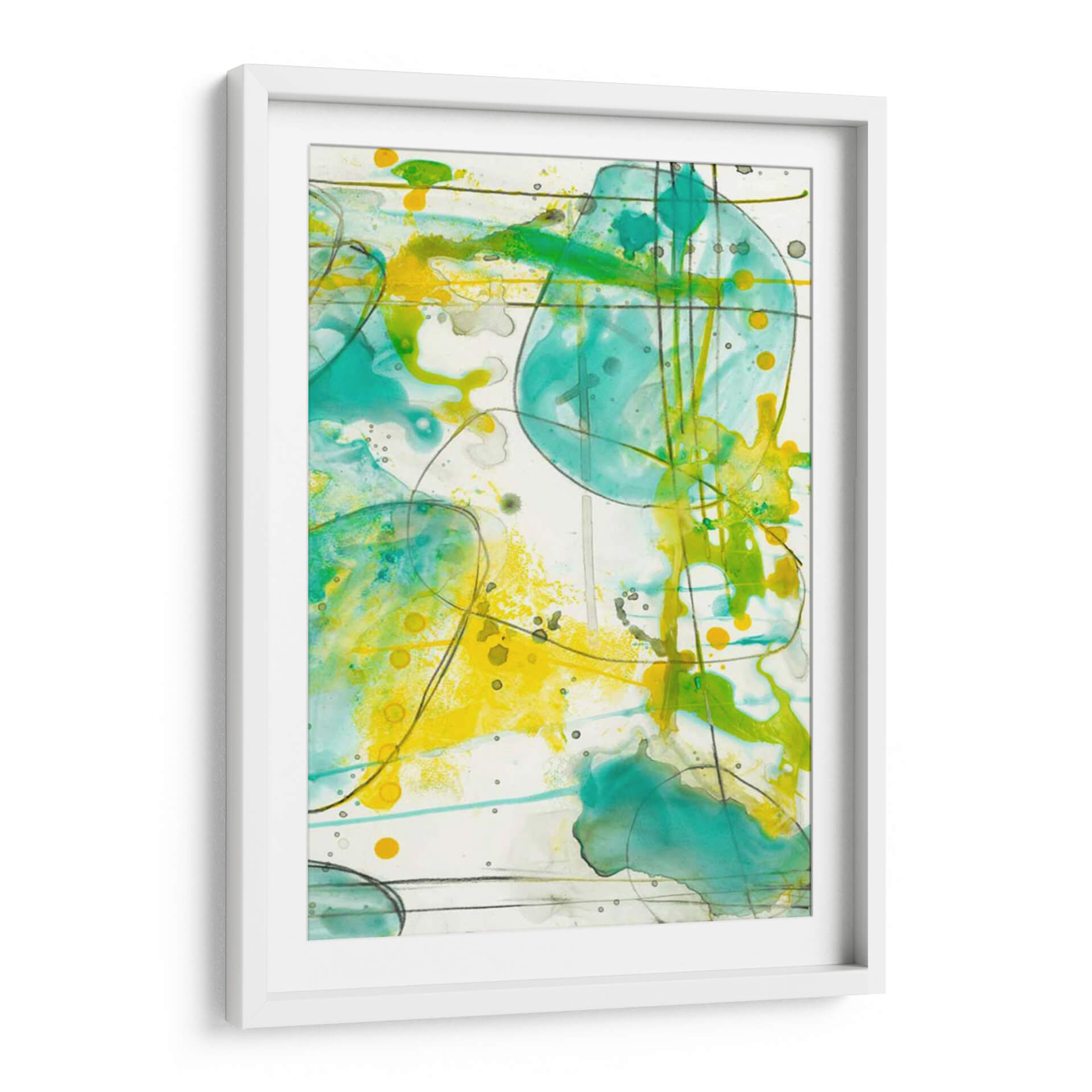 Sumérgete en la vibrante y enérgica obra de arte 'Splish Splash II' de Jennifer Goldberger, un cuadro decorativo que captura la esencia del movimiento y la alegría a través de una abstracción lírica. Los fluidos trazos en tonos turquesa, verde esmeralda y amarillo brillante se entrelazan sobre un fondo neutro, evocando la sensación de salpicaduras de agua bajo el sol o la explosión de colores en un jardín exuberante. Las líneas oscuras y orgánicas añaden profundidad y estructura, creando un dinamismo visual que invita a la contemplación. Esta pieza es perfecta para inyectar vitalidad y un toque de arte contemporáneo en cualquier espacio, ya sea una sala de estar moderna, un estudio creativo o una oficina. Su composición abstracta y su paleta de colores optimista la convierten en un punto focal ideal para quienes buscan un ambiente fresco y estimulante. 'Splish Splash II' no es solo un cuadro, es una invitación a la expresión artística y a la celebración de la vida a través del color y la forma. Añade esta pieza única a tu colección y transforma tu hogar en una galería personal llena de energía y estilo.