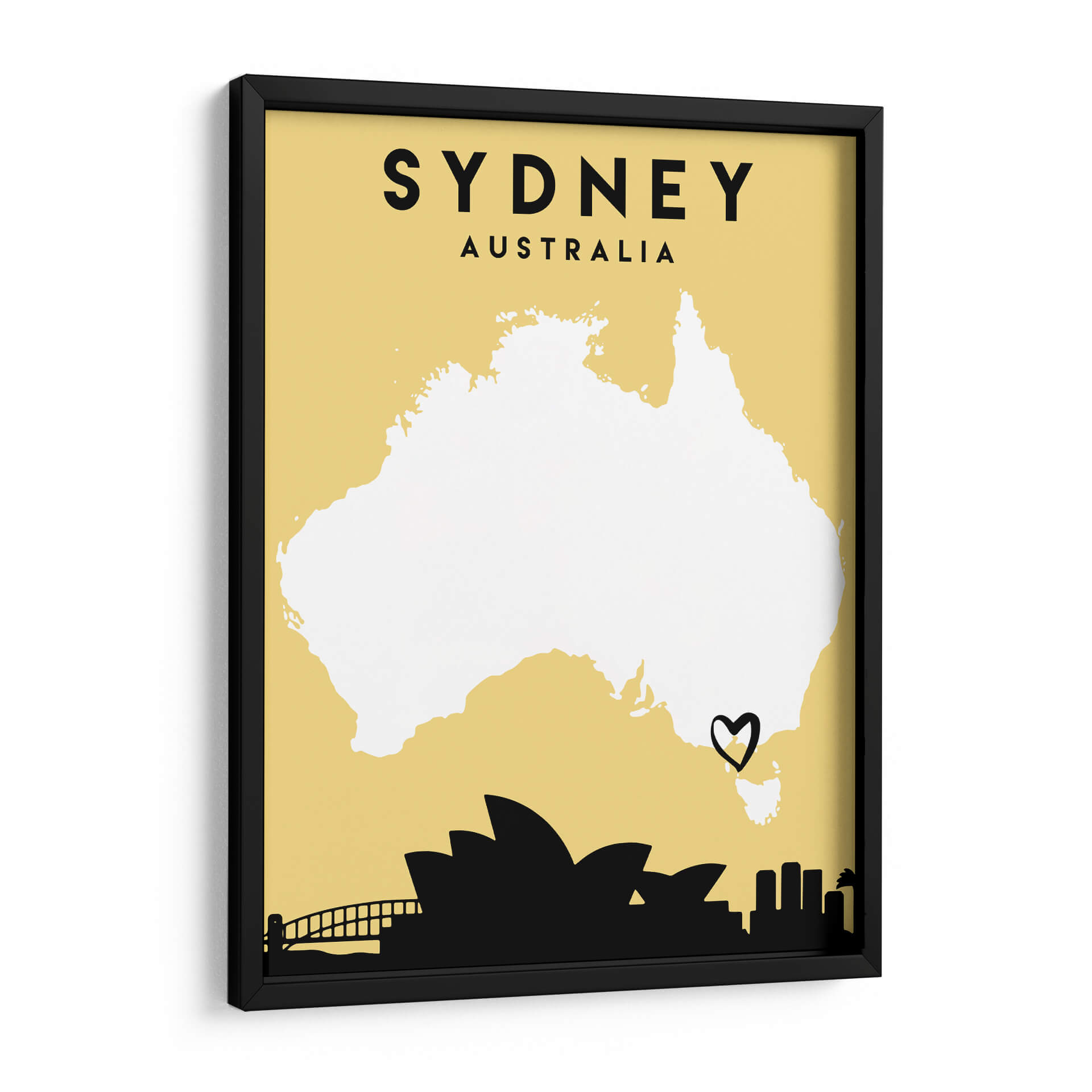 Celebra tu amor por la vibrante ciudad de Sydney, Australia, con este cautivador cuadro decorativo minimalista. La obra presenta una silueta estilizada de Australia en blanco sobre un fondo amarillo sol, con un corazón dibujado a mano marcando la ubicación de Sydney, destacando su importancia especial. En la parte inferior, un detalle icónico del horizonte de la ciudad, incluyendo la Ópera de Sídney y el Puente de la Bahía, se representa en negro sólido, creando un contraste llamativo. Este diseño limpio y moderno, inspirado en mapas estilizados, es perfecto para añadir un toque de aventura y conexión personal a cualquier espacio. Ideal para adornar salas de estar, dormitorios, oficinas o cualquier lugar donde desees evocar recuerdos de viajes o sueños de explorar esta metrópoli australiana. Su paleta de colores optimista y su composición gráfica la convierten en una pieza versátil que complementa una amplia gama de estilos de decoración, desde el contemporáneo hasta el escandinavo. Añade este toque geográfico y emocional a tu hogar.