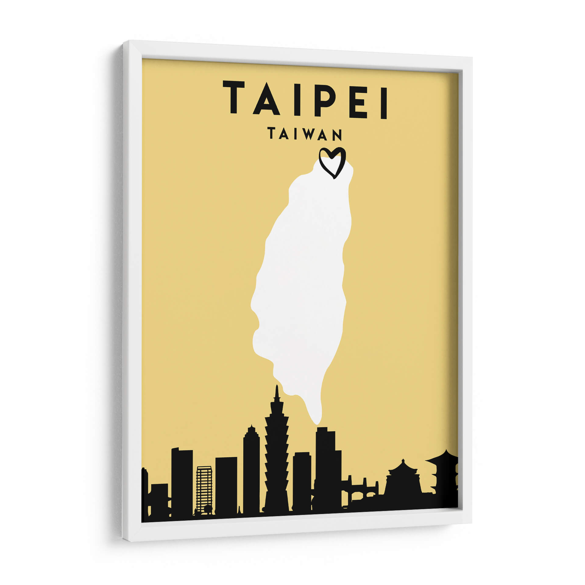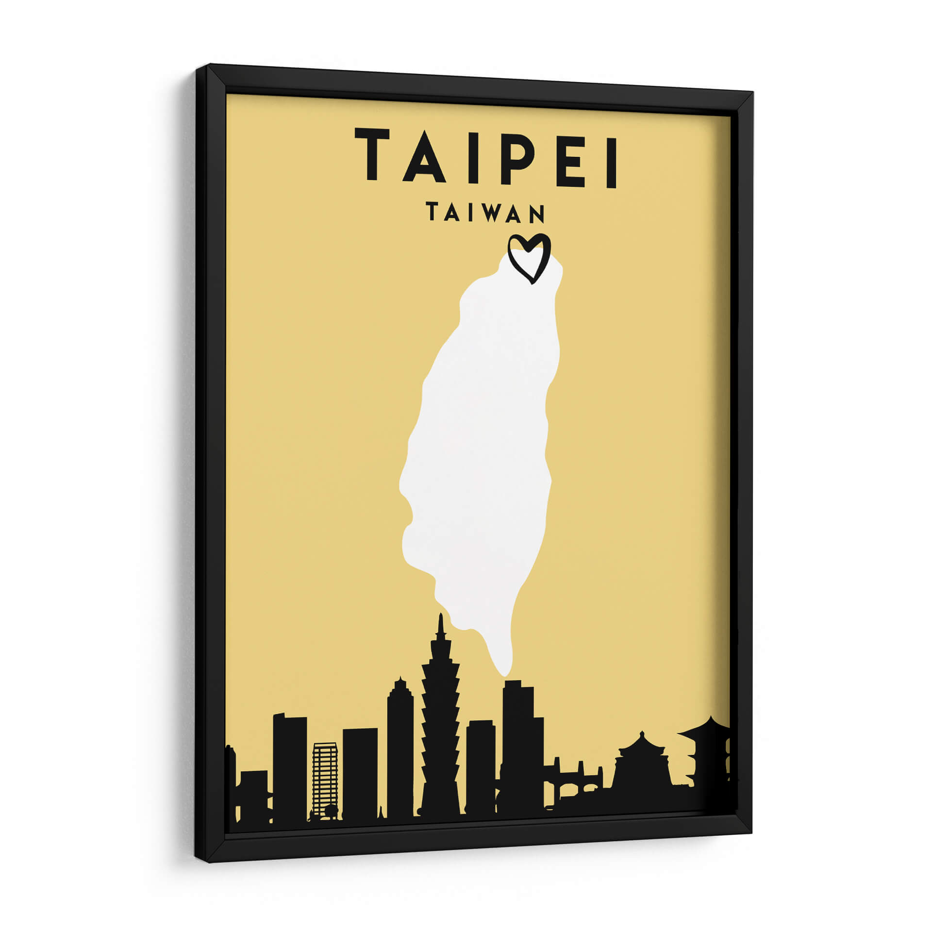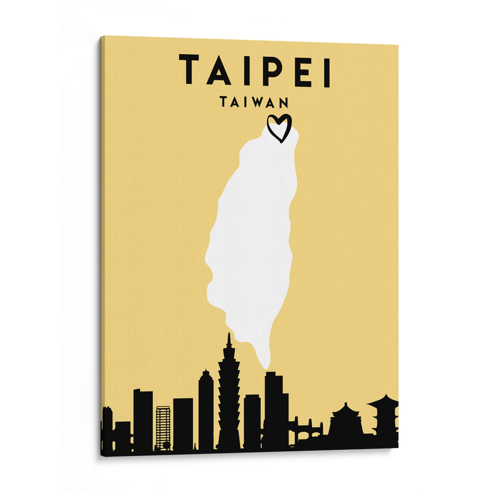 Sumérgete en la vibrante esencia de Taipei con esta cautivadora obra de arte minimalista. "Taipei, Taiwan - Mapas de amor de la ciudad 85" de Emiliano Deificus te transporta al corazón de la capital taiwanesa a través de una composición inteligente y estilizada. El fondo en tono amarillo ocre proporciona una base cálida y atractiva, sobre la cual se despliega un mapa simplificado de Taiwán, destacando la forma de la isla en un nítido blanco. Coronando este contorno geográfico, un pequeño corazón negro añade un toque de afecto y conexión personal, sugiriendo un amor por la ciudad o el país. La parte inferior de la obra presenta una silueta negra distintiva del horizonte de Taipei, con edificios icónicos reconocibles, incluyendo la Taipei 101, que anclan la pieza a su ubicación específica. Este cuadro decorativo es ideal para aquellos que buscan evocar recuerdos de viajes, expresar su herencia o simplemente añadir un toque de encanto geográfico y moderno a sus espacios. Su diseño limpio y la paleta de colores limitada lo hacen versátil, encajando perfectamente en salones contemporáneos, oficinas o cualquier lugar donde se desee un punto focal que celebre la cultura y la estética urbana.