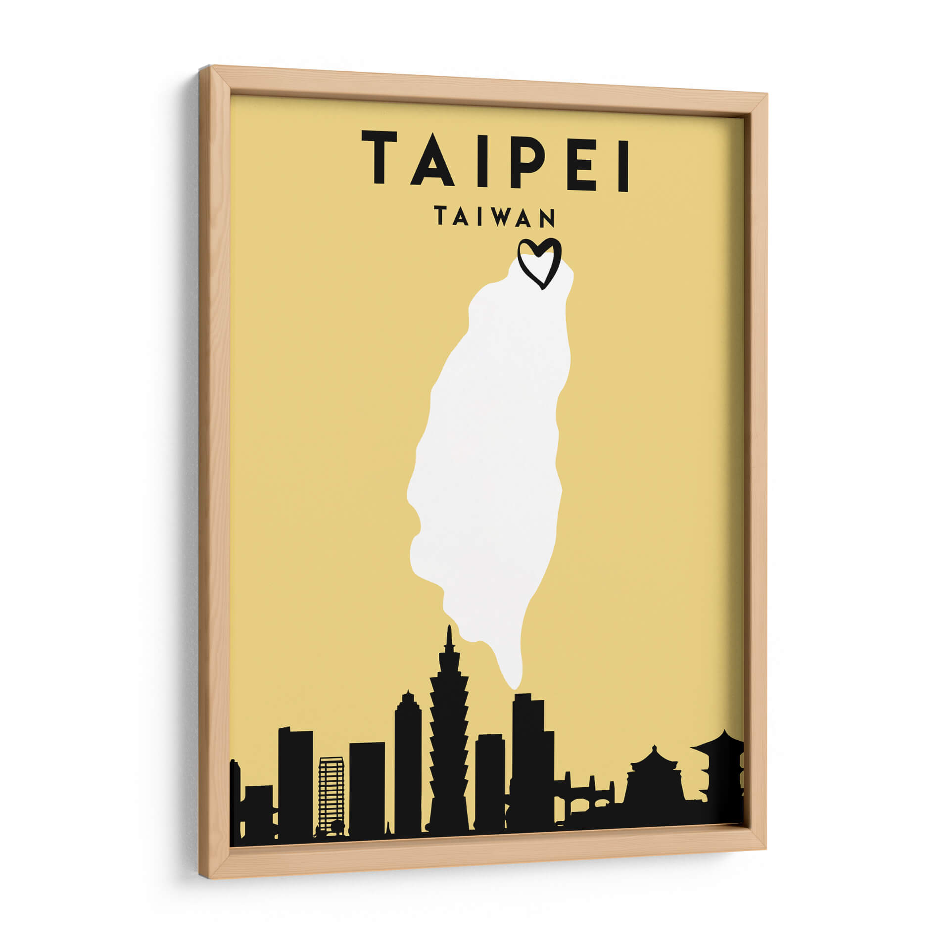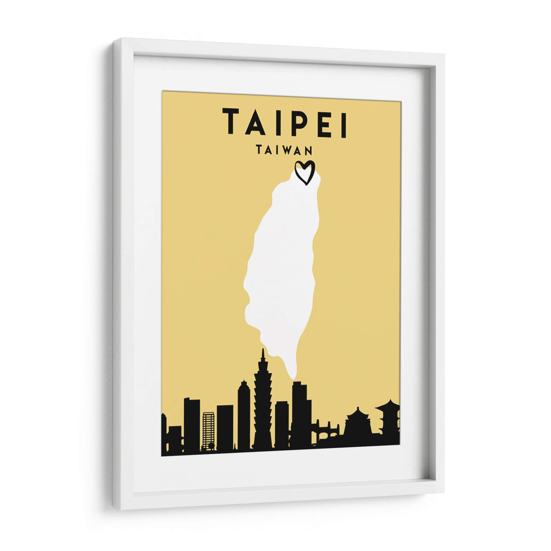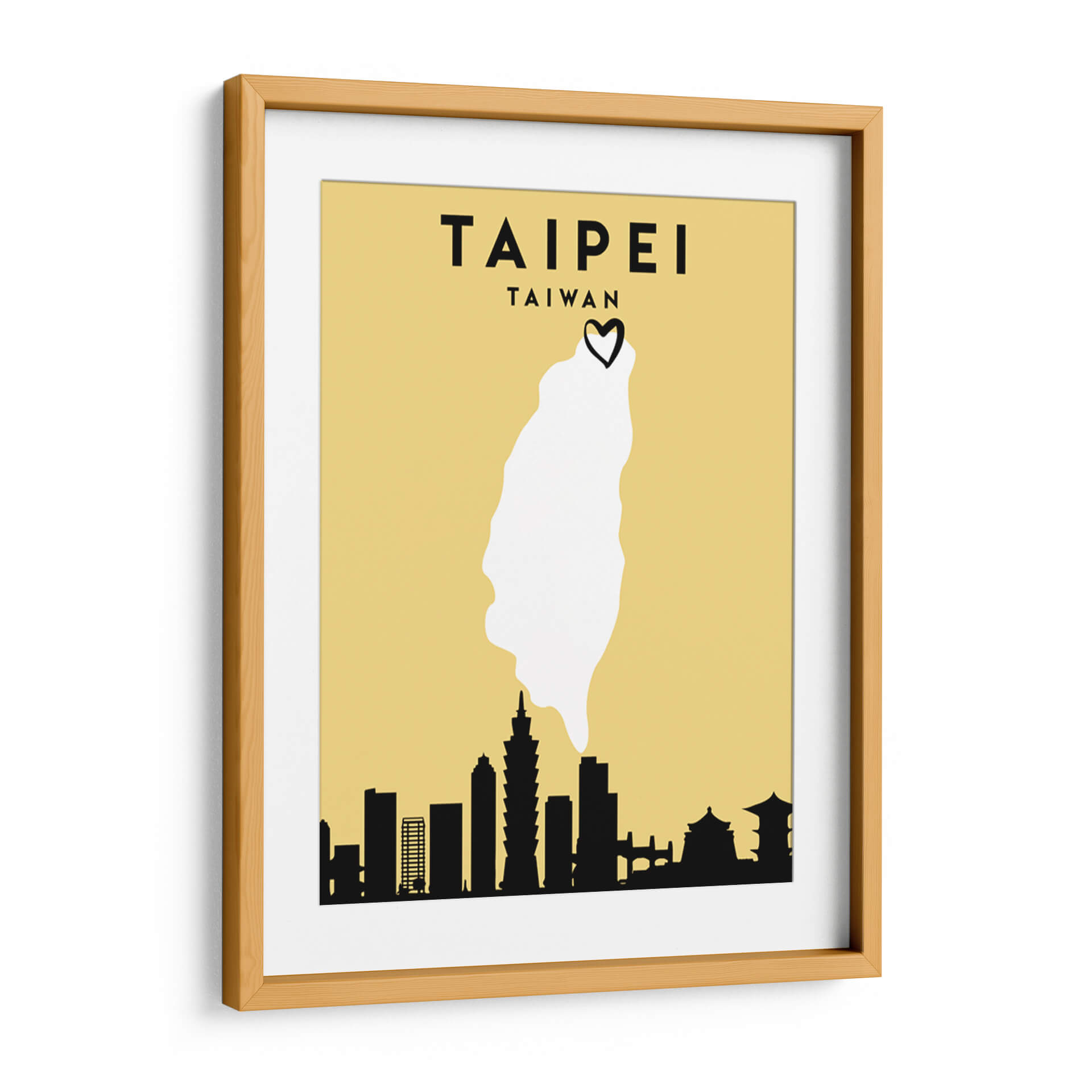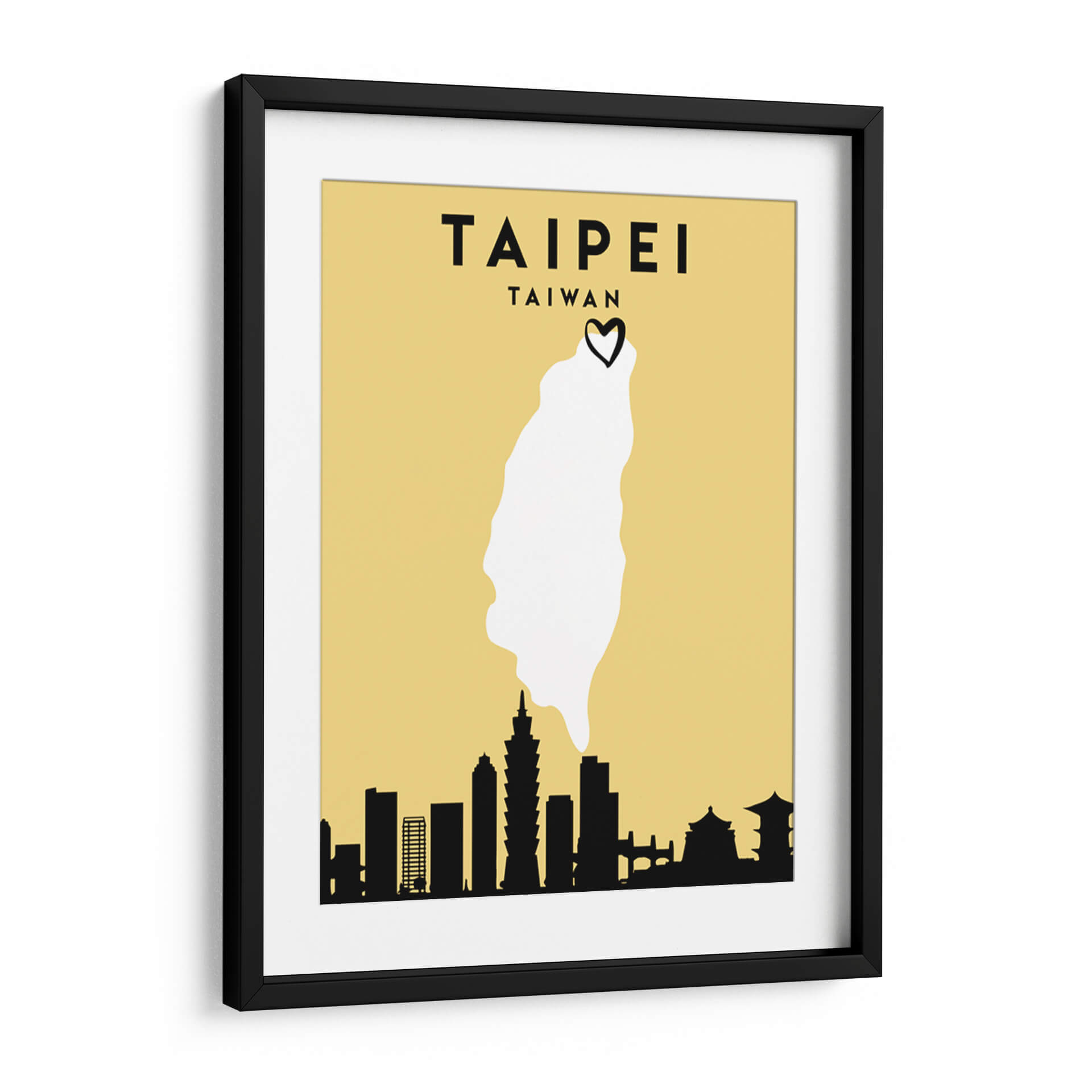 Sumérgete en la vibrante esencia de Taipei con esta cautivadora obra de arte minimalista. "Taipei, Taiwan - Mapas de amor de la ciudad 85" de Emiliano Deificus te transporta al corazón de la capital taiwanesa a través de una composición inteligente y estilizada. El fondo en tono amarillo ocre proporciona una base cálida y atractiva, sobre la cual se despliega un mapa simplificado de Taiwán, destacando la forma de la isla en un nítido blanco. Coronando este contorno geográfico, un pequeño corazón negro añade un toque de afecto y conexión personal, sugiriendo un amor por la ciudad o el país. La parte inferior de la obra presenta una silueta negra distintiva del horizonte de Taipei, con edificios icónicos reconocibles, incluyendo la Taipei 101, que anclan la pieza a su ubicación específica. Este cuadro decorativo es ideal para aquellos que buscan evocar recuerdos de viajes, expresar su herencia o simplemente añadir un toque de encanto geográfico y moderno a sus espacios. Su diseño limpio y la paleta de colores limitada lo hacen versátil, encajando perfectamente en salones contemporáneos, oficinas o cualquier lugar donde se desee un punto focal que celebre la cultura y la estética urbana.