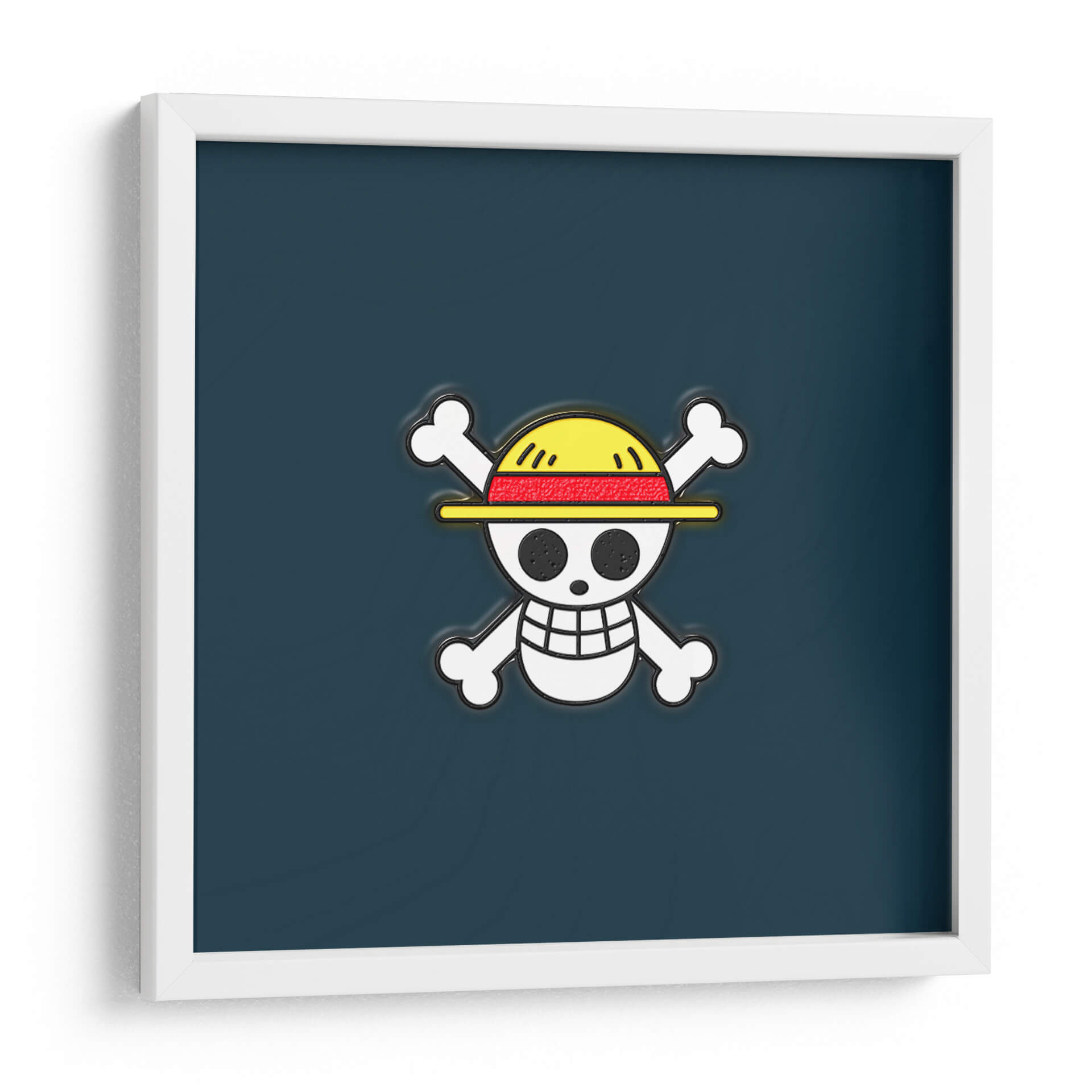Este cautivador cuadro decorativo presenta una audaz interpretación del icónico símbolo de calavera y tibias cruzadas, coronado con un sombrero de paja distintivo. La paleta de colores se centra en un profundo y enigmático tono azul marino de fondo, que contrasta vívidamente con el blanco y negro de la calavera, acentuada por los vibrantes toques amarillos y rojos del sombrero. La composición es limpia y directa, con el símbolo ocupando el centro de la atención, lo que lo convierte en un punto focal potente para cualquier habitación. Evoca una sensación de aventura, rebelión y un espíritu indomable, ideal para aquellos que aprecian la cultura pop con un toque artístico. Este cuadro es perfecto para añadir carácter a un salón moderno, una sala de juegos, o incluso como una declaración única en una oficina o dormitorio. Su diseño gráfico y distintivo lo hace un regalo ideal para fans o para cualquiera que busque infundir a su espacio una dosis de personalidad y estilo audaz, celebrando la estética de la aventura y la exploración con un diseño contemporáneo y llamativo. Es una pieza que sin duda generará conversación y reflejará una personalidad intrépida.