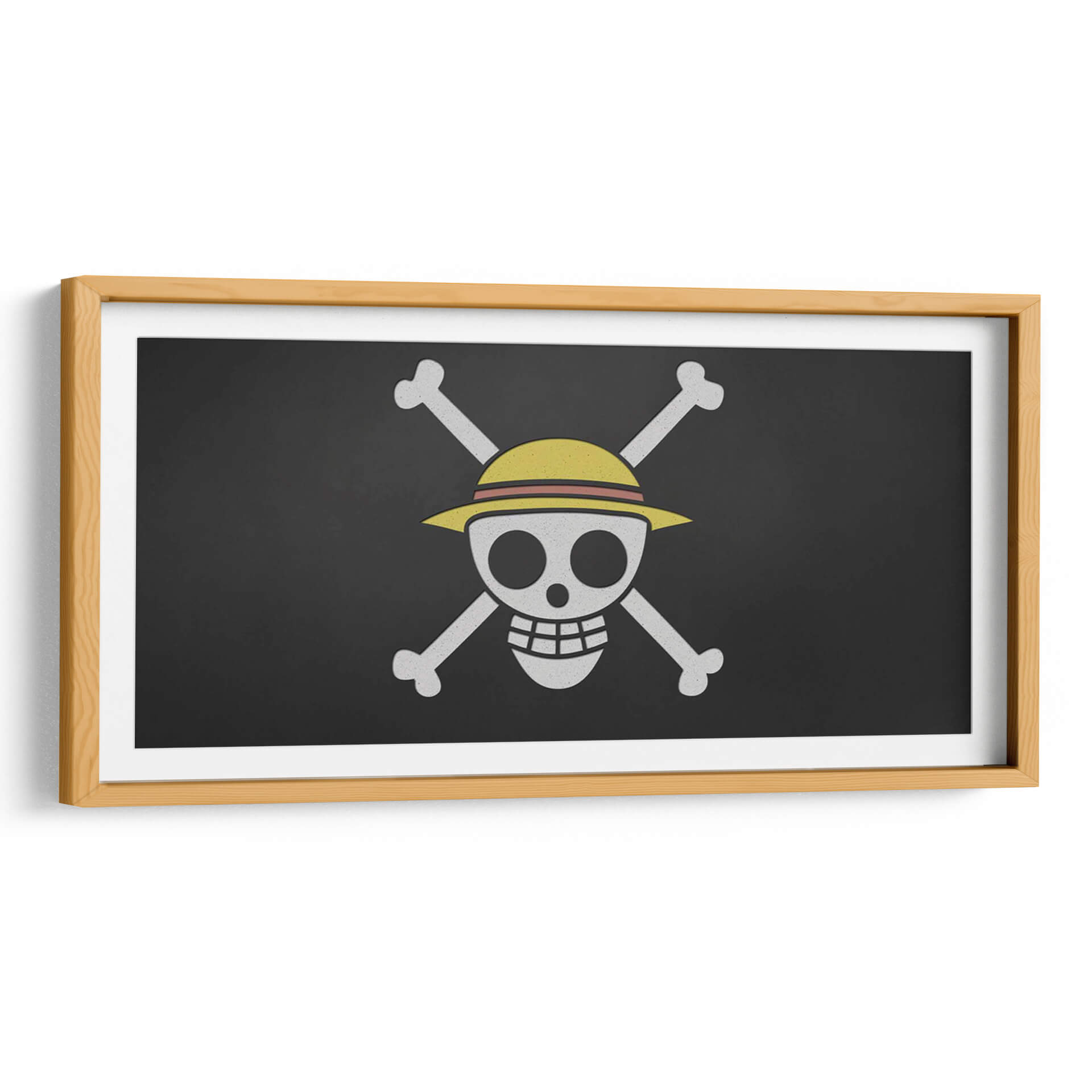 Este llamativo cuadro decorativo presenta un diseño icónico que evoca aventura y audacia. La figura central, una calavera con un sombrero de paja de colores vivos, se cruza con dos huesos blancos sobre un fondo negro profundo, creando un contraste impactante y una silueta reconocible al instante. La paleta de colores se centra en el contraste entre el negro, el blanco y el amarillo brillante del sombrero, lo que le confiere una estética gráfica y moderna. El estilo es simplificado y directo, con líneas claras y formas definidas que le otorgan una presencia poderosa. Esta obra de arte es ideal para aquellos que buscan añadir un toque de personalidad y un aire de rebelión a sus espacios, ya sea una sala de estar, una oficina o una habitación temática. Su diseño potente puede servir como un punto focal intrigante, estimulando la conversación y reflejando un espíritu libre y aventurero. Transmite una sensación de energía contenida y un simbolismo de exploración, perfecta para decorar con audacia.
