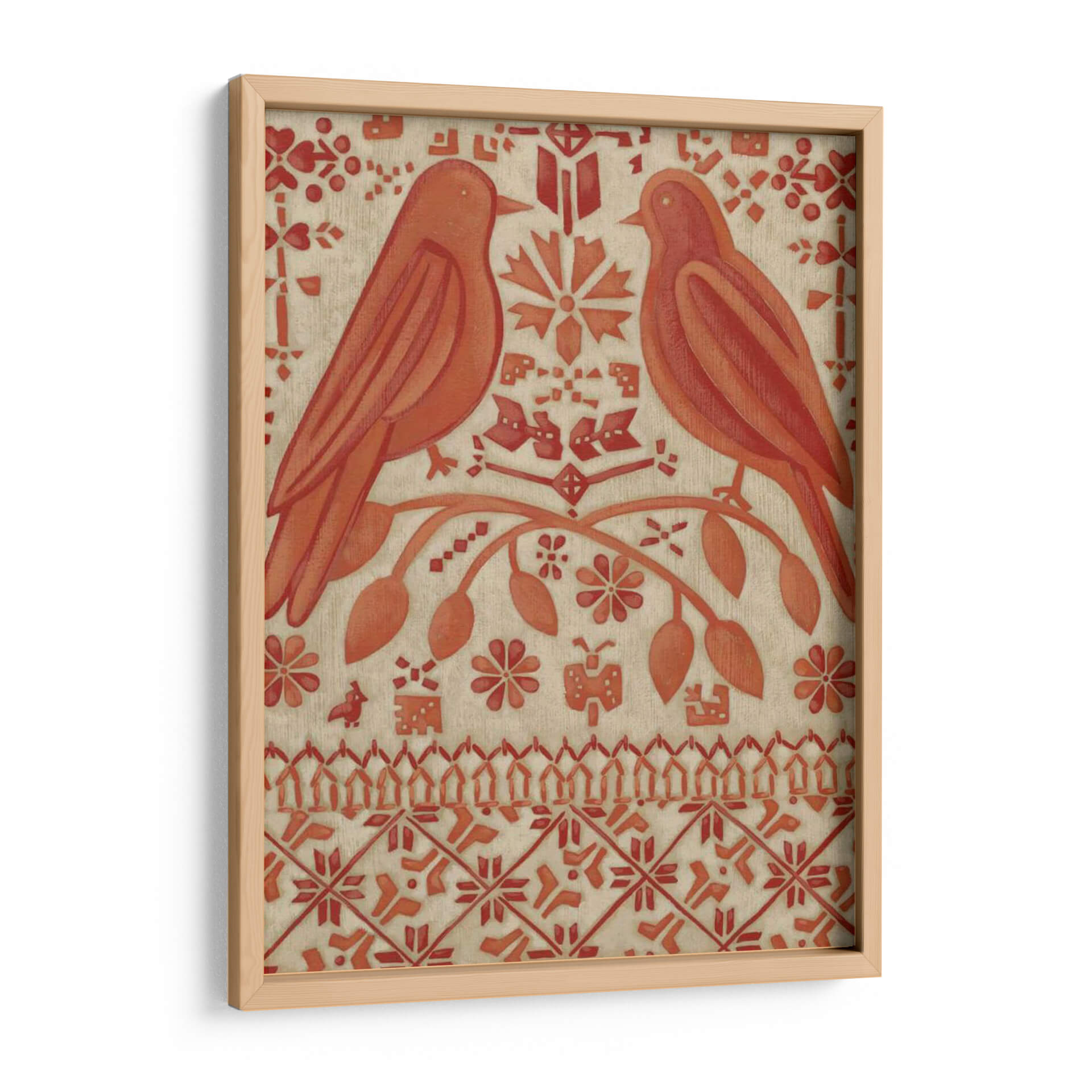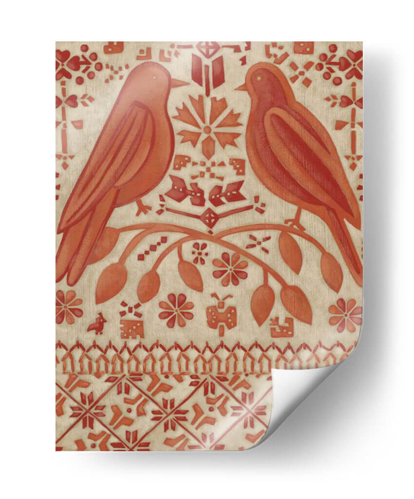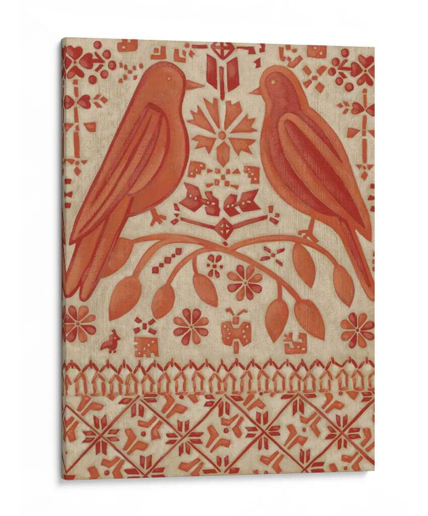 Sumérgete en la calidez y el encanto de "Amor Verdadero I", una obra de arte decorativo que evoca sentimientos de conexión y serenidad. Este cuadro presenta dos pájaros estilizados posados en una rama florida, rodeados de un intrincado patrón de motivos florales y geométricos en tonos terracota y beige. La composición simétrica y la paleta de colores tierra transmiten una sensación de equilibrio y armonía, ideal para crear un ambiente acogedor en cualquier hogar. La técnica utilizada, que recuerda a las artes textiles o grabados antiguos, añade una textura visual única y un aire de artesanía a la pieza. "Amor Verdadero I" es más que una simple decoración de pared; es una invitación a la contemplación y un reflejo del vínculo entre la naturaleza y el afecto. Perfecto para salones, dormitorios o entradas, este lienzo añadirá un toque de sofisticación rústica y un encanto atemporal a tu espacio, convirtiéndose en un punto focal que inspira calma y dulzura. Descubre la belleza de este diseño único que captura la esencia del amor verdadero a través del arte.