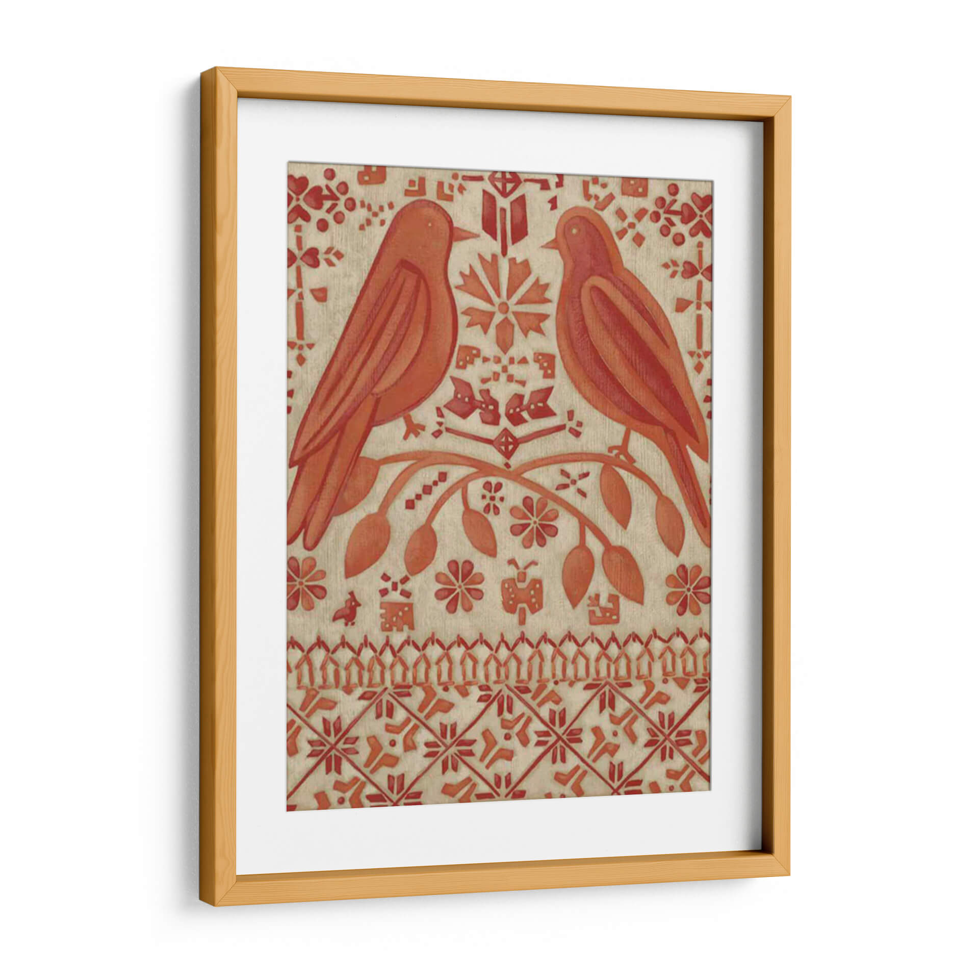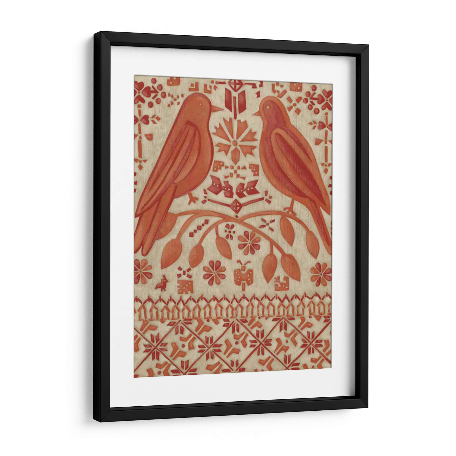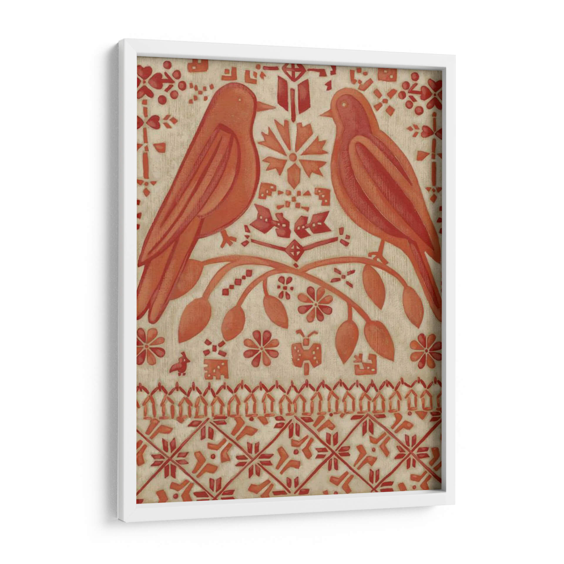 Sumérgete en la calidez y el encanto de "Amor Verdadero I", una obra de arte decorativo que evoca sentimientos de conexión y serenidad. Este cuadro presenta dos pájaros estilizados posados en una rama florida, rodeados de un intrincado patrón de motivos florales y geométricos en tonos terracota y beige. La composición simétrica y la paleta de colores tierra transmiten una sensación de equilibrio y armonía, ideal para crear un ambiente acogedor en cualquier hogar. La técnica utilizada, que recuerda a las artes textiles o grabados antiguos, añade una textura visual única y un aire de artesanía a la pieza. "Amor Verdadero I" es más que una simple decoración de pared; es una invitación a la contemplación y un reflejo del vínculo entre la naturaleza y el afecto. Perfecto para salones, dormitorios o entradas, este lienzo añadirá un toque de sofisticación rústica y un encanto atemporal a tu espacio, convirtiéndose en un punto focal que inspira calma y dulzura. Descubre la belleza de este diseño único que captura la esencia del amor verdadero a través del arte.