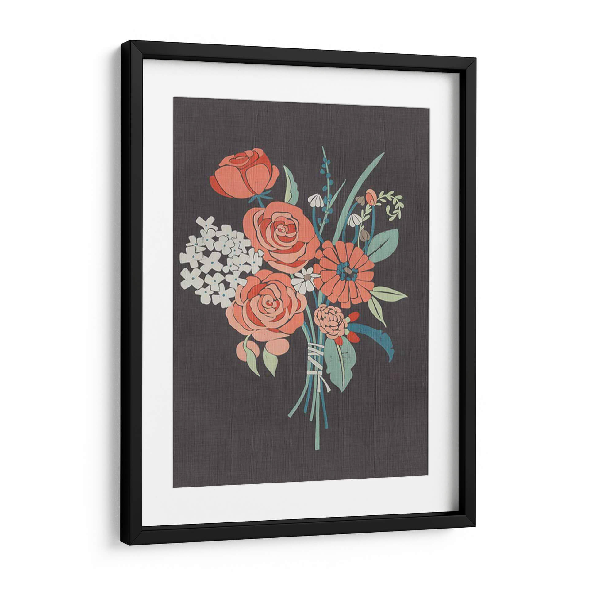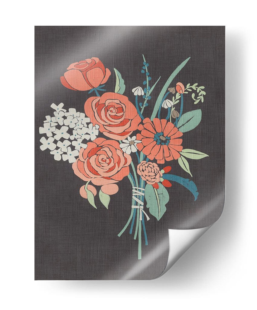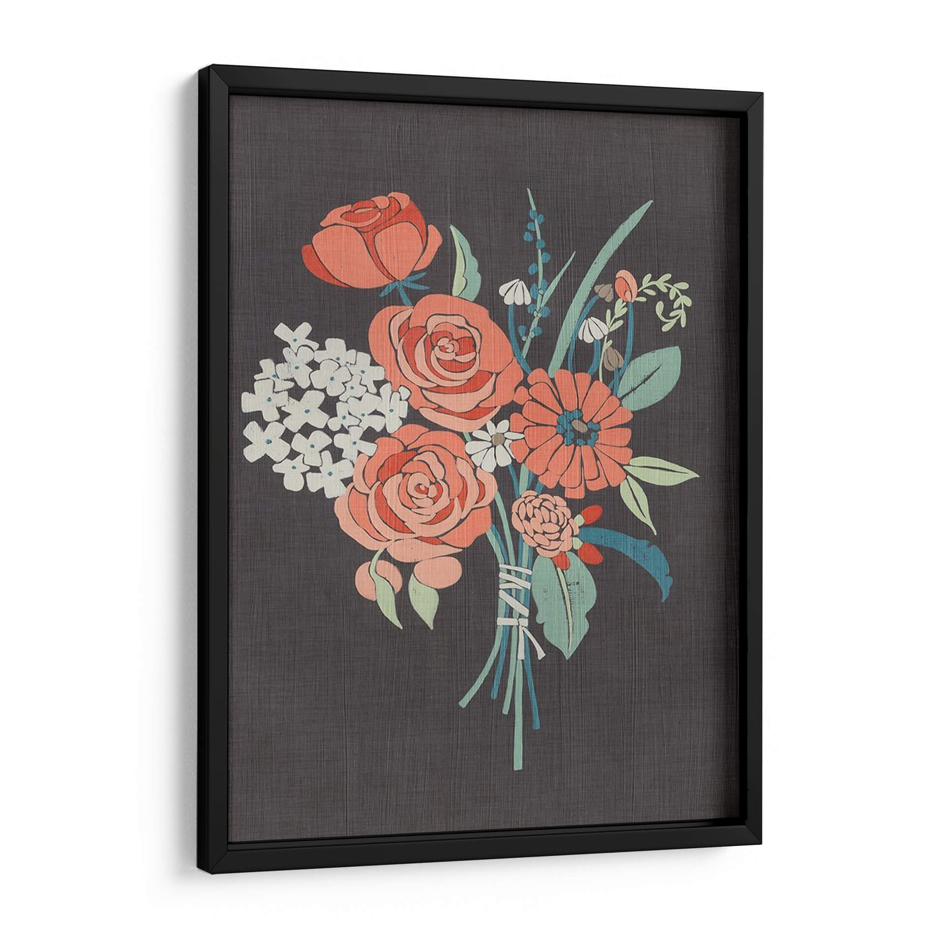 Embellece tu espacio con el cuadro decorativo 'Bouquet Coral II' de Chariklia Zarris. Esta cautivadora obra de arte presenta un vibrante ramillete de flores en tonos coral, blanco y verde, sobre un fondo texturizado de carbón profundo. Las rosas, anémonas y delicadas flores silvestres se entrelazan en una composición armoniosa que evoca la belleza efímera de la naturaleza. La paleta de colores, con sus cálidos corales contrastando elegantemente con el fondo oscuro y toques de azul y verde, crea una atmósfera sofisticada y acogedora. El estilo, que fusiona elementos del arte botánico con un toque moderno y estilizado, lo hace perfecto para una variedad de decoraciones interiores. Imagina este cuadro como un punto focal en tu sala de estar, aportando un toque de color y vida, o como una pieza serena para tu dormitorio u oficina. 'Bouquet Coral II' no es solo una decoración, es una expresión de alegría y vitalidad que transformará cualquier ambiente, invitando a la contemplación y al aprecio por la belleza floral. Una elección exquisita para quienes buscan añadir personalidad y un toque artístico contemporáneo a sus paredes.