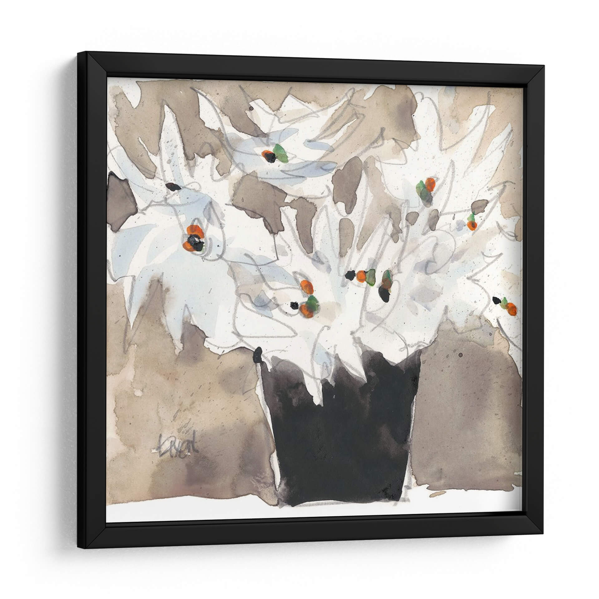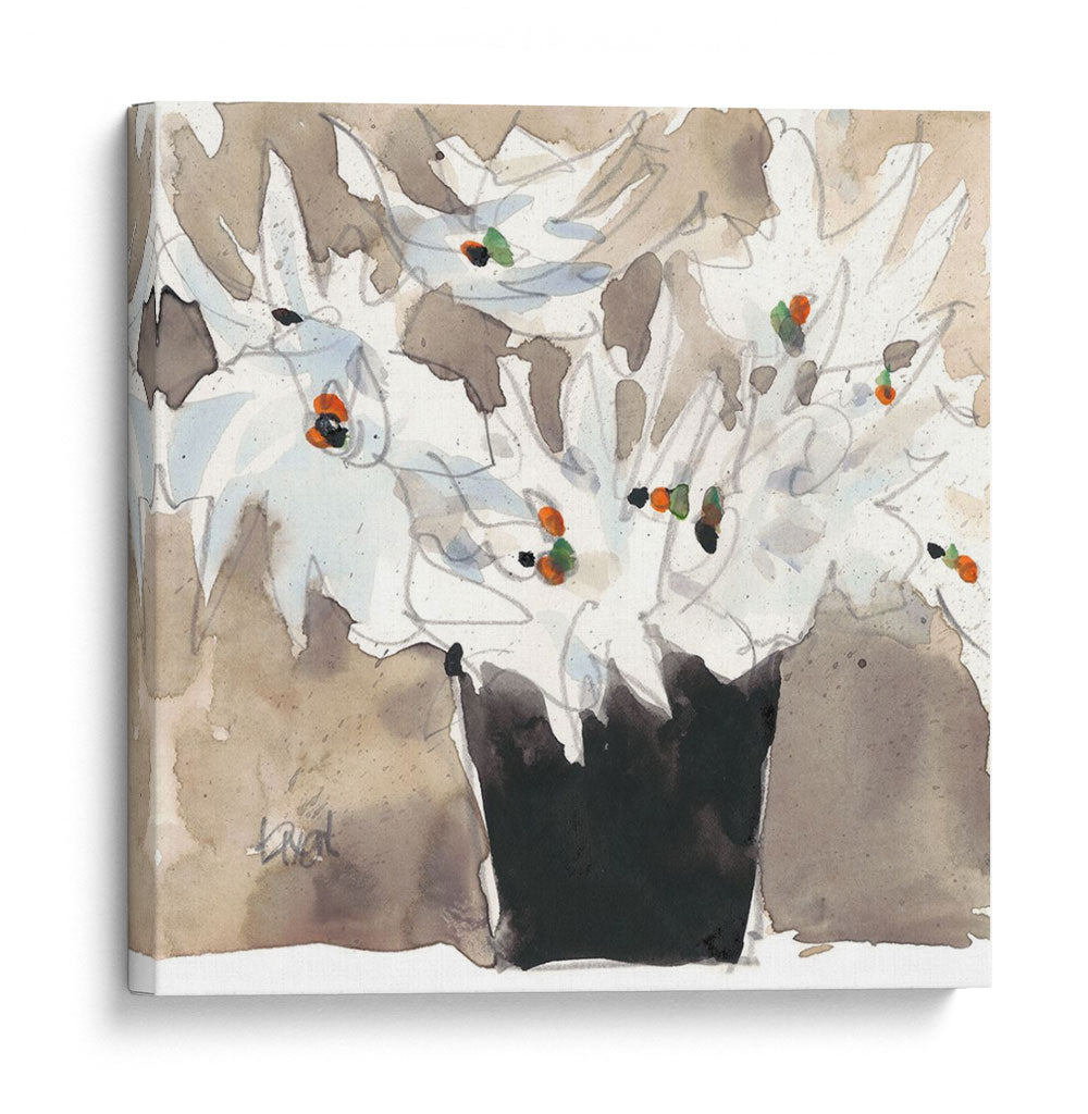 Sumérgete en la delicadeza y el encanto floral con "Bouquet Wild II", una obra de arte que captura la esencia de la naturaleza con pinceladas etéreas y una paleta de colores suave y terrosa. Samuel Dixon nos presenta un arreglo floral que, a pesar de su título, emana una sensación de calma y sofisticación. Las flores blancas, representadas con trazos sueltos y expresivos, parecen danzar sobre un fondo texturizado en tonos beige y marrones, creando una profundidad sutil y una atmósfera acogedora. Los toques vibrantes de naranja y verde en los centros de las flores añaden puntos de interés visual, contrastando delicadamente con la serenidad predominante. Este cuadro decorativo es ideal para aquellos que buscan infundir paz y elegancia en sus hogares u oficinas. Su estilo contemporáneo y la ejecución en acuarela le otorgan una ligereza y frescura únicas, perfectas para complementar decoraciones modernas, minimalistas o bohemias. Imagina este lienzo aportando un rincón de naturaleza y arte a tu sala de estar, dormitorio o estudio, invitando a la contemplación y al disfrute estético.