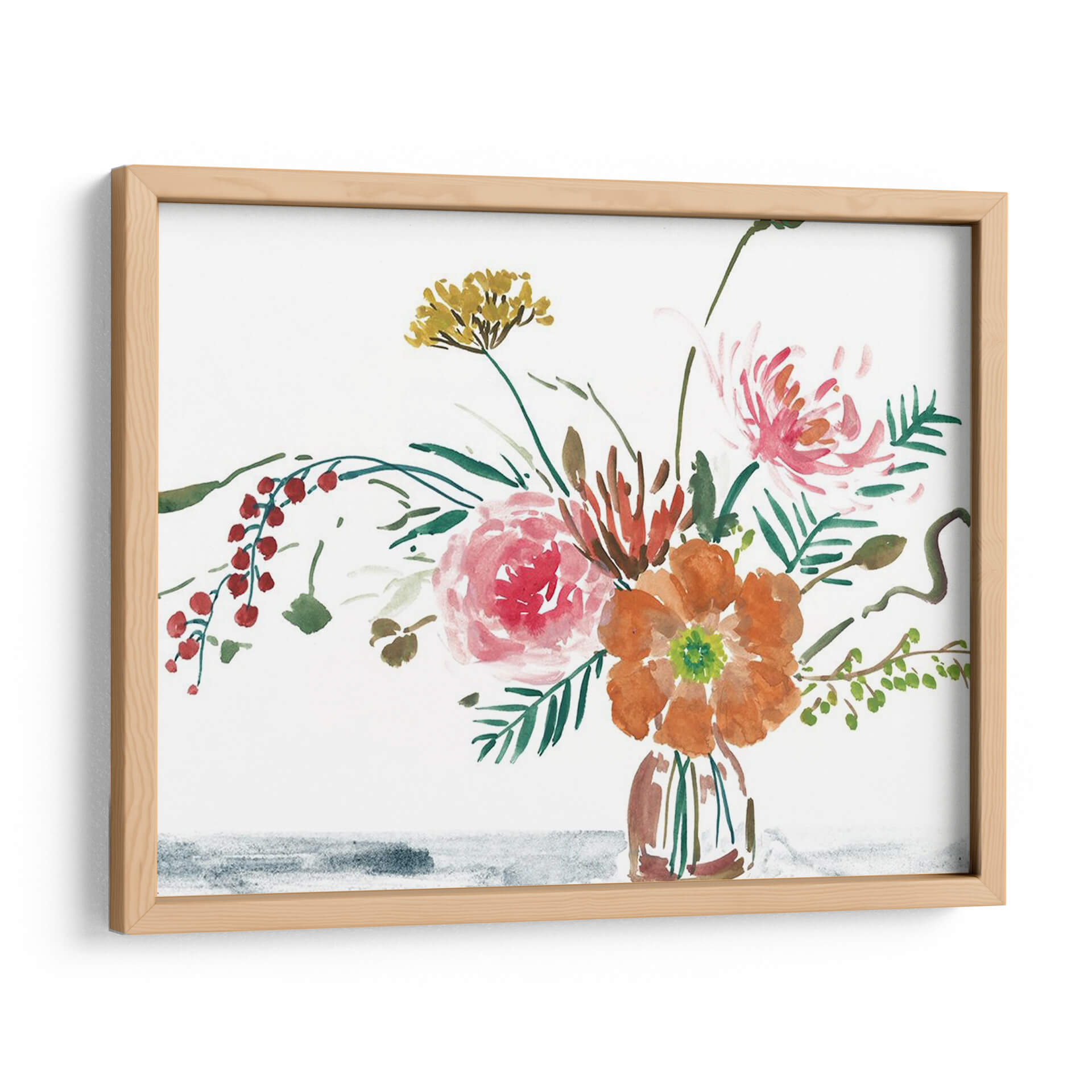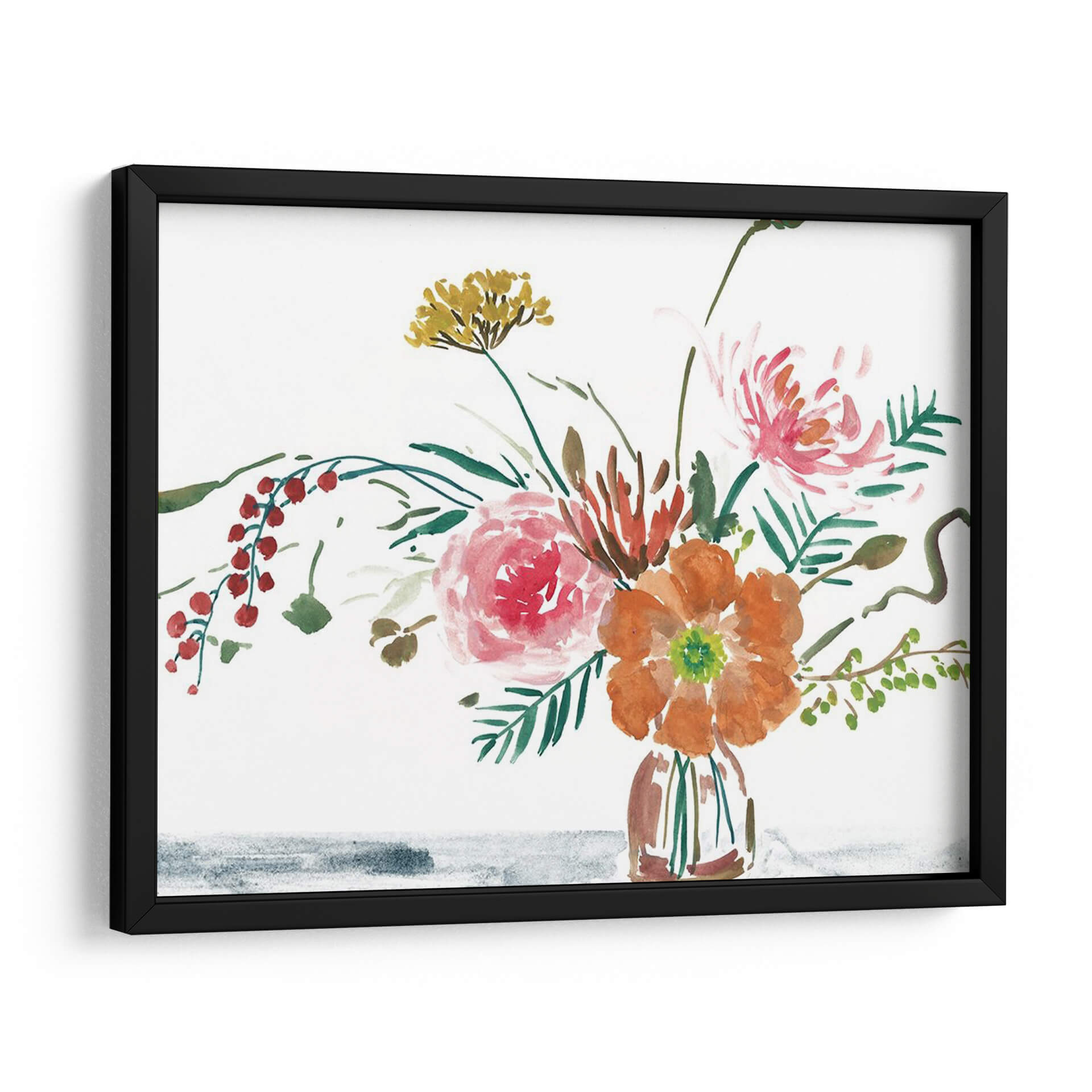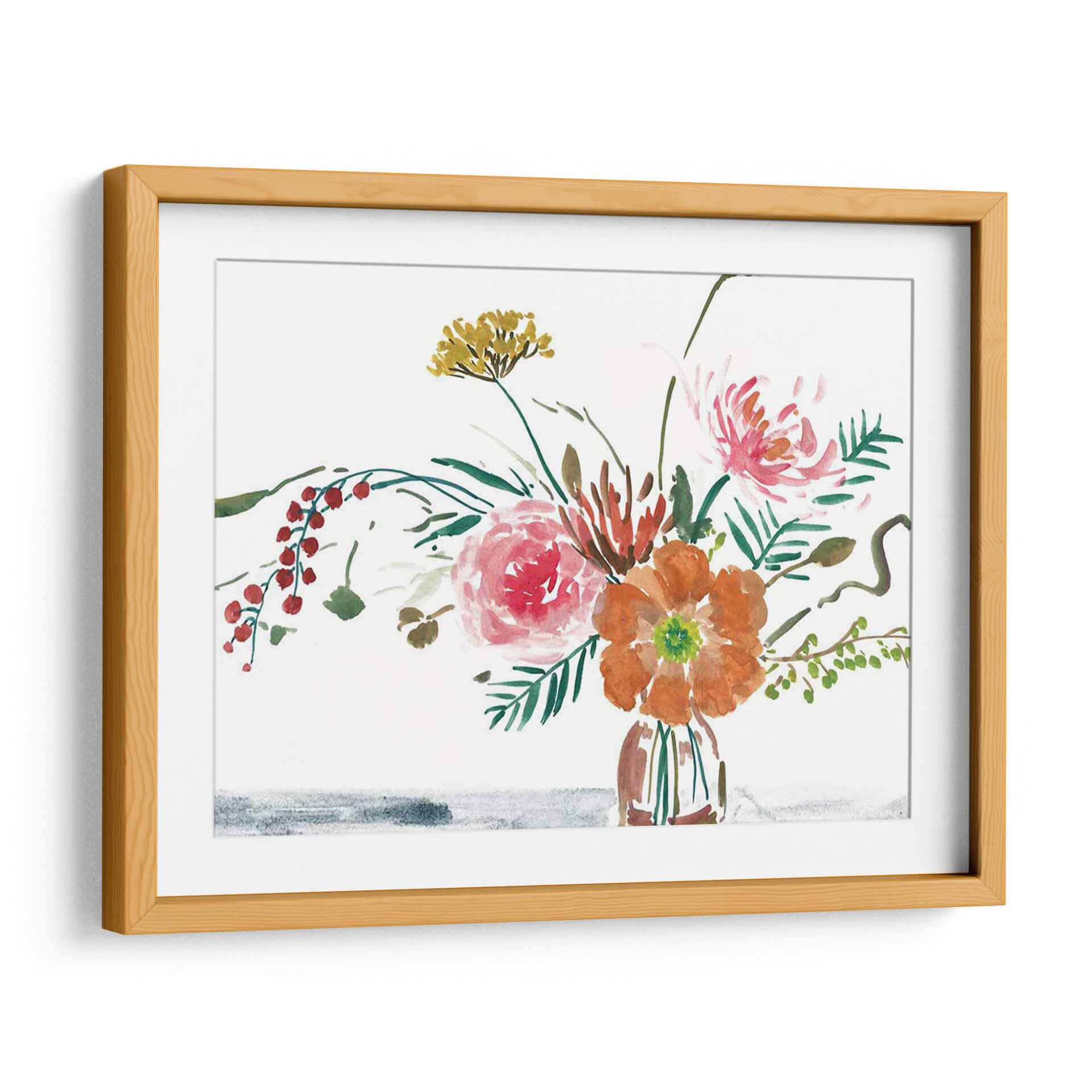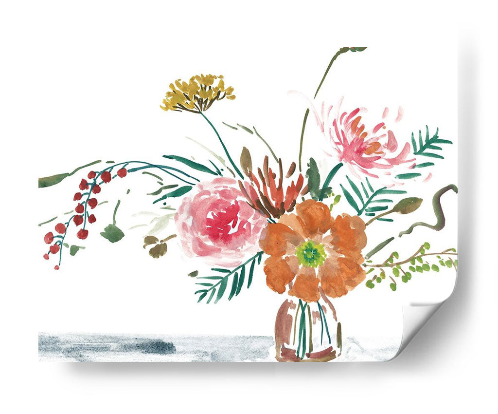 Celebra la belleza efímera de la naturaleza con "Celebración Bouquet II", una obra de arte cautivadora de Melissa Wang. Este cuadro decorativo captura la vitalidad de un arreglo floral vibrante a través de pinceladas sueltas y etéreas que evocan la técnica de la acuarela. La composición se centra en un exuberante bouquet que desborda energía y color, con flores en tonos rosados, anaranjados intensos y toques de rojo y amarillo, rodeadas de follaje verde y bayas delicadas. La paleta de colores cálidos y alegres infunde una sensación de optimismo y frescura, mientras que el fondo blanco y la base sutilmente texturizada en tonos grises aportan serenidad y un aire de delicadeza. Perfecta para añadir un toque de vida y sofisticación a cualquier estancia, este cuadro es ideal para salones modernos, comedores o incluso como pieza central en un dormitorio, aportando un aire de jardín interior. La técnica impresionista y el estilo contemporáneo de Melissa Wang logran una pieza que es a la vez delicada y audaz, invitando a la contemplación y aportando una atmósfera de alegría y vitalidad a tu hogar u oficina. Es una adición encantadora para quienes buscan arte floral que inspire y renueve el espíritu.