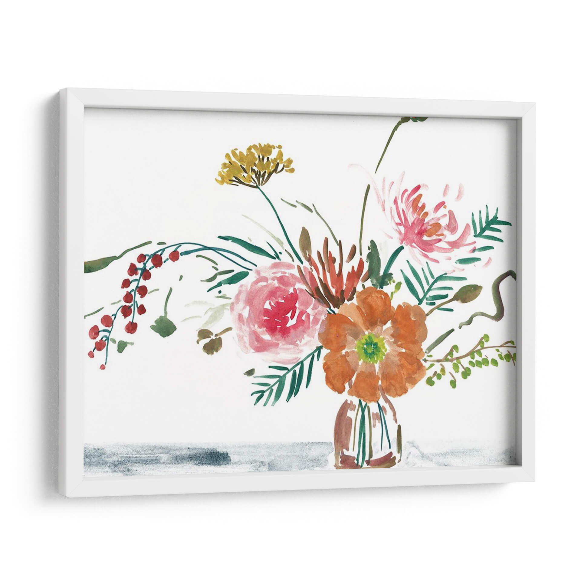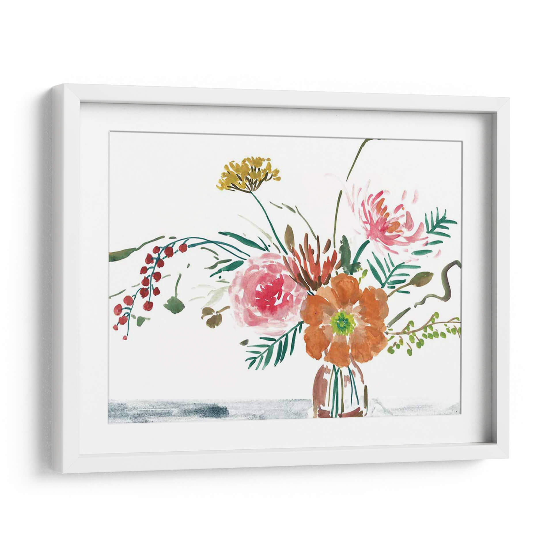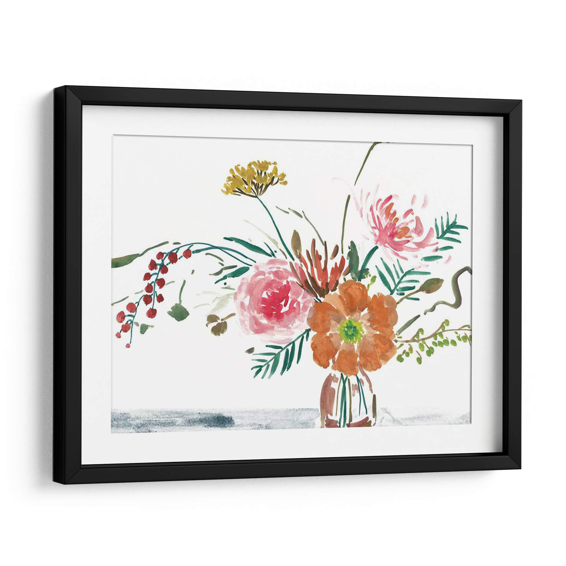 Celebra la belleza efímera de la naturaleza con "Celebración Bouquet II", una obra de arte cautivadora de Melissa Wang. Este cuadro decorativo captura la vitalidad de un arreglo floral vibrante a través de pinceladas sueltas y etéreas que evocan la técnica de la acuarela. La composición se centra en un exuberante bouquet que desborda energía y color, con flores en tonos rosados, anaranjados intensos y toques de rojo y amarillo, rodeadas de follaje verde y bayas delicadas. La paleta de colores cálidos y alegres infunde una sensación de optimismo y frescura, mientras que el fondo blanco y la base sutilmente texturizada en tonos grises aportan serenidad y un aire de delicadeza. Perfecta para añadir un toque de vida y sofisticación a cualquier estancia, este cuadro es ideal para salones modernos, comedores o incluso como pieza central en un dormitorio, aportando un aire de jardín interior. La técnica impresionista y el estilo contemporáneo de Melissa Wang logran una pieza que es a la vez delicada y audaz, invitando a la contemplación y aportando una atmósfera de alegría y vitalidad a tu hogar u oficina. Es una adición encantadora para quienes buscan arte floral que inspire y renueve el espíritu.