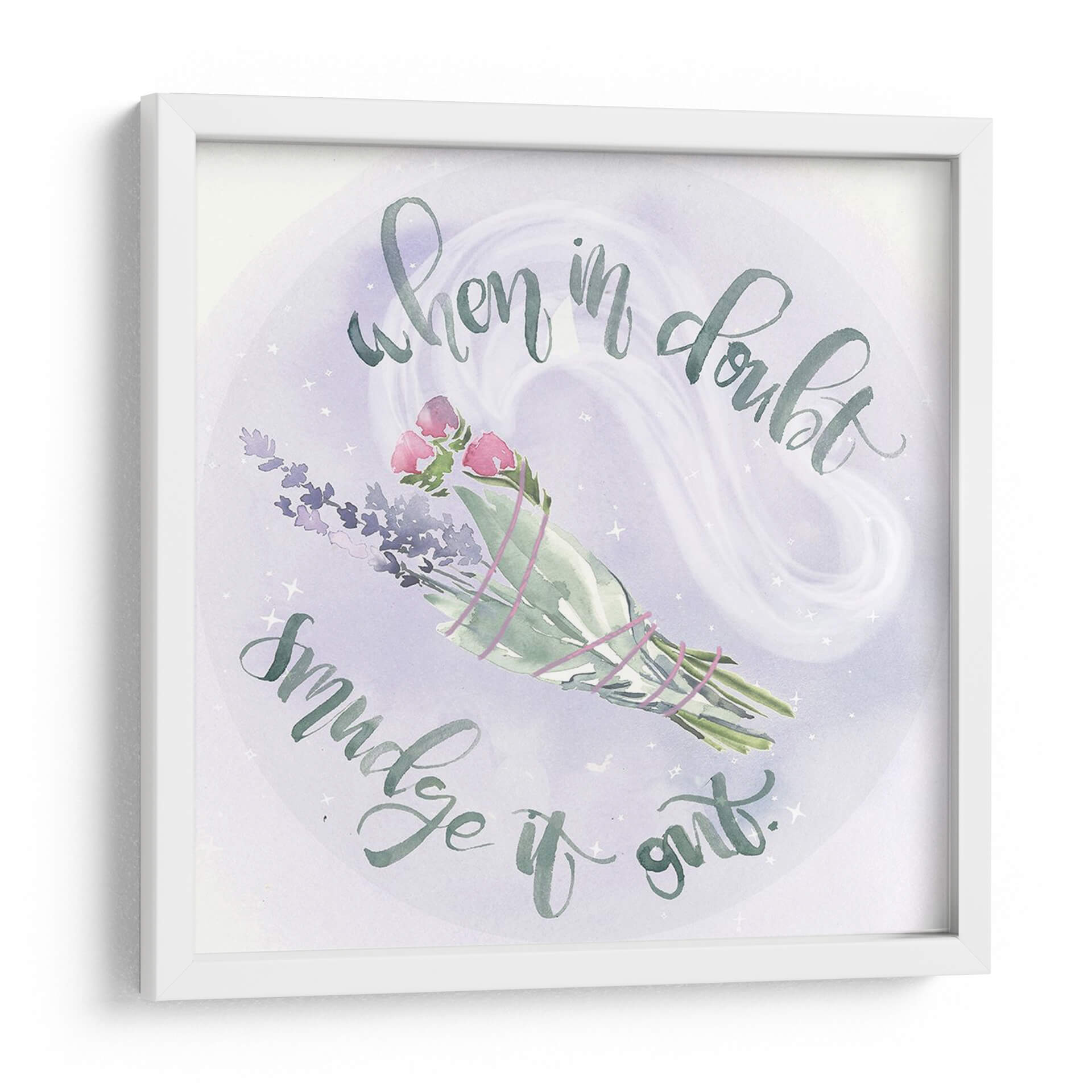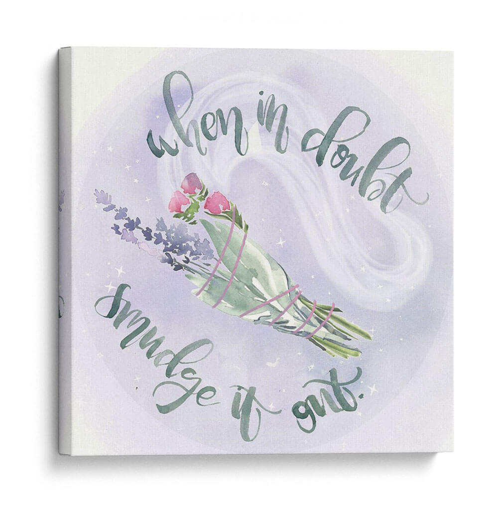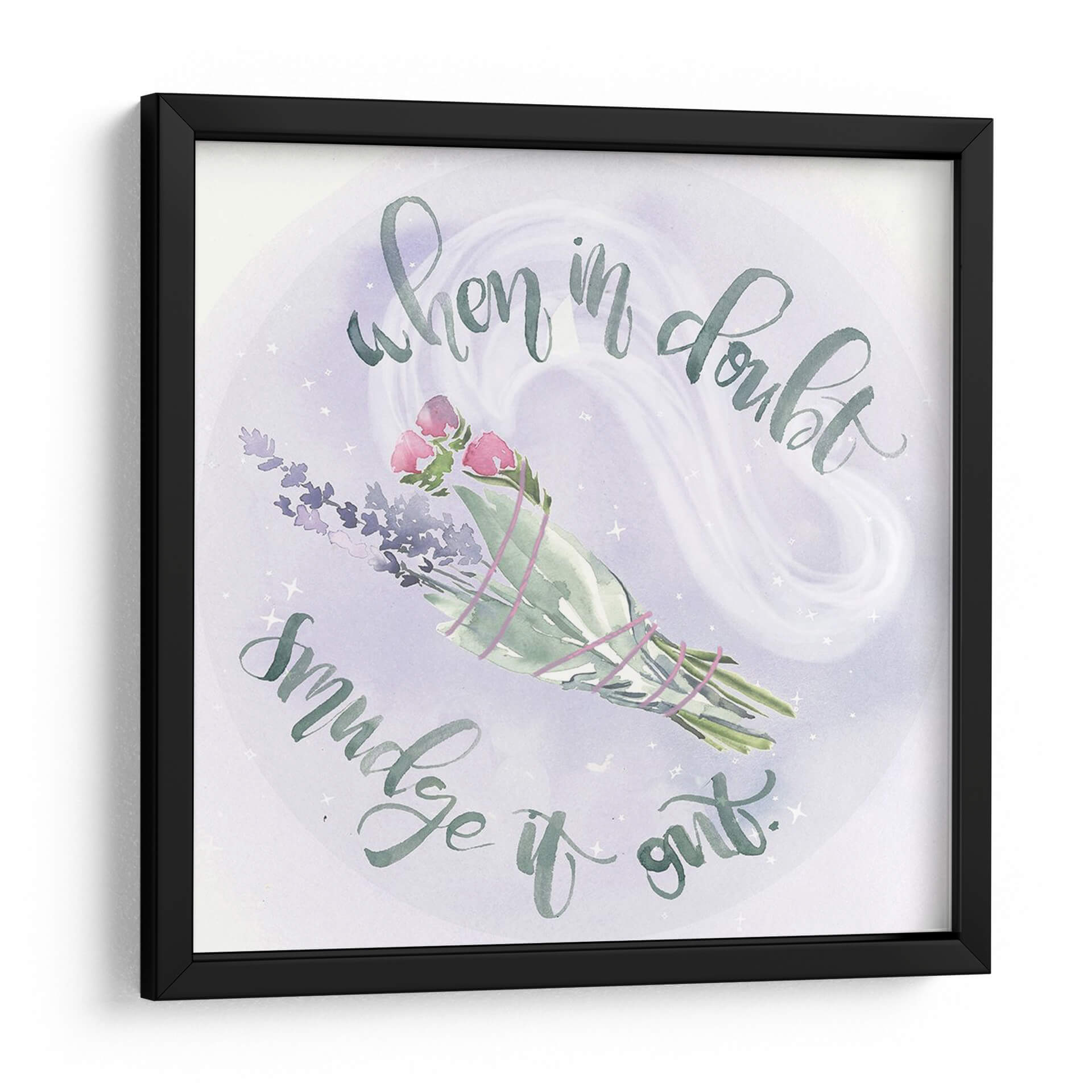 Transmite serenidad y positividad a tu hogar con esta encantadora obra de arte "Colección De Bruja Verde C" de Jennifer Paxton Parker. La pieza presenta un delicado ramo de salvia y lavanda, elementos tradicionalmente asociados con la purificación y la calma, atado con una cinta rosada. El texto caligráfico "when in doubt, smudge it out" (en español, "en caso de duda, límpialo/purifícalo") añade un toque de sabiduría práctica y un recordatorio suave para buscar claridad. La paleta de colores predominante en tonos lila y violeta, con sutiles toques de rosa y verde, crea una atmósfera etérea y relajante, evocando un sentido de espiritualidad y bienestar. El estilo de acuarela aporta una suavidad y fluidez únicas a la composición, con un fondo que simula un remolino de energía suave o un cielo estrellado. Este cuadro decorativo es ideal para espacios donde se busca fomentar la paz interior, como dormitorios, estudios o áreas de meditación. Su mensaje inspirador y su estética delicada lo convierten en un punto focal perfecto para añadir carácter y una vibra serena a cualquier ambiente moderno o bohemio. Una pieza que no solo embellece, sino que también inspira.