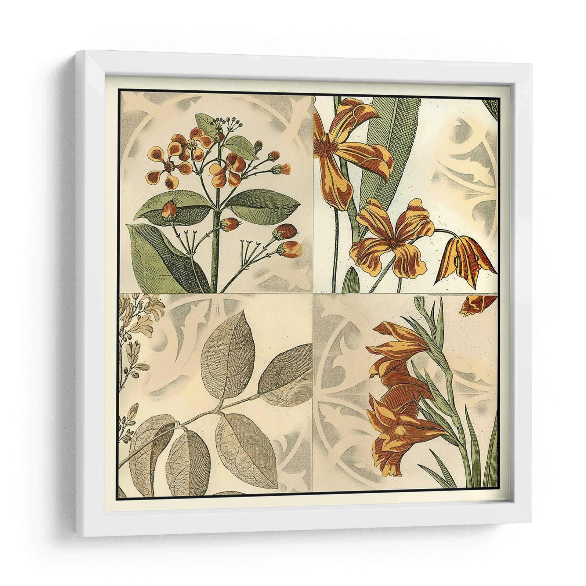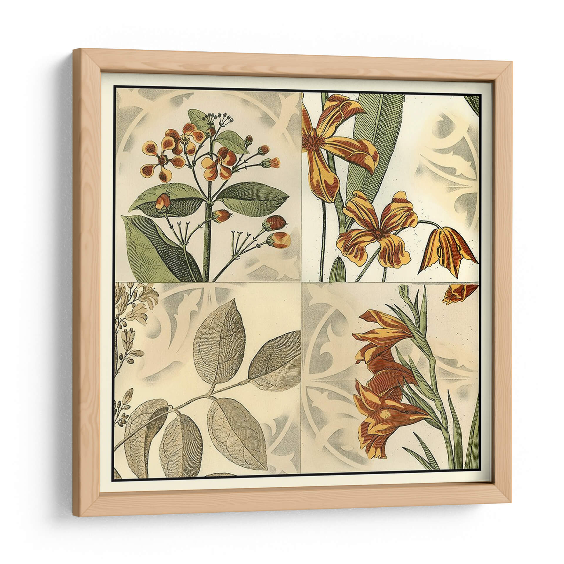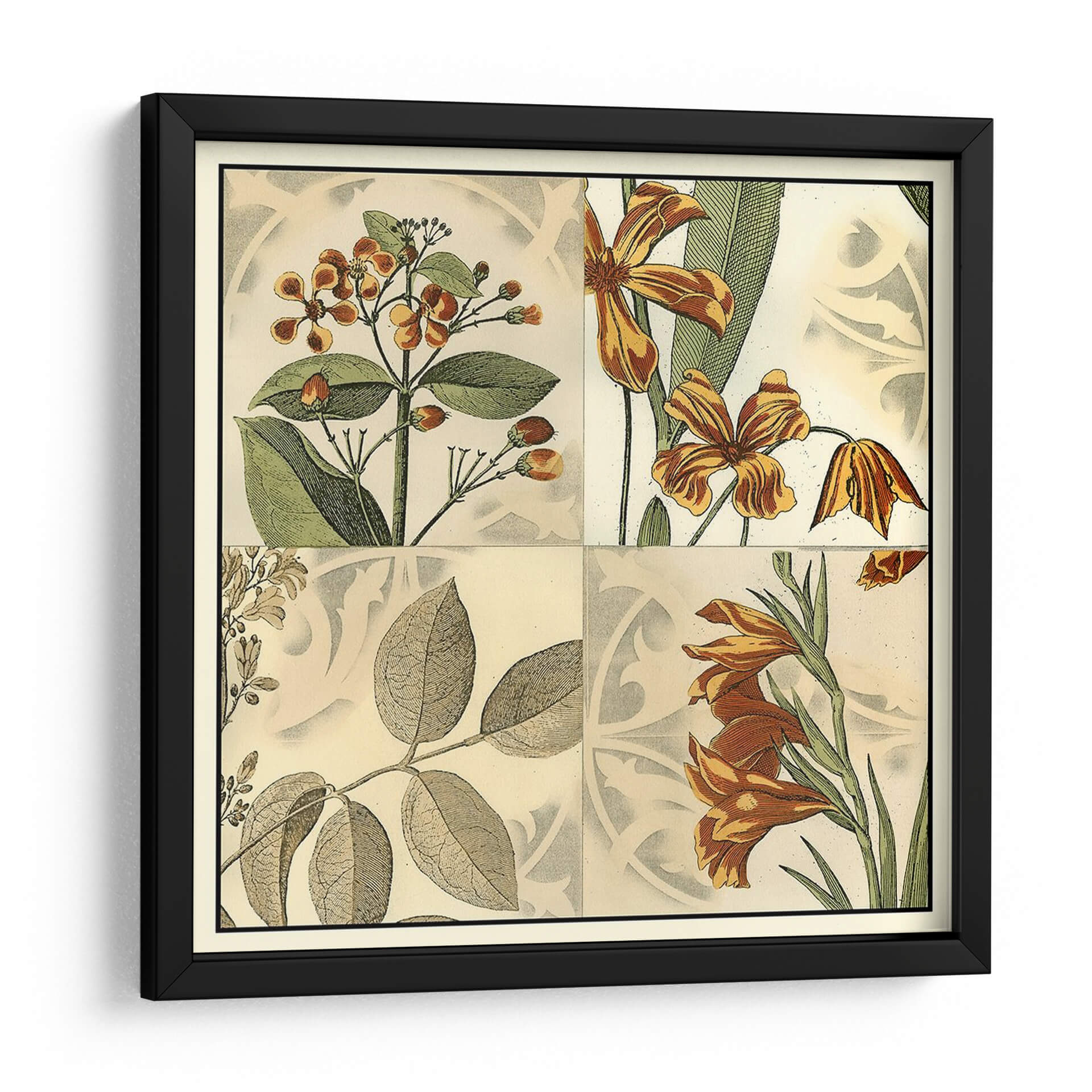 Transforma tu espacio con el "Cuadrante Botánico Iv", una cautivadora obra de arte que evoca la belleza atemporal de la naturaleza. Este cuadro decorativo presenta una composición dividida en cuadrantes, cada uno detallando exquisitas ilustraciones botánicas. Los tonos cálidos de naranjas, marrones y verdes se entrelazan con un fondo de textura sutil, creando una atmósfera de elegancia y serenidad. Las flores representadas, con sus pétalos detallados y vibrantes colores, invitan a la contemplación, mientras que las hojas aportan un toque de frescura y vitalidad. El estilo, que recuerda a las antiguas láminas de botánica, añade un aire de sofisticación clásica, perfecto para quienes aprecian el arte con historia y detalle. Ideal para salones, comedores o estudios, este cuadro aportará un punto focal de interés natural y un soplo de aire fresco a cualquier decoración. Su diseño versátil se adapta a interiores tanto modernos como tradicionales, añadiendo un toque de color y vida que inspira calma y aprecio por el mundo natural.
