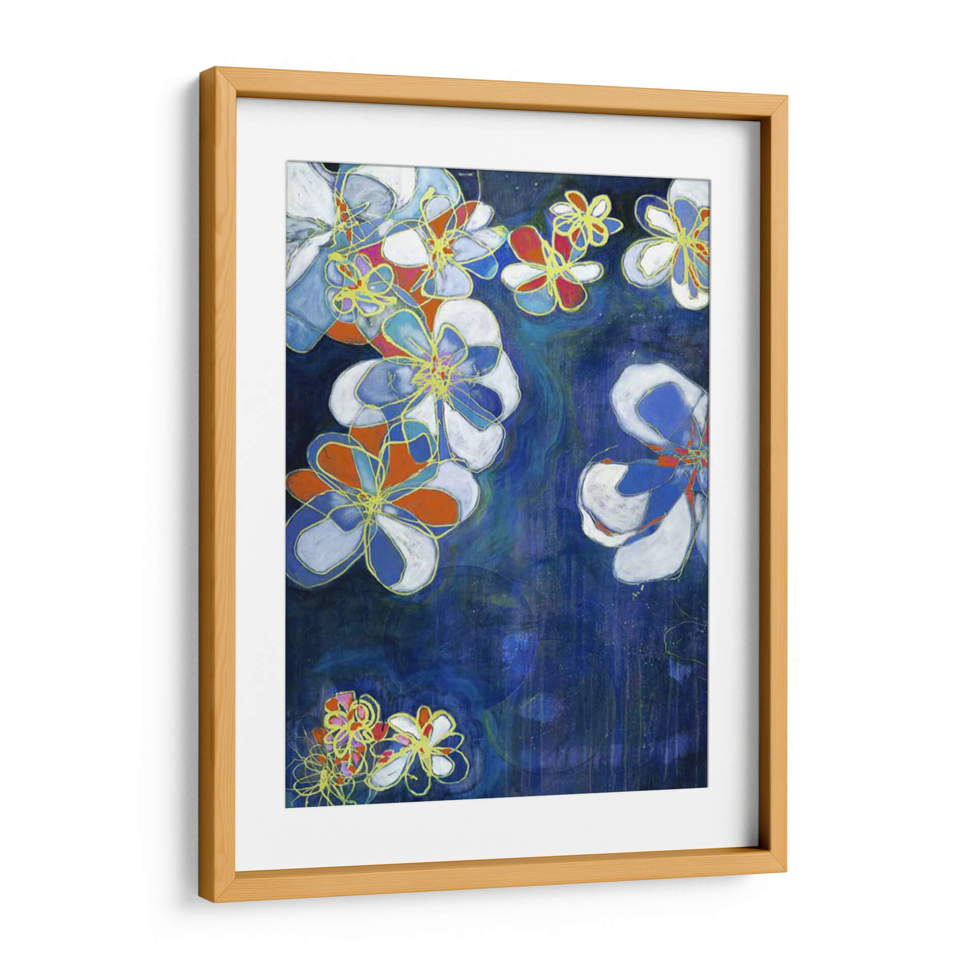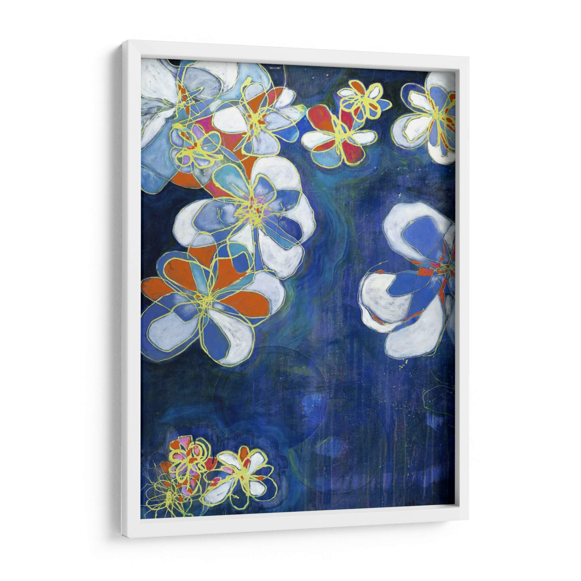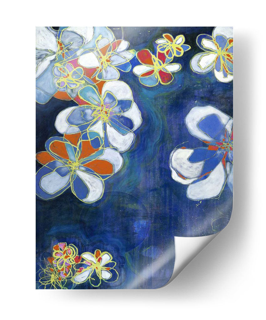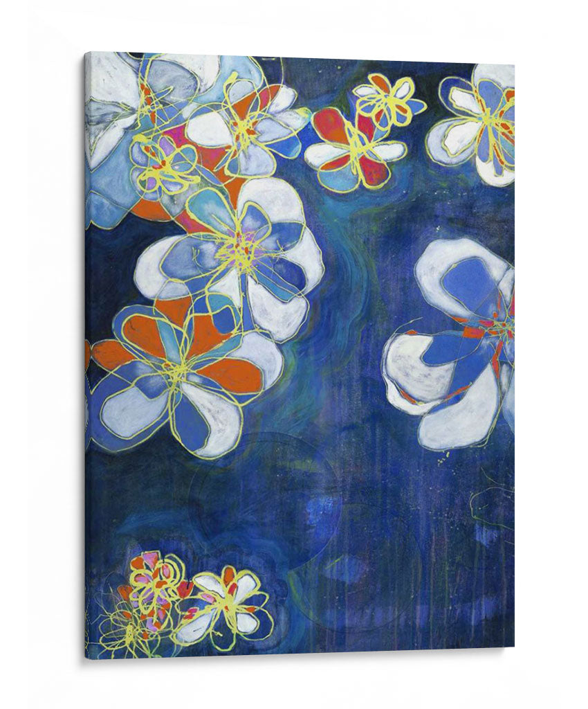 Sumérgete en la enigmática belleza de "Floraciones Nocturnas I", una obra de arte contemporáneo que captura la esencia de las flores bajo el velo de la noche. Jodi Fuchs nos presenta una composición vibrante donde las formas florales, delineadas con trazos audaces en color dorado, emergen de un profundo y texturizado fondo azul. Los pétalos se visten de blanco puro, intensos toques de naranja y vibrantes azules, creando un contraste dinámico que atrae la mirada. La técnica de pintura sugiere una profundidad y un movimiento acuoso, casi como si las flores flotaran en un estanque oscuro, añadiendo una capa de misterio y serenidad. Esta pieza es ideal para añadir un toque de sofisticación moderna y un estallido de color a cualquier espacio, ya sea una sala de estar, un dormitorio o un estudio. "Floraciones Nocturnas I" no es solo un cuadro, es una invitación a contemplar la belleza efímera de la naturaleza reimaginada por el arte contemporáneo, convirtiéndose en el punto focal perfecto para interiores que buscan expresar individualidad y buen gusto. Transforma tu hogar con esta pieza evocadora que combina lo orgánico con lo abstracto de manera magistral.