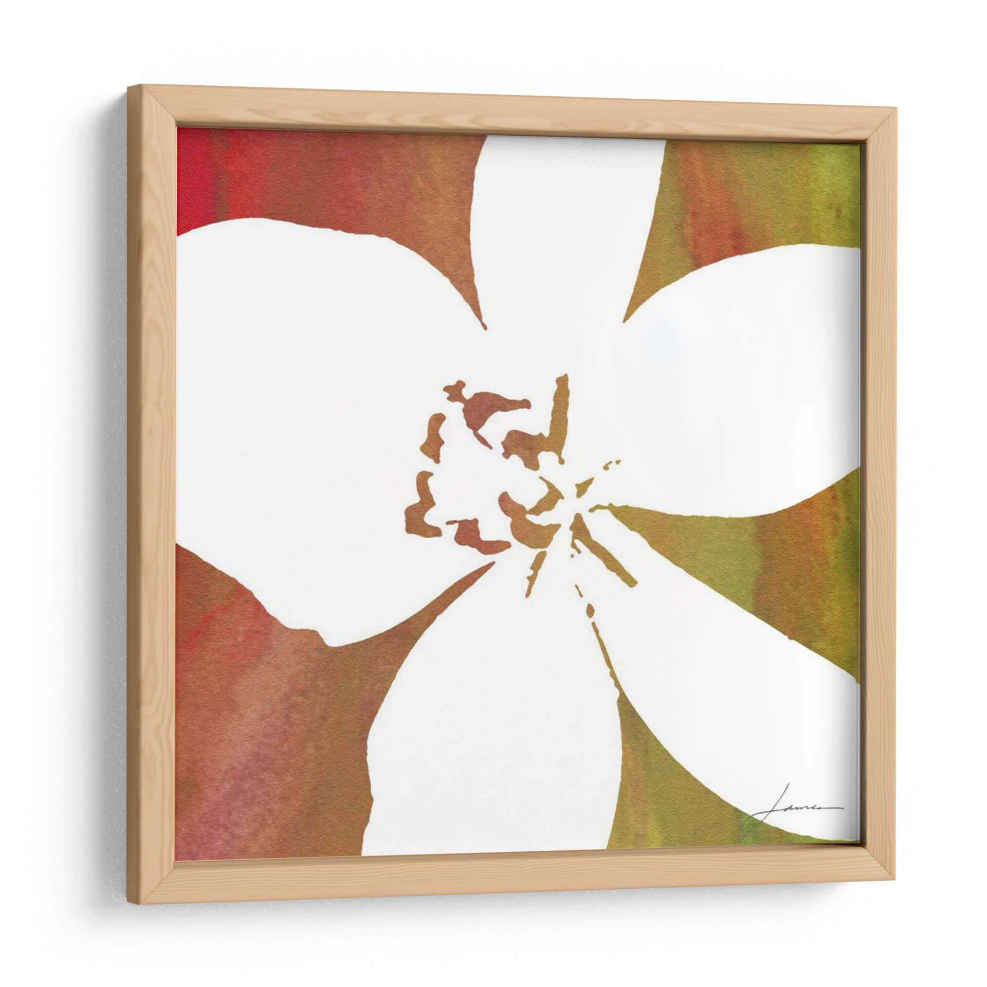 Sumérgete en la serenidad y la belleza natural con 'Flores De Paz II' de James Burghardt, una obra de arte que captura la esencia de una flor en plena floración. Esta pieza destaca por su contraste cautivador: un pétalo blanco nítido y minimalista que emerge sobre un fondo vibrante y texturizado, donde los tonos cálidos del rojo y el dorado se funden con verdes terrosos en un estilo acuarela abstracto. La composición, centrada en la delicadeza de la flor, invita a la contemplación y aporta una sensación de calma y armonía a cualquier espacio. El estilo artístico, que combina elementos figurativos con un tratamiento abstracto del color, crea una profundidad visual única, haciendo de este cuadro decorativo una pieza versátil y moderna. Es ideal para añadir un toque de elegancia y tranquilidad a salones, dormitorios, o estudios, complementando tanto decoraciones contemporáneas como más clásicas. Descubre cómo 'Flores De Paz II' puede transformar tu hogar en un oasis de paz y estilo, infundiendo serenidad y un toque de naturaleza refinada a tu ambiente.
