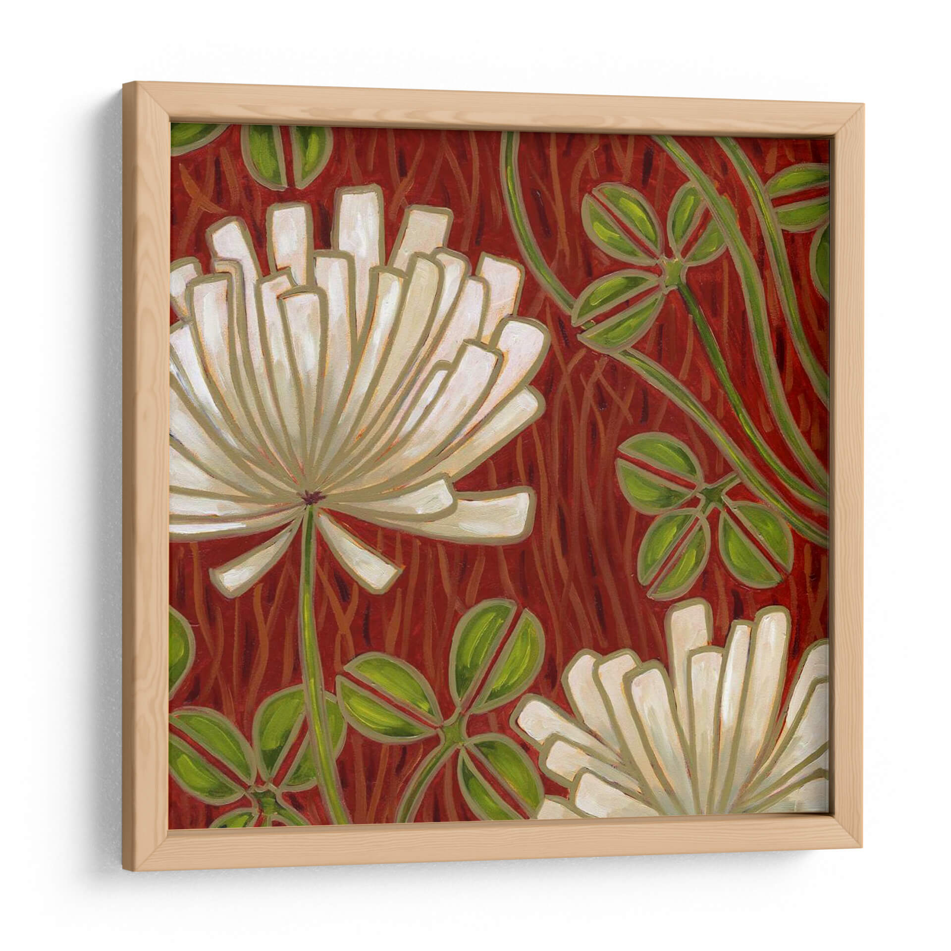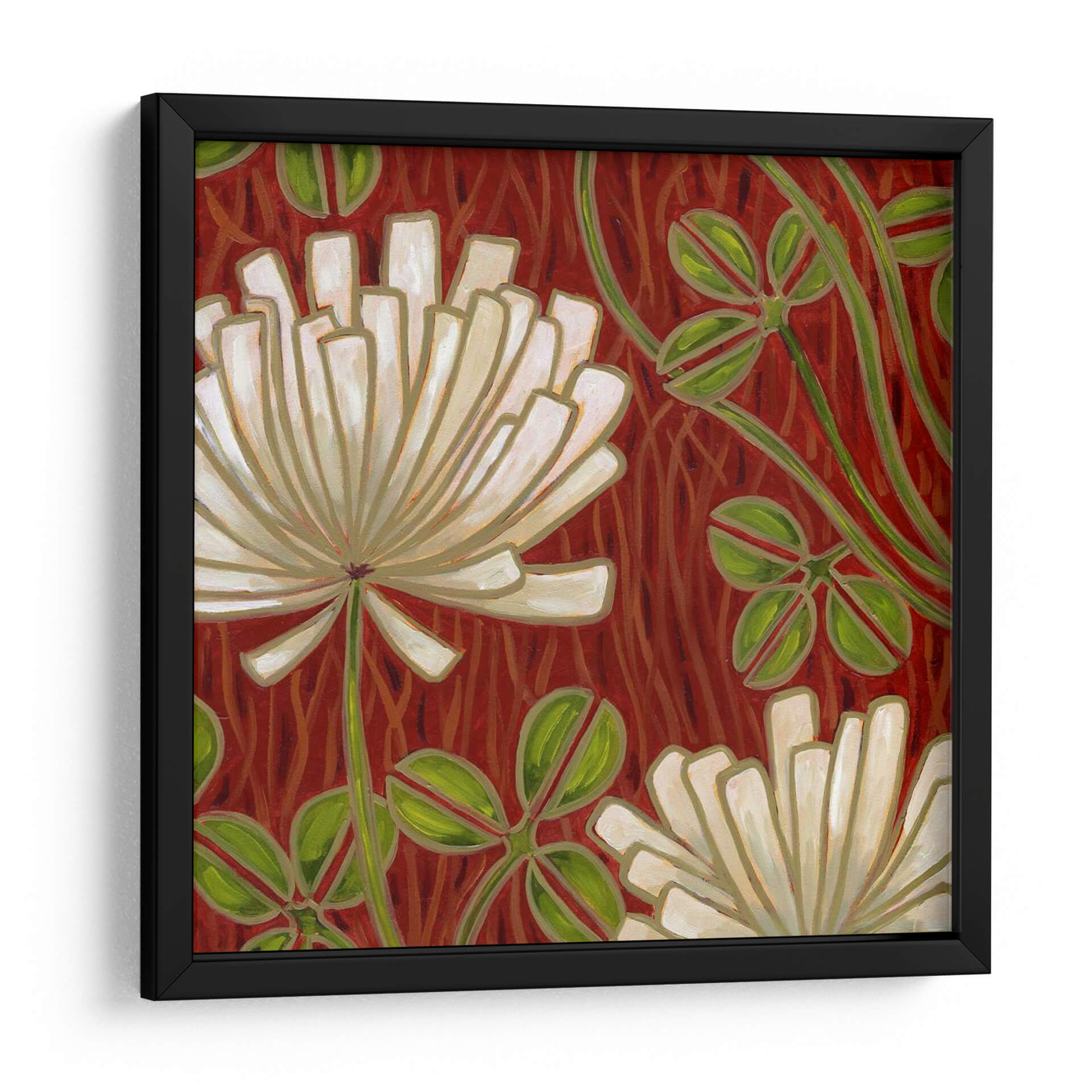 Adéntrate en la belleza botánica con "Gretchen I", una obra de arte decorativo que celebra la delicadeza de la naturaleza. Este cuadro presenta flores estilizadas en tonos blancos cremosos, con pétalos que se despliegan como abanicos, delineados sutilmente con un toque dorado que añade un aire de elegancia. Contrastan vivamente sobre un fondo profundo de color terracota rojizo, texturizado con finas pinceladas verticales que evocan la calidez de la tierra o incluso un patrón abstracto inspirado en la naturaleza. Las hojas de trébol, en un verde vibrante, añaden un toque de frescura y vitalidad, entrelazándose con gracia a través de la composición. El estilo de Karen Deans se inclina hacia una representación moderna y simplificada de formas orgánicas, creando una pieza que es a la vez orgánica y gráfica. "Gretchen I" irradia una sensación de calma y serenidad, pero con una energía subyacente aportada por el rico color de fondo. Este cuadro decorativo es perfecto para añadir un toque de sofisticación natural a cualquier sala de estar, dormitorio o estudio, fusionando la belleza atemporal de las flores con un enfoque contemporáneo que captura la mirada y eleva el espíritu de cualquier espacio.