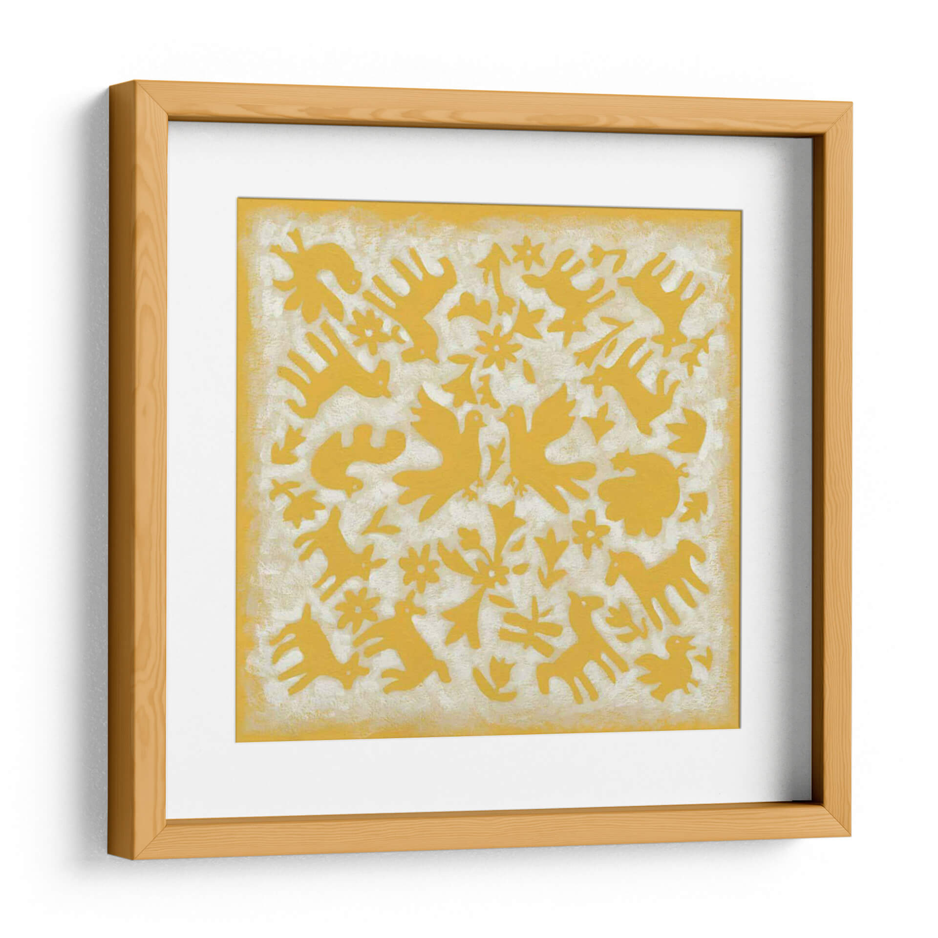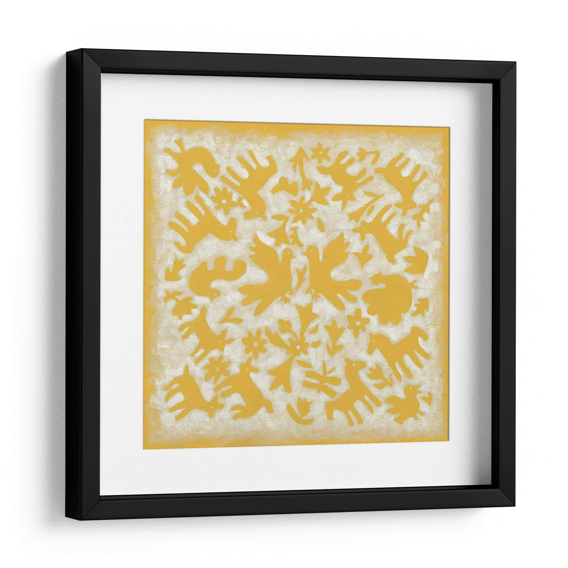 Sumérgete en la vibrante y cautivadora obra de arte 'Historia Popular En Amarillo' de Chariklia Zarris. Este cuadro decorativo irradia una energía alegre y optimista, con su intrincado diseño que presenta una variedad de figuras de animales y elementos florales estilizados, todos silueteados en un vibrante tono de amarillo. El fondo texturizado y de color claro crea un contraste sutil que realza los motivos centrales, aportando profundidad y un encanto rústico. La composición, aunque llena de elementos, mantiene una sensación de armonía y equilibrio, evocando una atmósfera de cuento de hadas o de folclore antiguo. Ideal para añadir un toque de color y personalidad a cualquier espacio, desde una sala de estar moderna hasta un dormitorio acogedor o una oficina creativa. Esta pieza es perfecta para aquellos que buscan infundir sus ambientes con alegría, tradición y un toque de magia artística. El estilo único de Zarris combina lo abstracto con lo figurativo, creando una narrativa visual que invita a la contemplación y al disfrute. Transforma tu hogar u oficina con este cuadro decorativo que celebra la riqueza de la imaginación y la calidez del color.