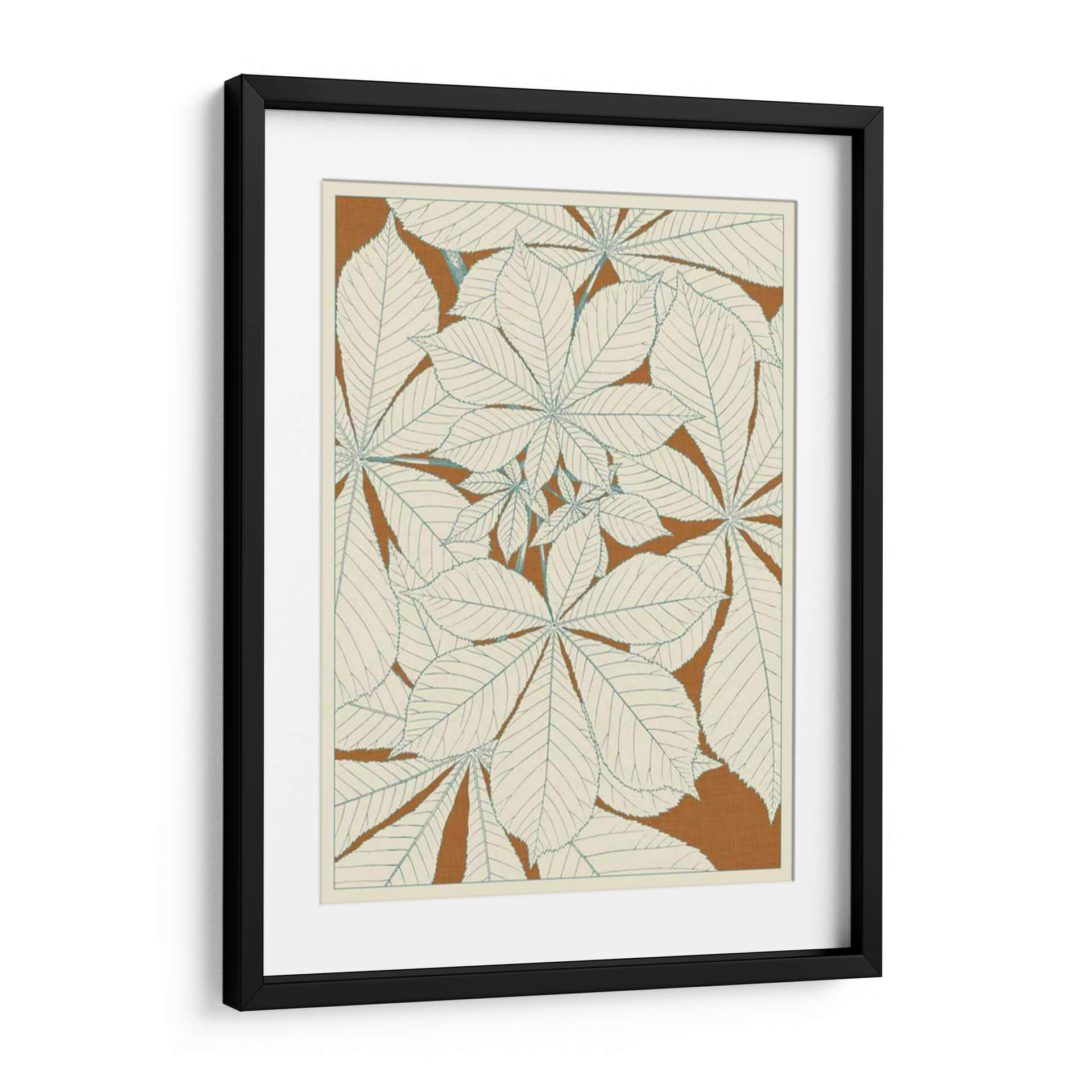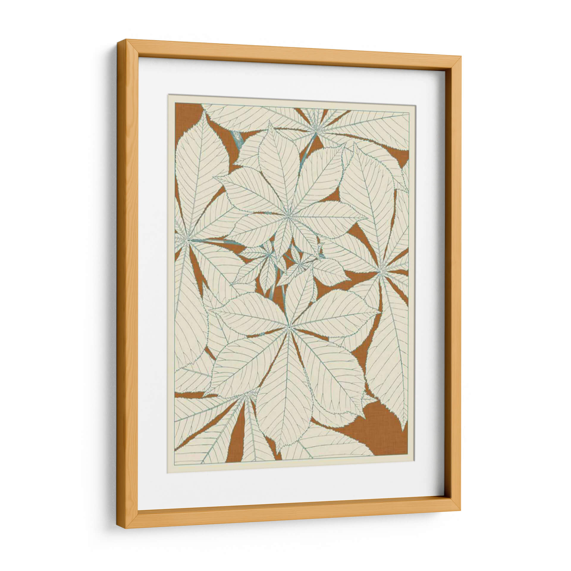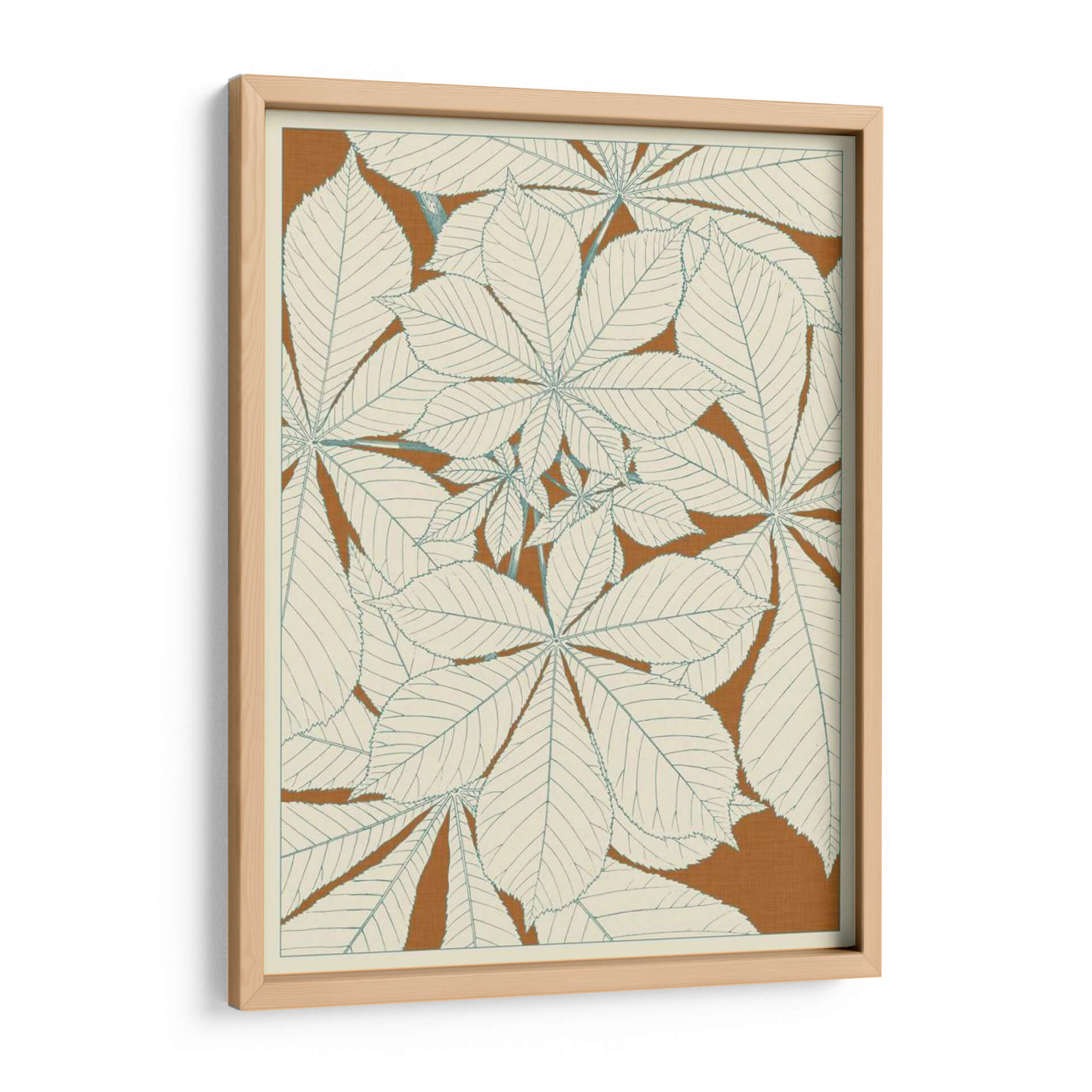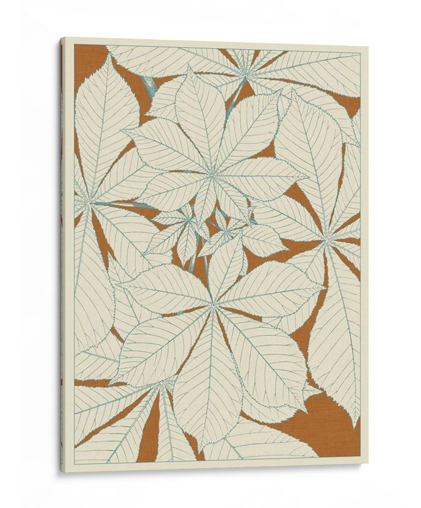 Sumérgete en la serenidad botánica con "Hojas de la Naturaleza I", una obra de arte decorativo que captura la delicadeza y la belleza intrínseca de la flora. Este cuadro presenta un diseño estilizado y repetitivo de hojas de castaño de indias, dibujadas con líneas finas y precisas en un tono azul pálido sobre un fondo cálido de color terracota. La composición, que evoca un estilo retro o vintage, utiliza un patrón denso pero armonioso que invita a la contemplación. Los colores, predominantemente neutros con toques sutiles, crean una atmósfera de calma y elegancia natural, perfecta para añadir un toque de sofisticación orgánica a cualquier espacio. Ideal para salones, dormitorios o estudios, esta pieza se integra fácilmente en decoraciones modernas, escandinavas o bohemias, aportando una sensación de conexión con la naturaleza y un aire de tranquilidad. Su diseño detallado y su paleta de colores suave la convierten en una adición atractiva para quienes buscan arte que sea a la vez moderno y atemporal, infundiendo paz y estilo en el hogar u oficina.