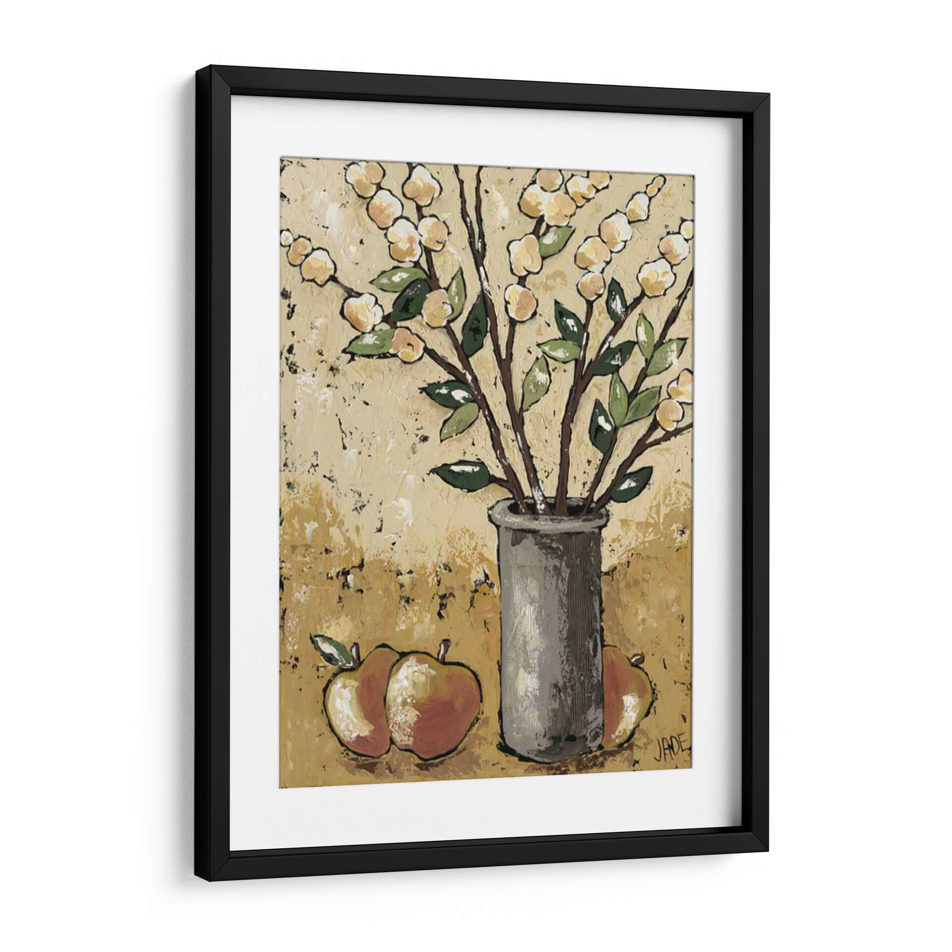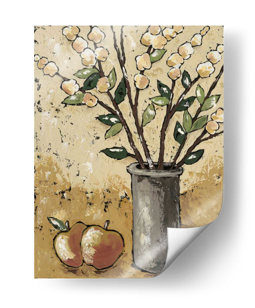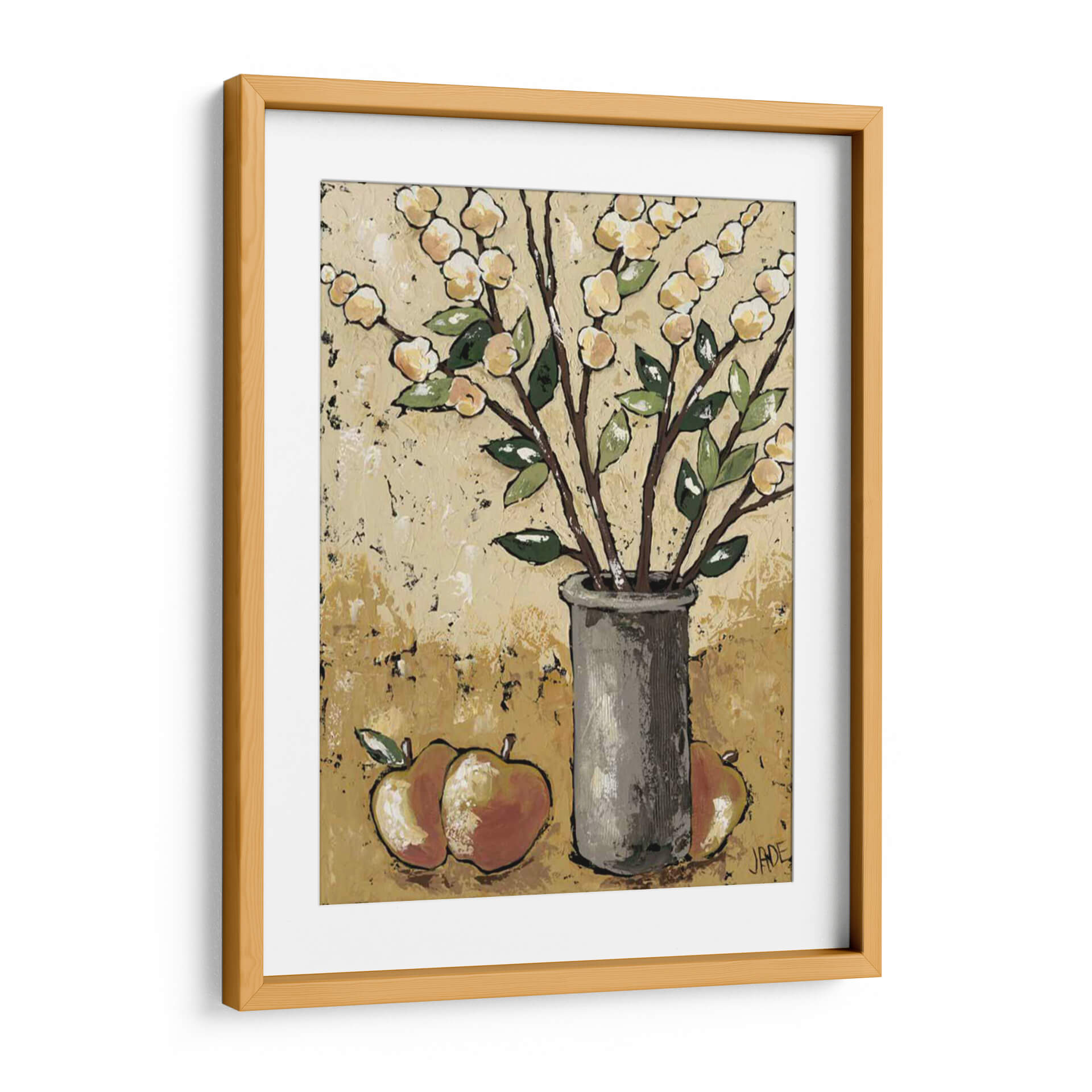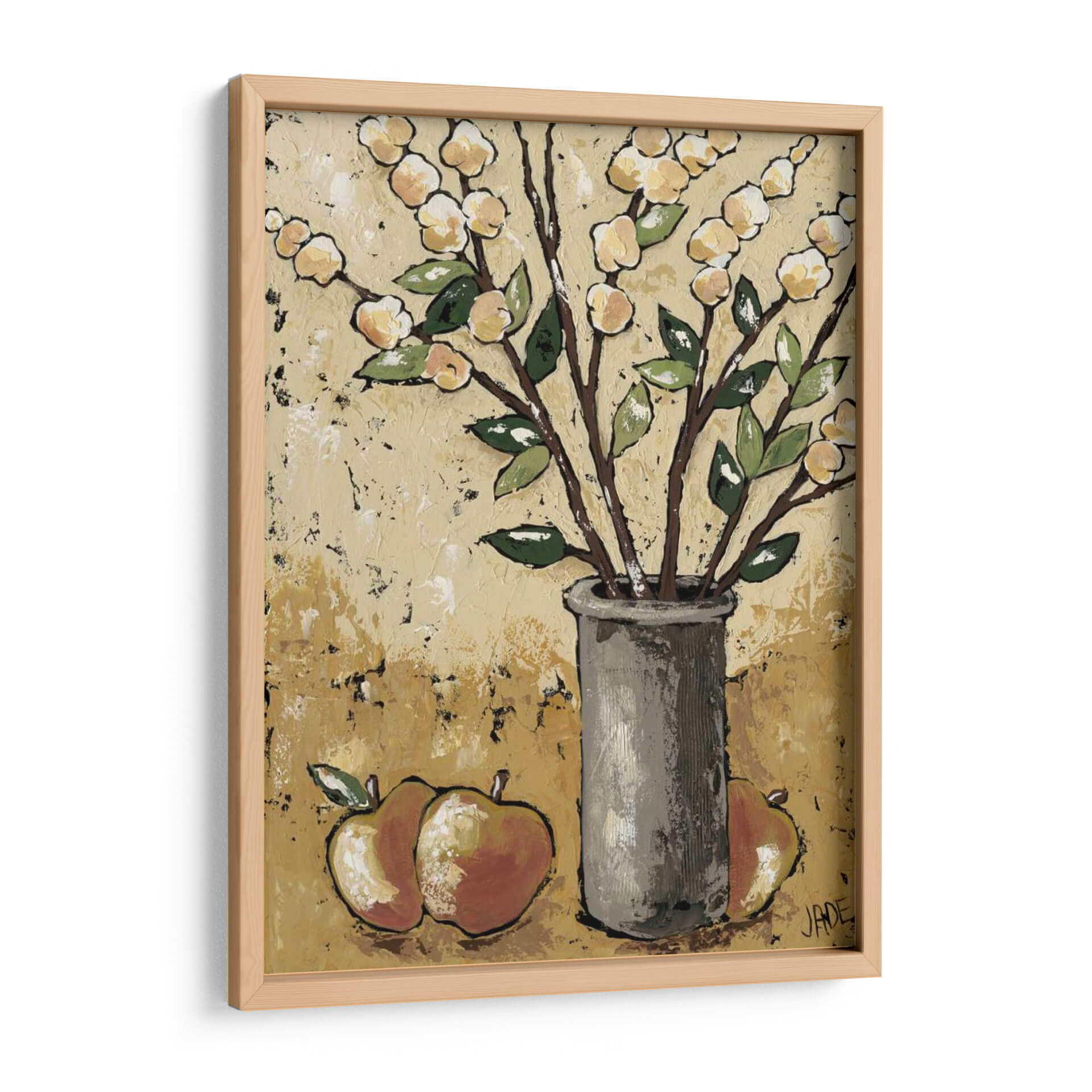 Sumérgete en la serenidad rústica de "Hojas Y Manzanas", una obra de Jade Reynolds que captura la esencia de la naturaleza con un toque de encanto artesanal. Este cuadro decorativo presenta un jarrón de estilo rústico que alberga delicadas ramas adornadas con hojas verdes y pequeñas flores en tonos crema y amarillo pálido. La composición se complementa con tres manzanas dispuestas en primer plano, aportando un elemento de realismo y calidez a la escena. La paleta de colores, dominada por tonos tierra, ocres y verdes sutiles, crea una atmósfera acogedora y orgánica, ideal para espacios que buscan un respiro de la rutina urbana. La textura visual, lograda a través de pinceladas audaces y un fondo con detalles que evocan la imperfección de la naturaleza, añade profundidad y carácter a la pieza. "Hojas Y Manzanas" es perfecta para quienes aprecian el arte contemporáneo con influencias botánicas y un estilo painterly. Colócala en tu sala de estar para un punto focal natural, en tu cocina para un toque campestre o en tu dormitorio para infundir calma y belleza. Es una adición versátil que aporta vida y textura a cualquier rincón, invitando a la contemplación y al disfrute de la simplicidad elegante.