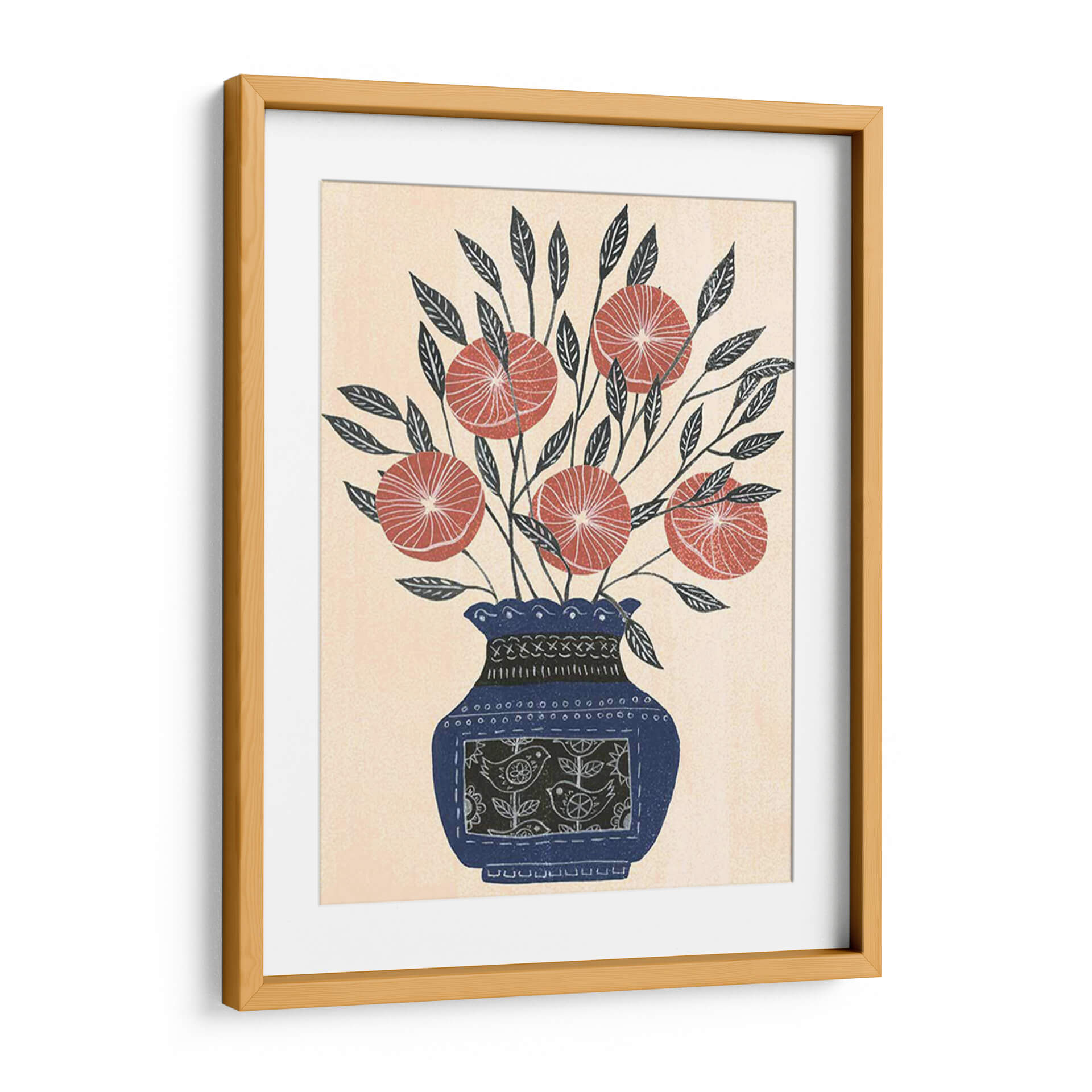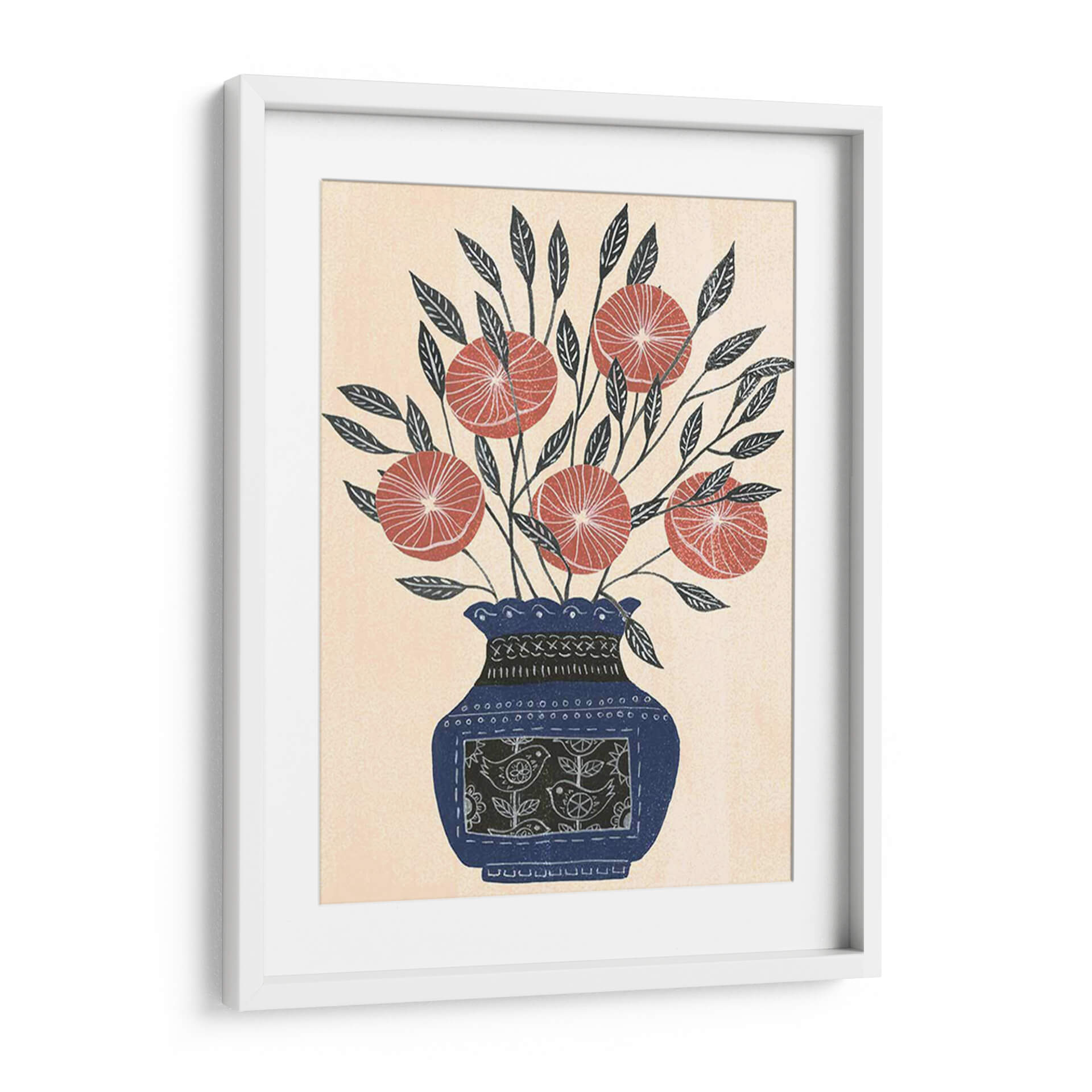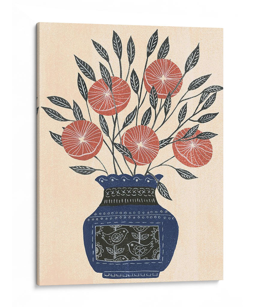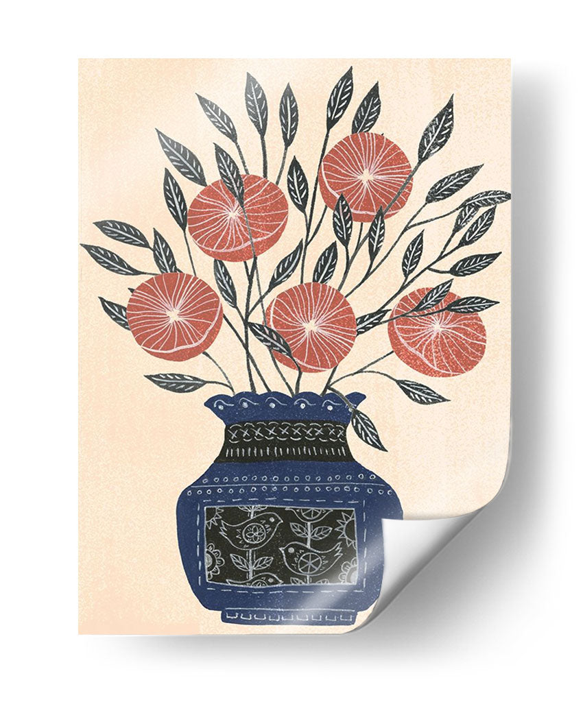Transforma tu espacio con la encantadora obra de arte "Jarrón de Flores I" de Melissa Wang. Este cuadro decorativo presenta un vibrante jarrón azul, adornado con un intrincado diseño que evoca la artesanía tradicional, rebosante de un ramo de flores estilizadas en tonos rojos anaranjados y hojas oscuras. La paleta de colores cálidos y terrosos, con un fondo cremoso, crea una atmósfera acogedora y serena, perfecta para añadir un toque de naturaleza y color a cualquier habitación. El estilo gráfico y moderno, con sus líneas limpias y patrones distintivos, lo convierte en una pieza versátil que complementa tanto decoraciones contemporáneas como bohemias. Imagina este cuadro como el punto focal de tu sala de estar, aportando un aire de frescura y optimismo, o como un detalle sofisticado en tu comedor o dormitorio. "Jarrón de Flores I" no es solo una decoración, es una invitación a la belleza y la tranquilidad, ideal para aquellos que buscan arte que hable de vida y estilo.
