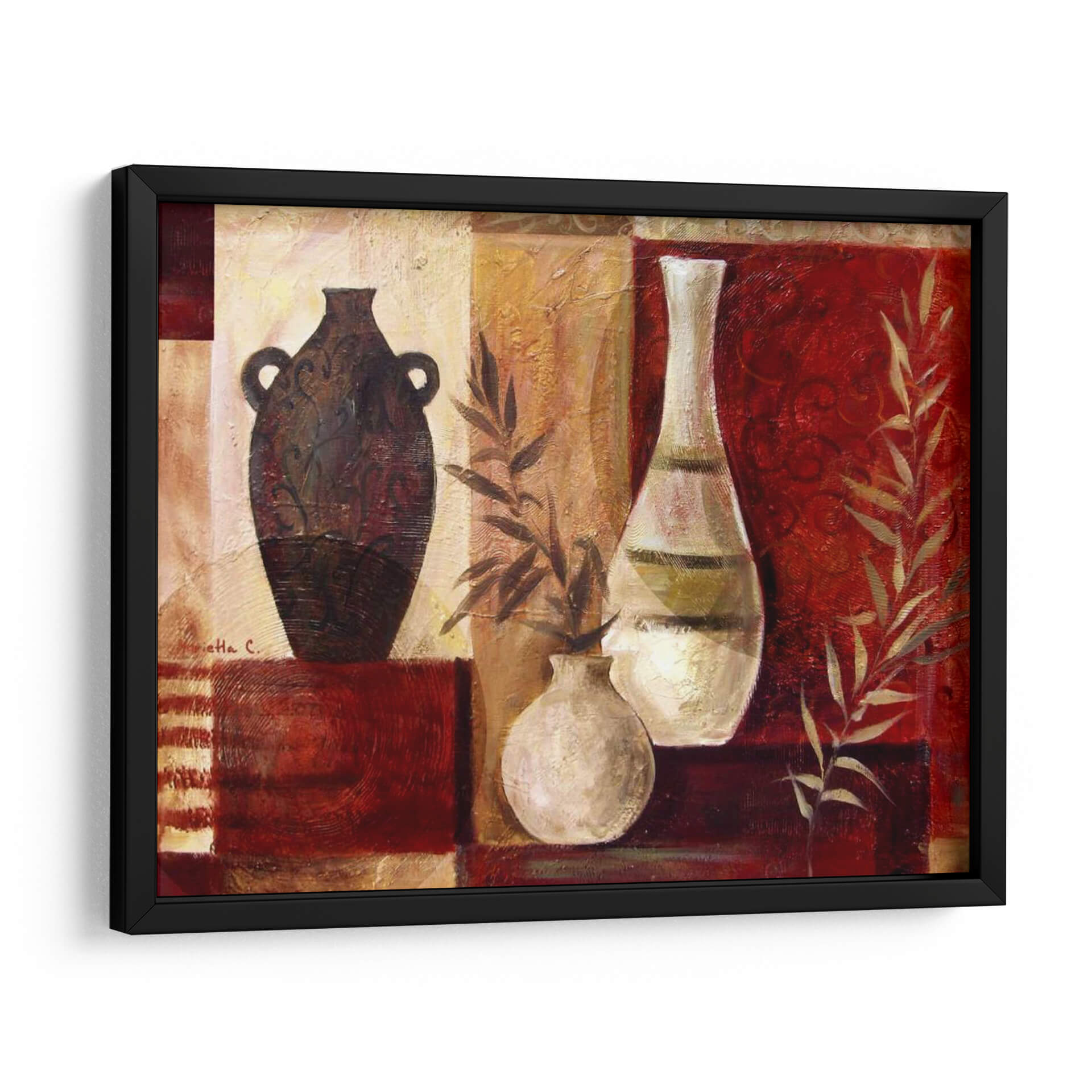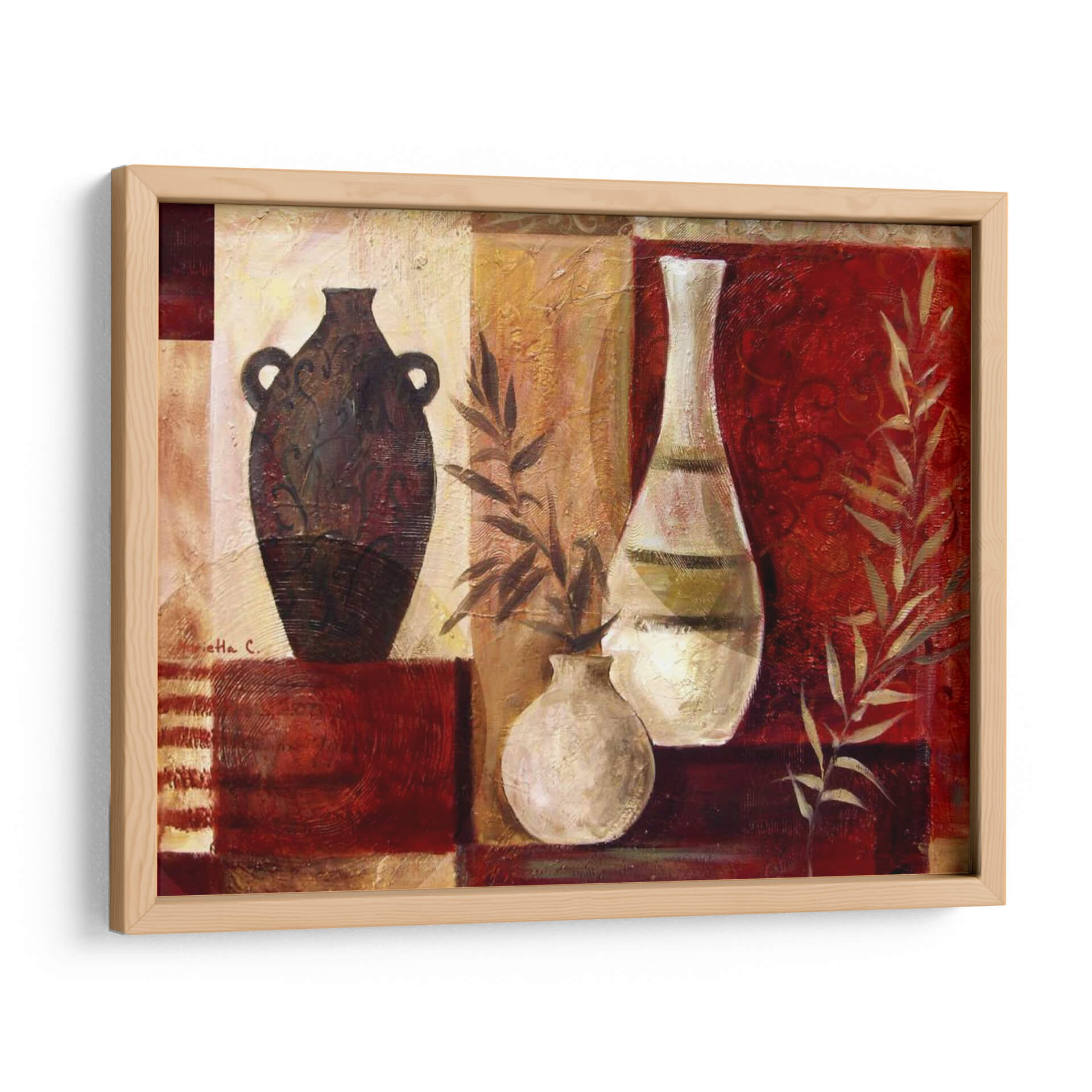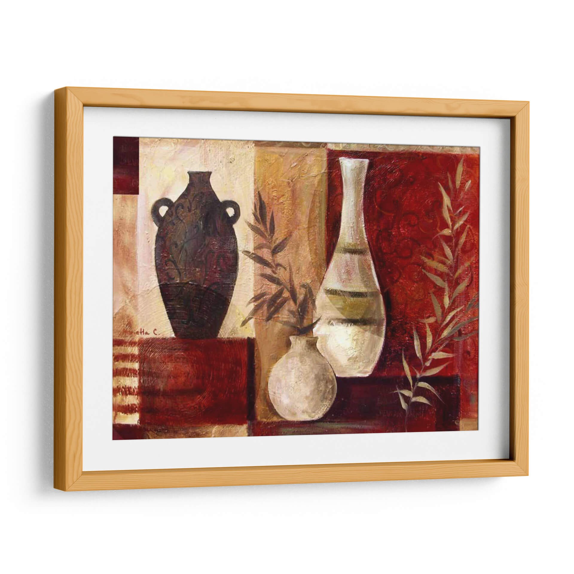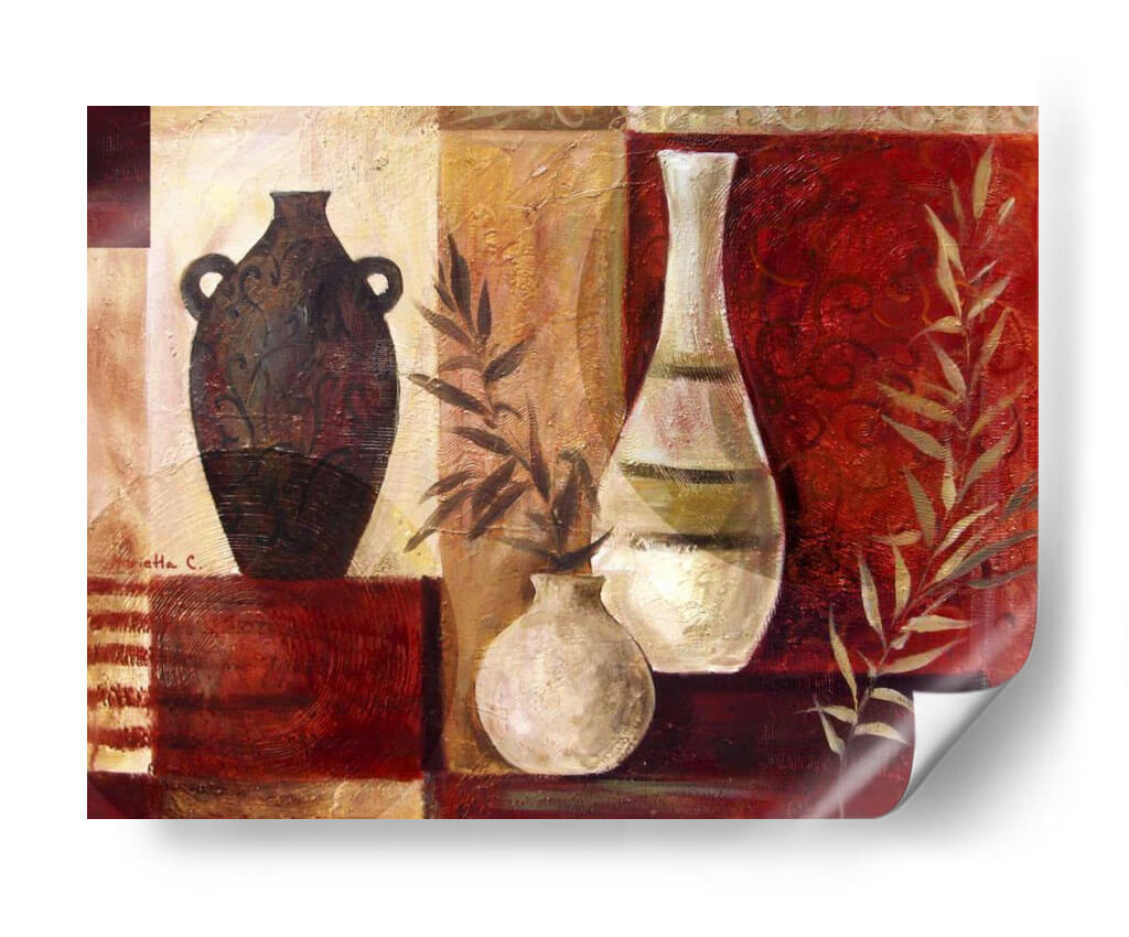 Aporta una dosis de elegancia rústica y calidez a tu hogar con este cautivador cuadro decorativo, "Jarrones De Especias I", de la artista Marietta Cohen. Esta obra maestra visual se centra en una serena composición de jarrones, evocando la esencia de la naturaleza y la artesanía tradicional. La paleta de colores, dominada por cálidos tonos tierra, rojos profundos y toques dorados, crea una atmósfera rica y acogedora. Los jarrones, uno oscuro y ornamentado y otro claro y esbelto, se complementan con delicadas ramas de follaje, añadiendo un elemento orgánico y vibrante. El estilo pictórico, con texturas sutiles y un enfoque casi abstracto en los detalles, invita a la contemplación. Este cuadro es ideal para quienes buscan añadir un punto focal sofisticado y lleno de carácter a su sala de estar, comedor o cocina. Su diseño atemporal y su rica profundidad visual lo convierten en una adición perfecta para espacios que buscan un toque de refinamiento y conexión con elementos naturales y artísticos. Transforma cualquier pared en una galería personal con esta pieza única.