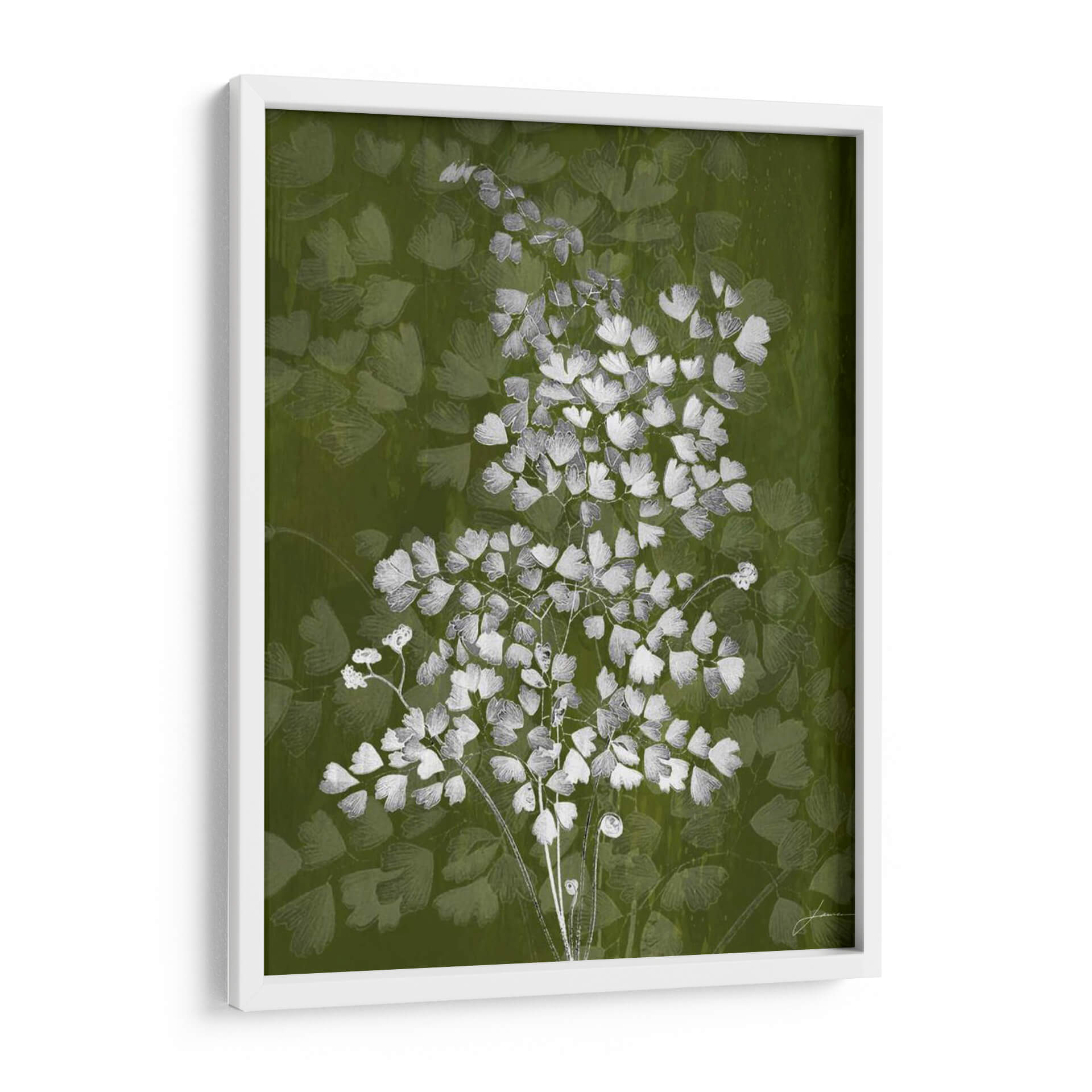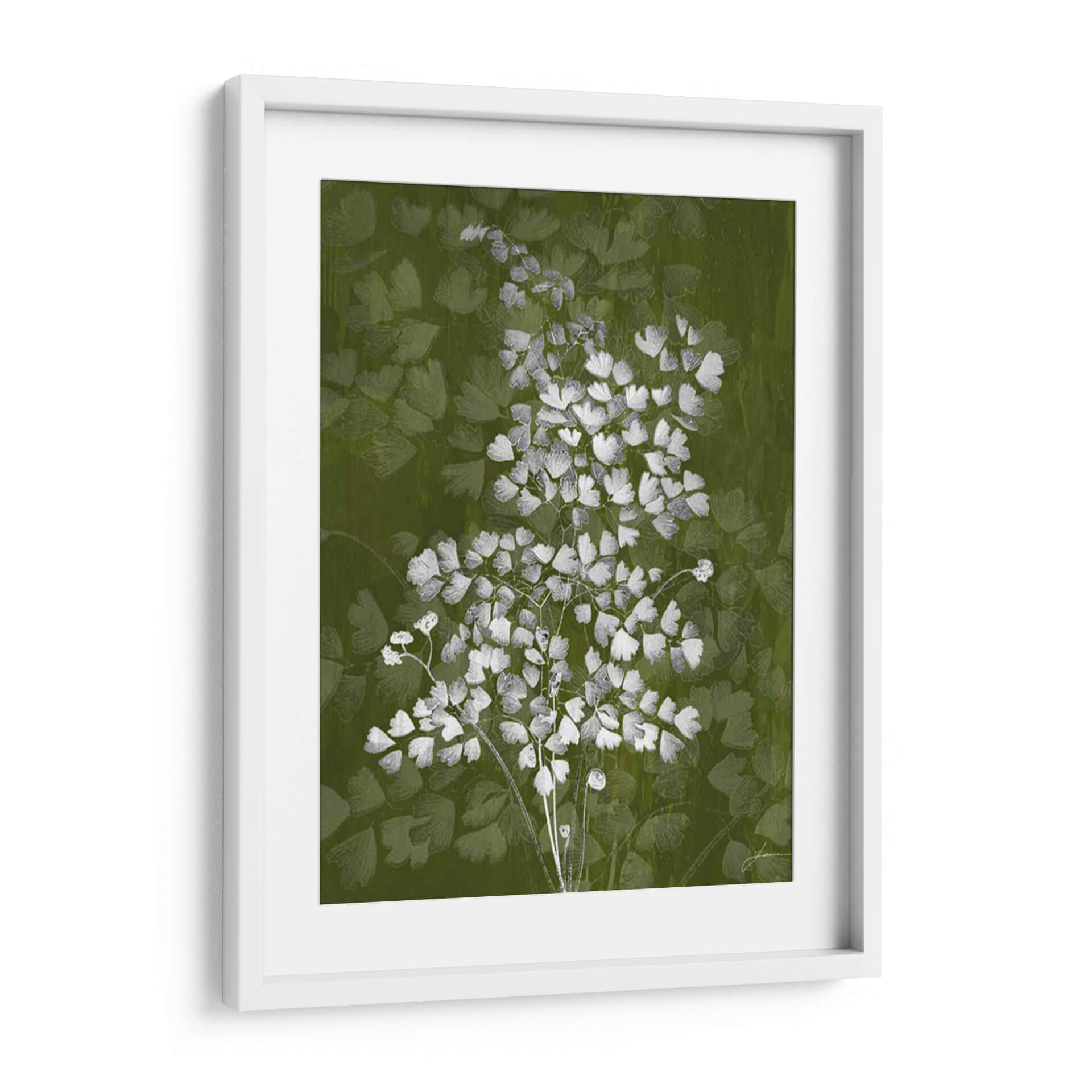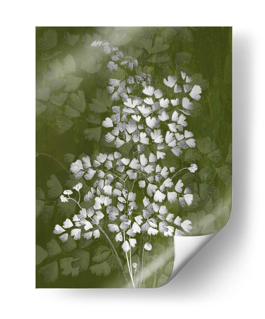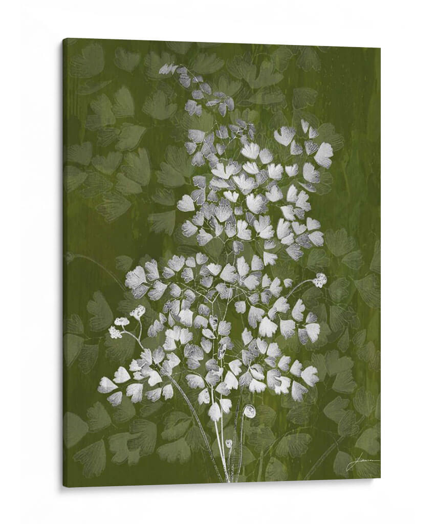 Sumérgete en la delicadeza botánica con "Jewel Ferns III" de James Burghardt, una obra de arte que captura la esencia etérea de la naturaleza. Este cuadro decorativo presenta un detallado estudio de helechos en tonos blancos y grises sobre un fondo vibrante y texturizado en verde musgo. La composición se centra en un ramillete principal de helechos, cuyas diminutas hojas crean un patrón intrincado y orgánico, mientras que un fondo sutil de formas similares aporta profundidad y un efecto casi soñador. La paleta de colores, dominada por el verde y contrastada con el blanco y gris, evoca una sensación de frescura, serenidad y conexión con el mundo natural. El estilo, que fusiona lo figurativo con toques abstractos en el tratamiento del fondo, resulta en una pieza moderna y sofisticada. "Jewel Ferns III" es ideal para añadir un toque de elegancia orgánica a cualquier espacio, ya sea una sala de estar, un dormitorio tranquilo o una oficina que busque un respiro visual. Transforma tu hogar con esta representación artística que combina la belleza intrínseca de la flora con una ejecución contemporánea, creando un ambiente de calma y refinamiento.