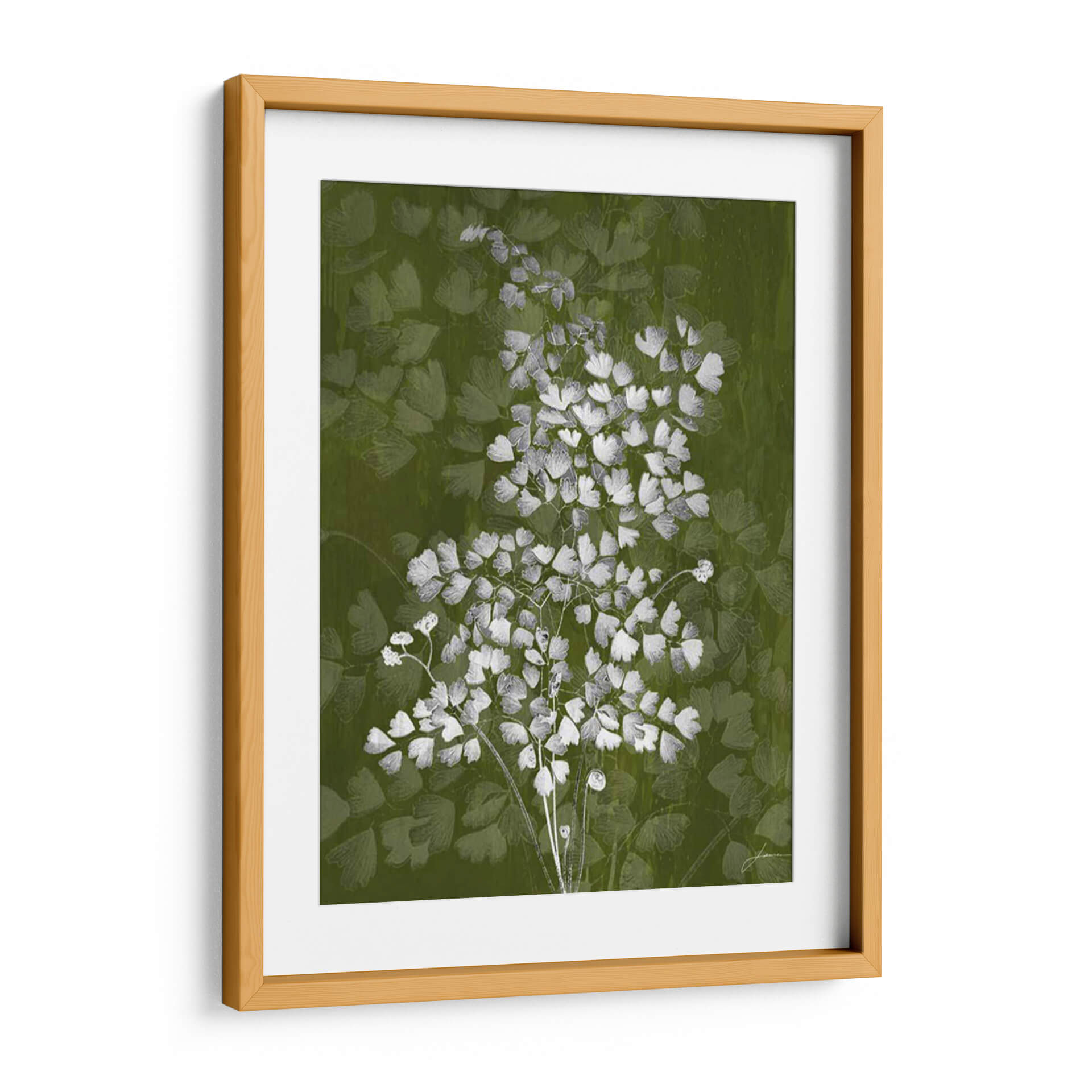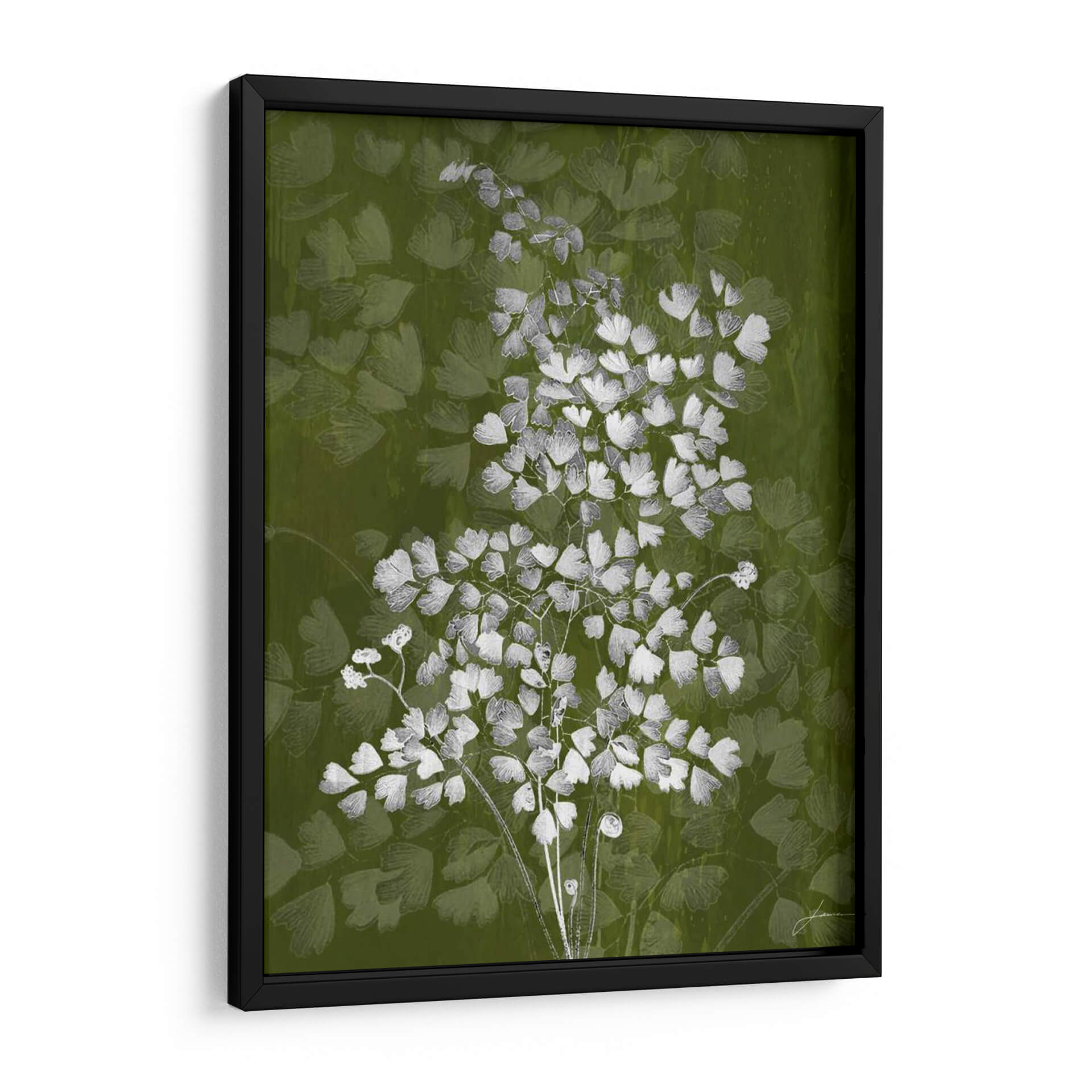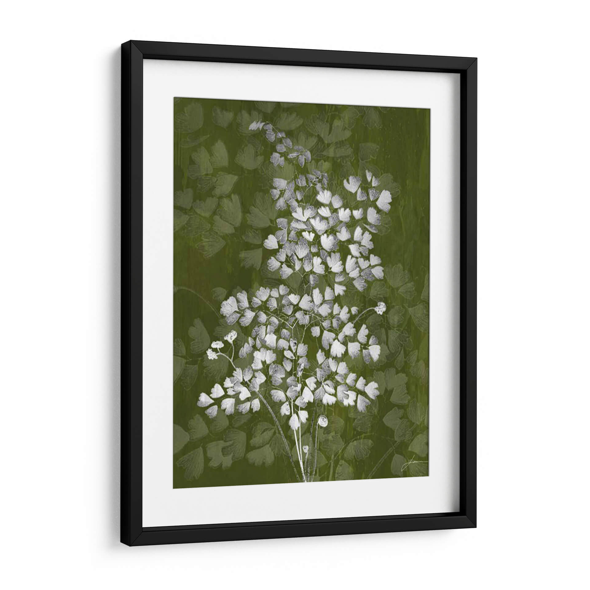 Sumérgete en la delicadeza botánica con "Jewel Ferns III" de James Burghardt, una obra de arte que captura la esencia etérea de la naturaleza. Este cuadro decorativo presenta un detallado estudio de helechos en tonos blancos y grises sobre un fondo vibrante y texturizado en verde musgo. La composición se centra en un ramillete principal de helechos, cuyas diminutas hojas crean un patrón intrincado y orgánico, mientras que un fondo sutil de formas similares aporta profundidad y un efecto casi soñador. La paleta de colores, dominada por el verde y contrastada con el blanco y gris, evoca una sensación de frescura, serenidad y conexión con el mundo natural. El estilo, que fusiona lo figurativo con toques abstractos en el tratamiento del fondo, resulta en una pieza moderna y sofisticada. "Jewel Ferns III" es ideal para añadir un toque de elegancia orgánica a cualquier espacio, ya sea una sala de estar, un dormitorio tranquilo o una oficina que busque un respiro visual. Transforma tu hogar con esta representación artística que combina la belleza intrínseca de la flora con una ejecución contemporánea, creando un ambiente de calma y refinamiento.