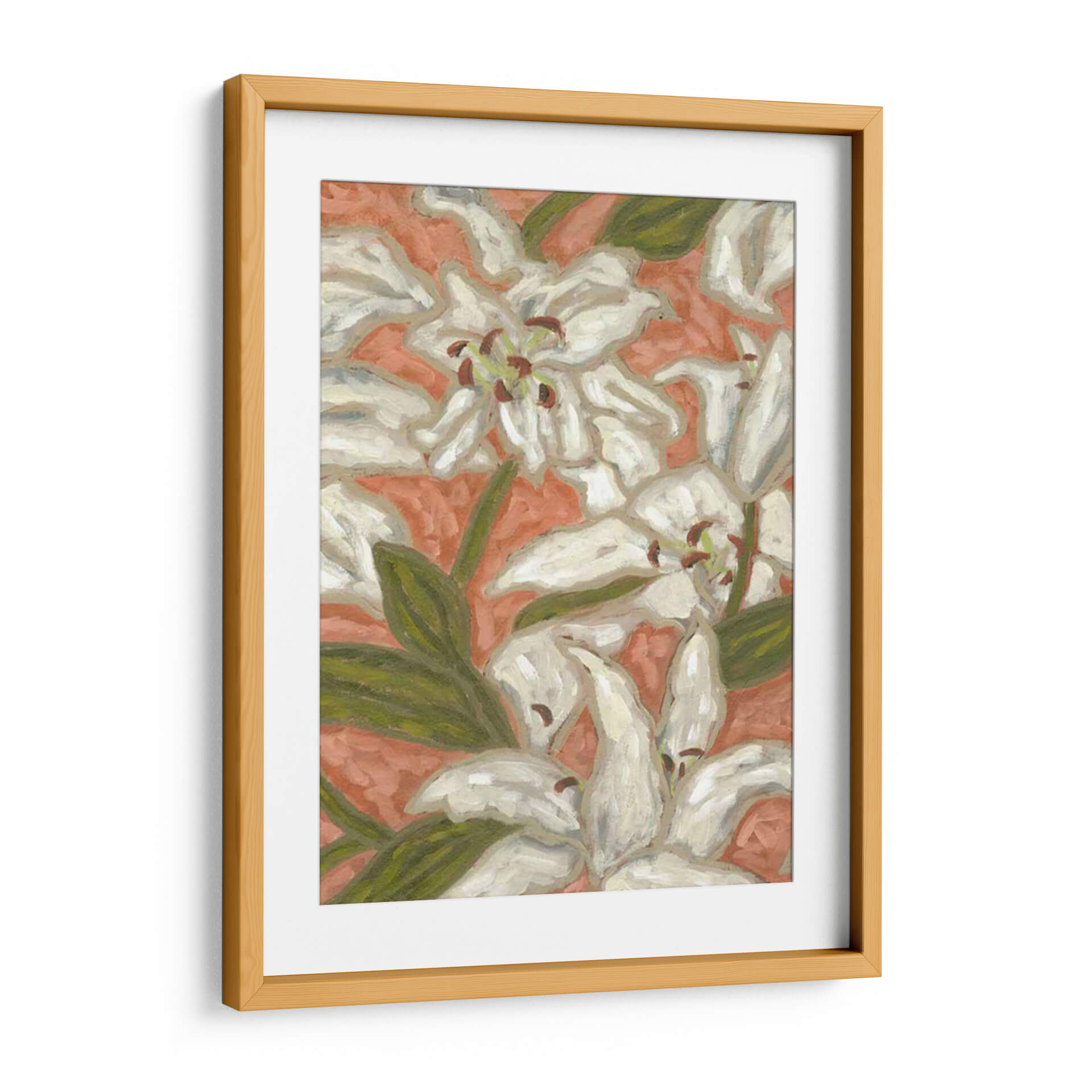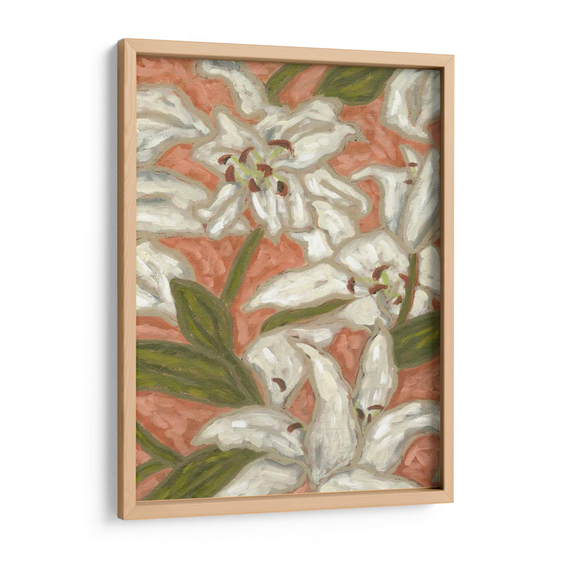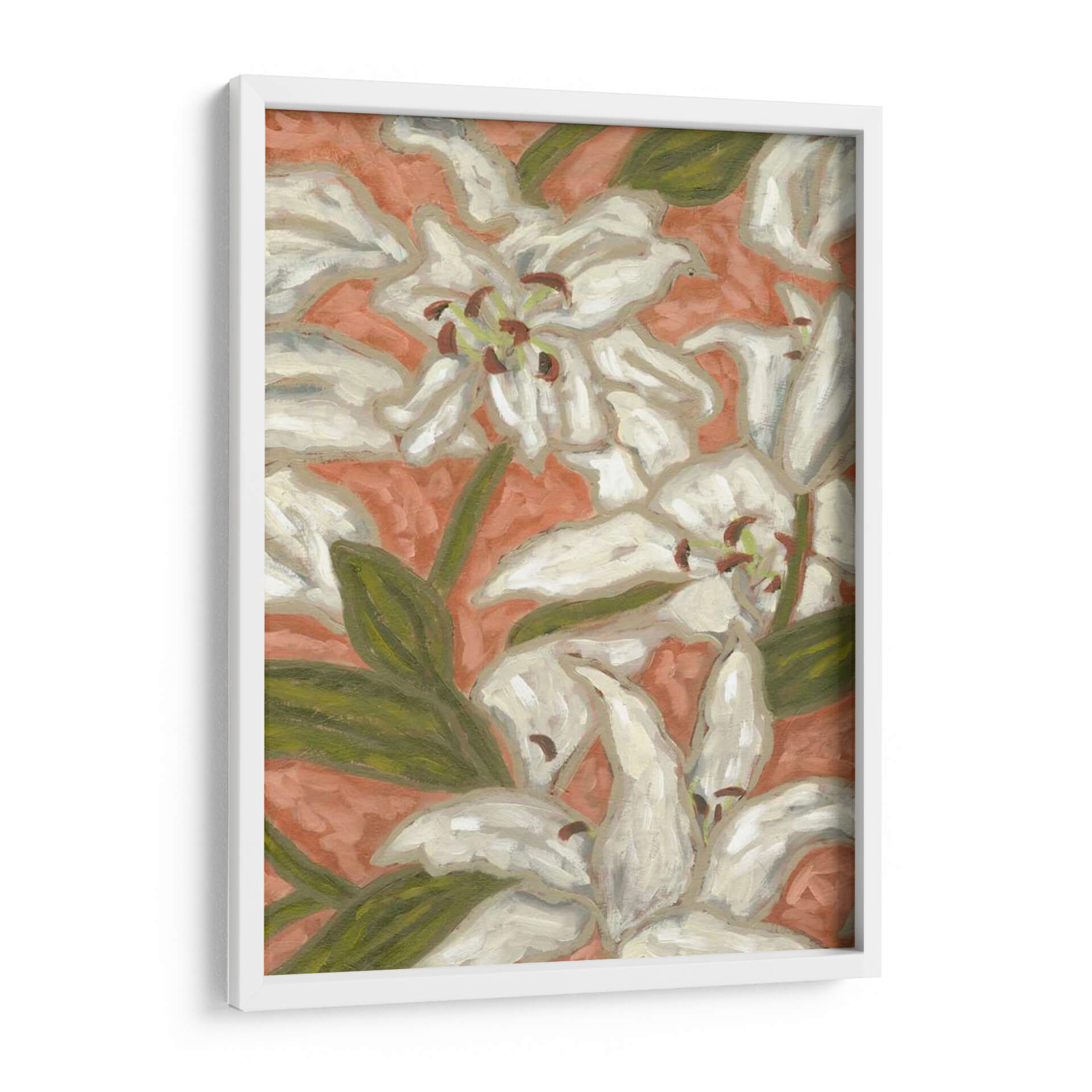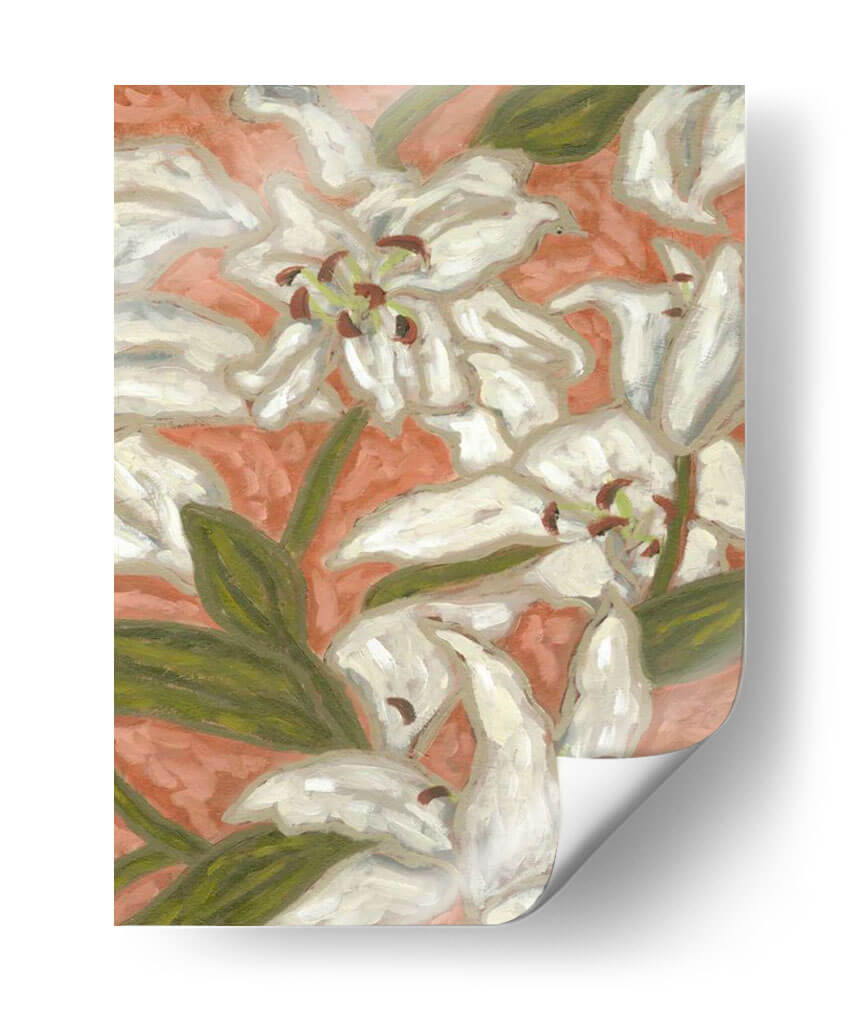Transforma tu espacio con el cautivador cuadro decorativo 'Lily Masagerie I' de Karen Deans. Esta obra de arte presenta una exuberante composición de lirios blancos en plena floración, capturados con pinceladas expresivas y un estilo que evoca la delicadeza de la naturaleza. Los pétalos cremosos y las sutiles sombras crean una sensación de profundidad y realismo, contrastando maravillosamente con el fondo vibrante en tonos coral y salmón. Las hojas verdes, aplicadas con trazos audaces, añaden un toque de frescura y vitalidad. La atmósfera general de la pieza es serena y elegante, perfecta para infundir calma y belleza en cualquier habitación. Ideal para quienes buscan añadir un elemento floral sofisticado a su decoración, este cuadro decorativo es una invitación a la contemplación y al disfrute estético. Su diseño versátil lo convierte en un punto focal impresionante para salas de estar, dormitorios o entradas, aportando un aire de primavera atemporal. Añade un toque de naturaleza artística y color a tu hogar con esta pieza única que celebra la belleza efímera de las flores.