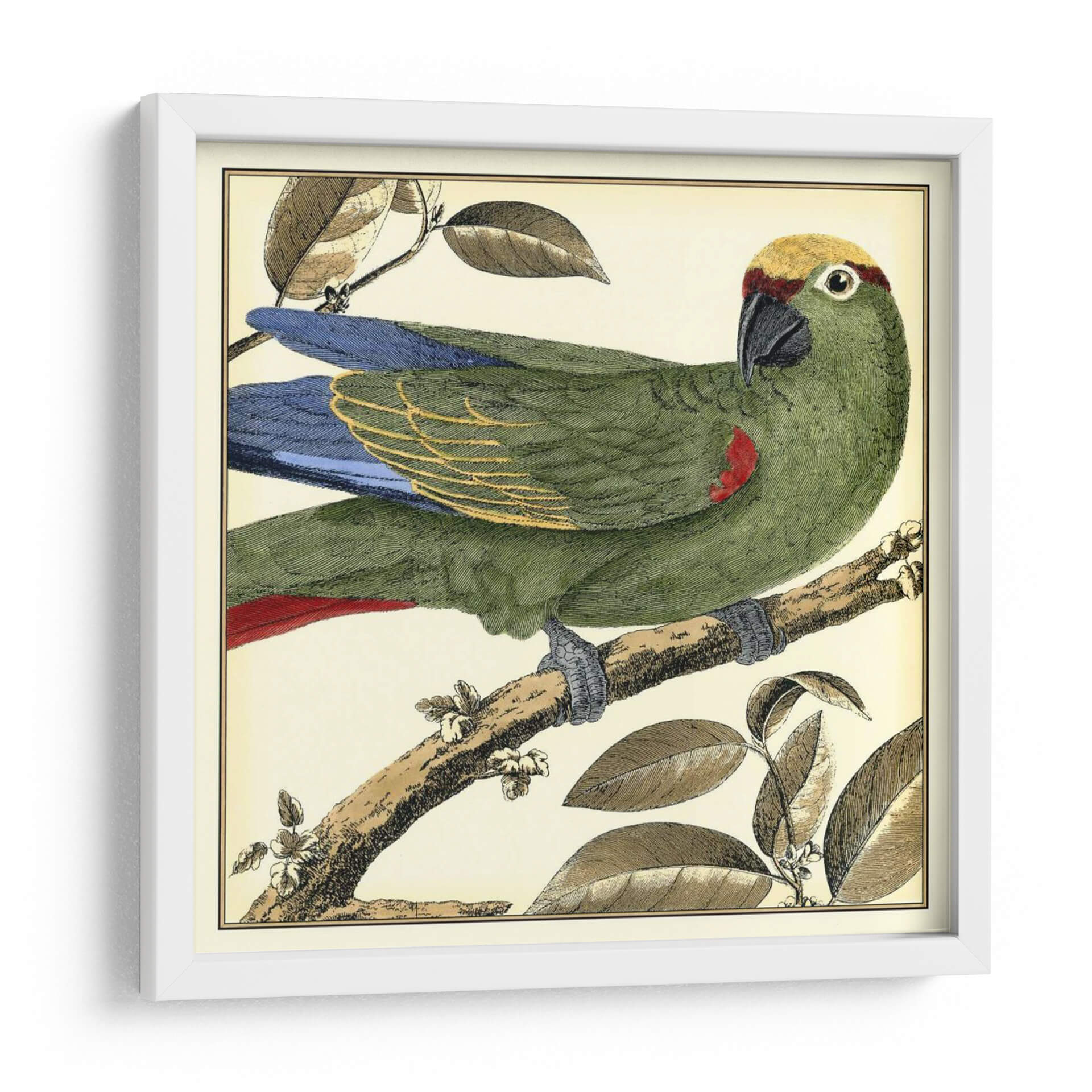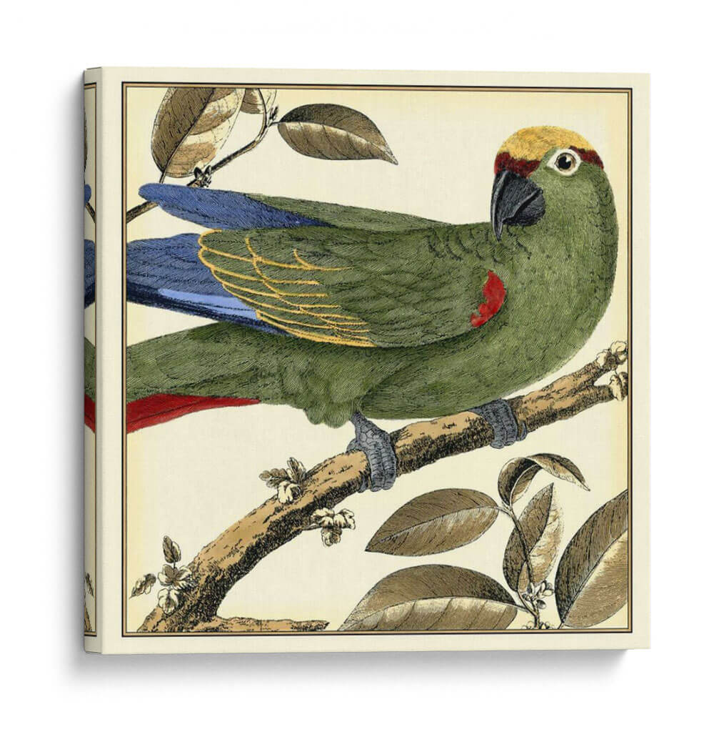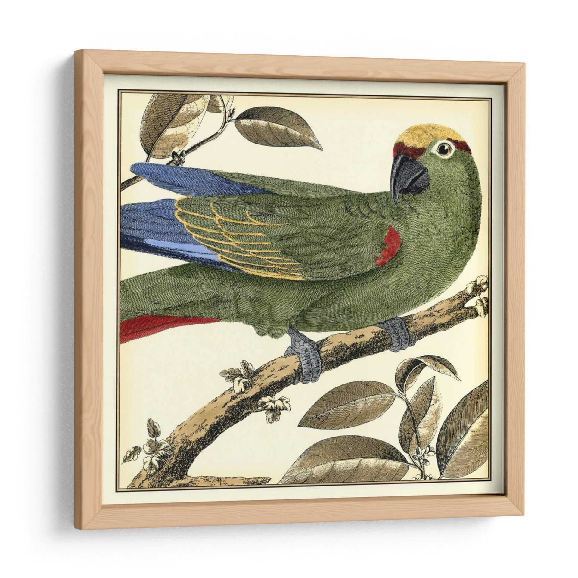 Este cautivador cuadro decorativo, titulado 'Loro Tropical I' por Martinet, te transportará a la exuberancia de la naturaleza con su detallada representación de un loro vibrante. La obra se centra en un loro de plumaje predominantemente verde, con toques de azul en las alas, rojo en la cola y un distintivo amarillo en la cabeza y un matiz rojizo en el pecho, posado elegantemente sobre una rama. Los colores, ricos y saturados pero con un toque vintage, crean una atmósfera serena y a la vez llena de vida, evocando la tranquilidad de un entorno natural. El estilo de ilustración, que recuerda a los grabados botánicos clásicos, aporta un aire de sofisticación y atemporalidad. La composición, centrada en el loro y los elementos naturales que lo rodean, como hojas y ramas con un diseño delicado, crea un punto focal inmediato. Este cuadro es perfecto para añadir un toque de color y un aire exótico a cualquier espacio, ya sea una sala de estar moderna, un estudio acogedor o incluso un dormitorio. Su diseño detallado y su paleta de colores lo convierten en una pieza de conversación ideal, capaz de infundir vitalidad y elegancia en la decoración de tu hogar u oficina, invitando a la admiración por la belleza de la vida silvestre.