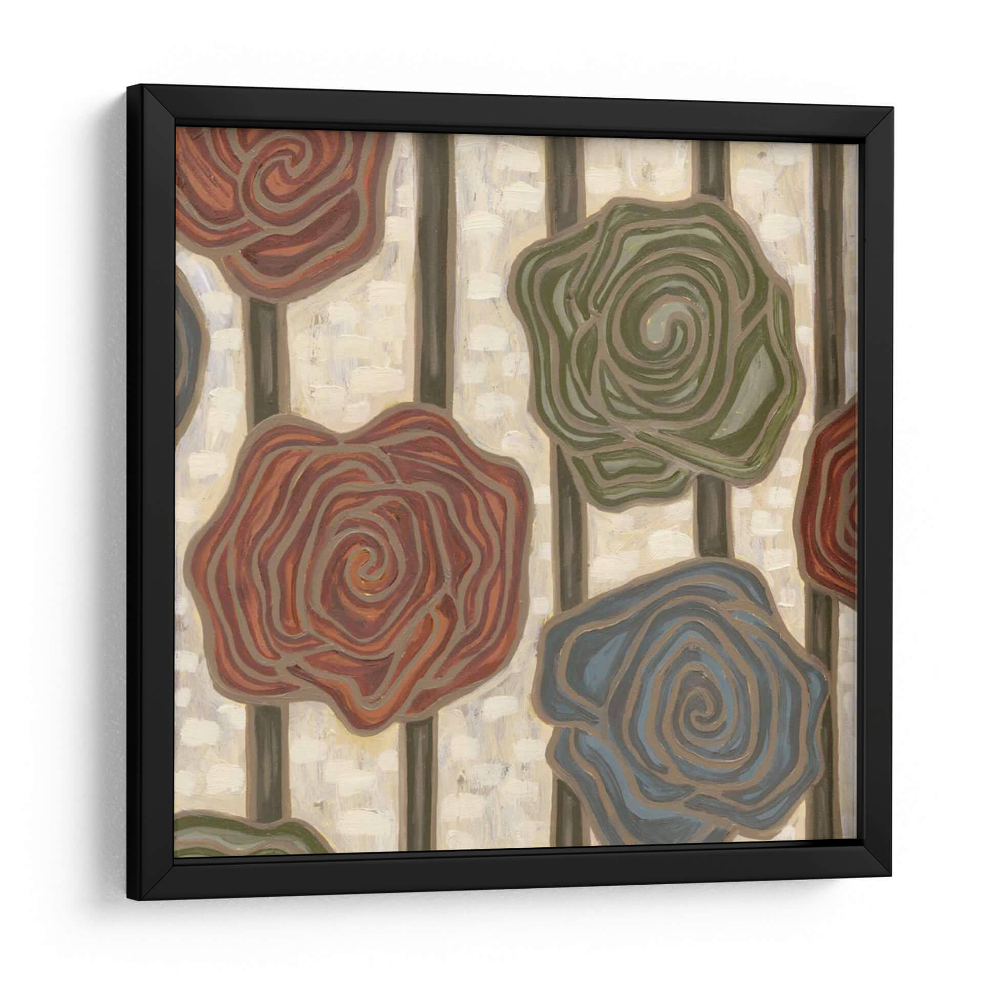 Sumérgete en la serenidad botánica con 'Mod Rosettes I', una cautivadora obra de arte que celebra la belleza de las formas florales abstractas. Creada por Karen Deans, esta pieza presenta un patrón rítmico de rosetas estilizadas en tonos tierra, verde salvia y azul apagado, contrastando suavemente con un fondo texturizado de rayas verticales en crema y beige. La composición, que evoca una sensación de orden natural y tranquilidad, es ideal para infundir calma en cualquier espacio. Cada roseta, con sus líneas concéntricas y contornos definidos en un tono terroso, parece girar suavemente, invitando a la contemplación. La paleta de colores es suave y armoniosa, creando una atmósfera relajante que complementa a la perfección entornos de hogar u oficina. Este cuadro decorativo es perfecto para aquellos que buscan añadir un toque de elegancia orgánica y un respiro visual a su decoración. 'Mod Rosettes I' no es solo una obra de arte, es una invitación a la paz interior, un punto focal que aporta sofisticación y una conexión sutil con la naturaleza. Añade esta pieza única a tu colección y transforma tu ambiente en un santuario de estilo y serenidad.