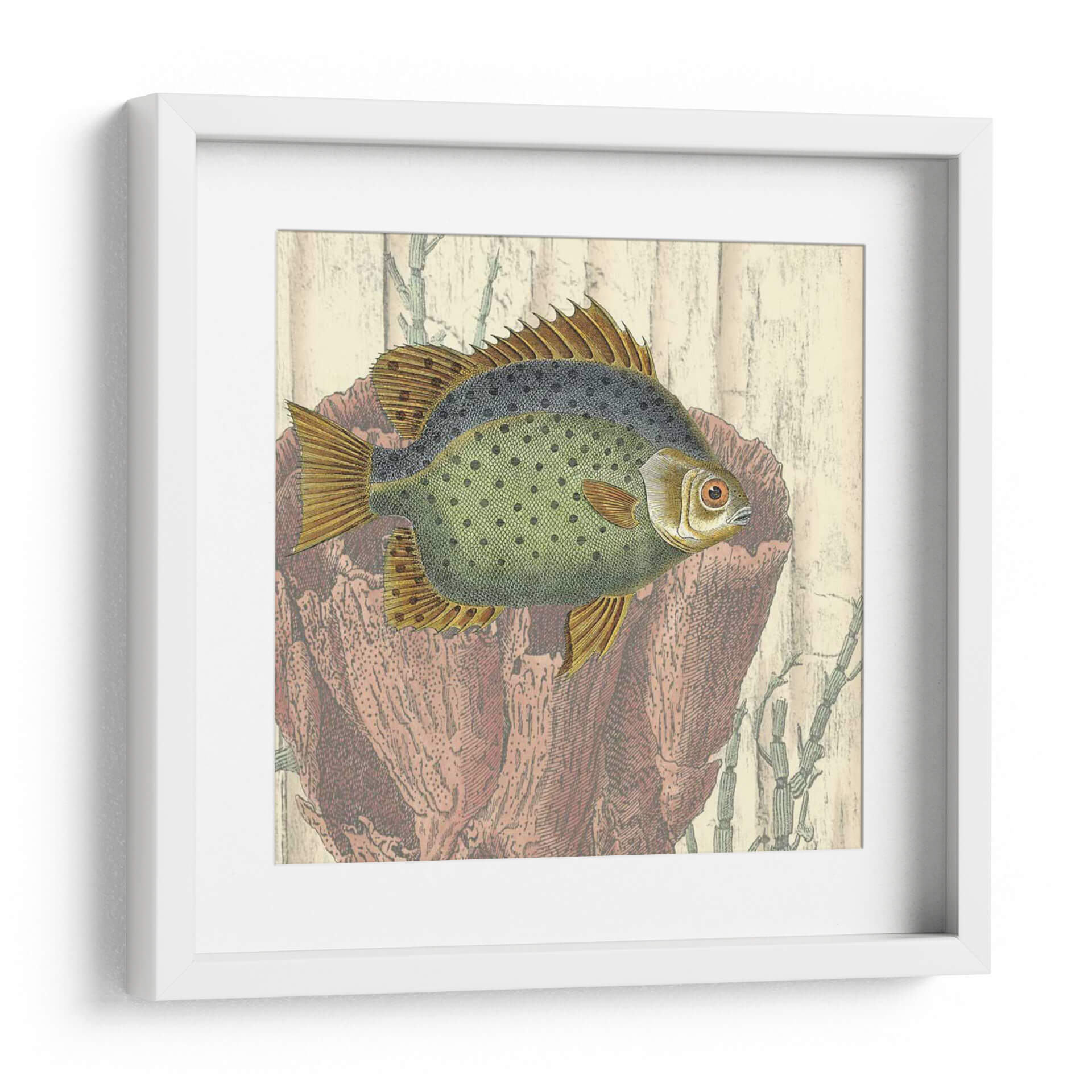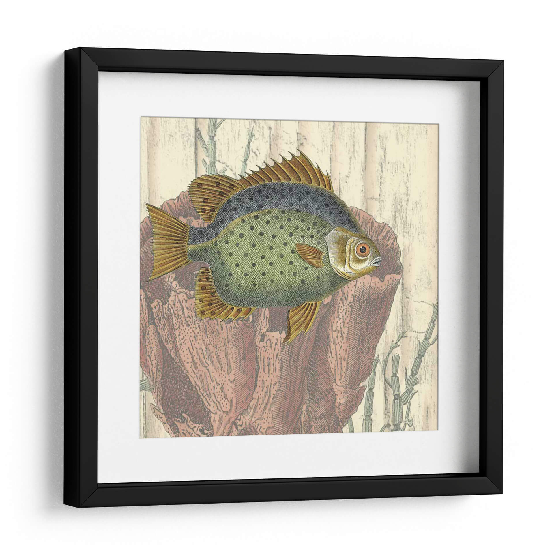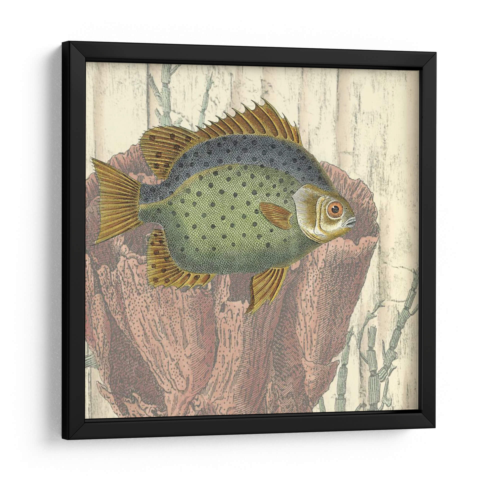 Este cautivador cuadro decorativo, 'Montaje Costero III' de Vision Studio, transporta la serenidad del océano a tu hogar. La obra presenta un detallado grabado de un pez, con un cuerpo verde moteado y aletas doradas, enmarcado por elementos marinos en tonos terracota y beige que evocan la textura de la madera y corales. La paleta de colores, que combina verdes suaves, ocres cálidos y rojos terrosos, crea una atmósfera de tranquilidad y conexión con la naturaleza. El estilo, que recuerda a las ilustraciones científicas antiguas, aporta un toque de nostalgia y elegancia. Ideal para salones, estudios o dormitorios, este cuadro decorativo se integra perfectamente en ambientes que buscan un acento de calma y sofisticación. Añade una pincelada de vida marina y un toque de arte clásico a tu decoración con esta pieza única. Su composición equilibrada y los detalles intrincados invitan a la contemplación, convirtiéndola en un punto focal que inspira paz y admiración.