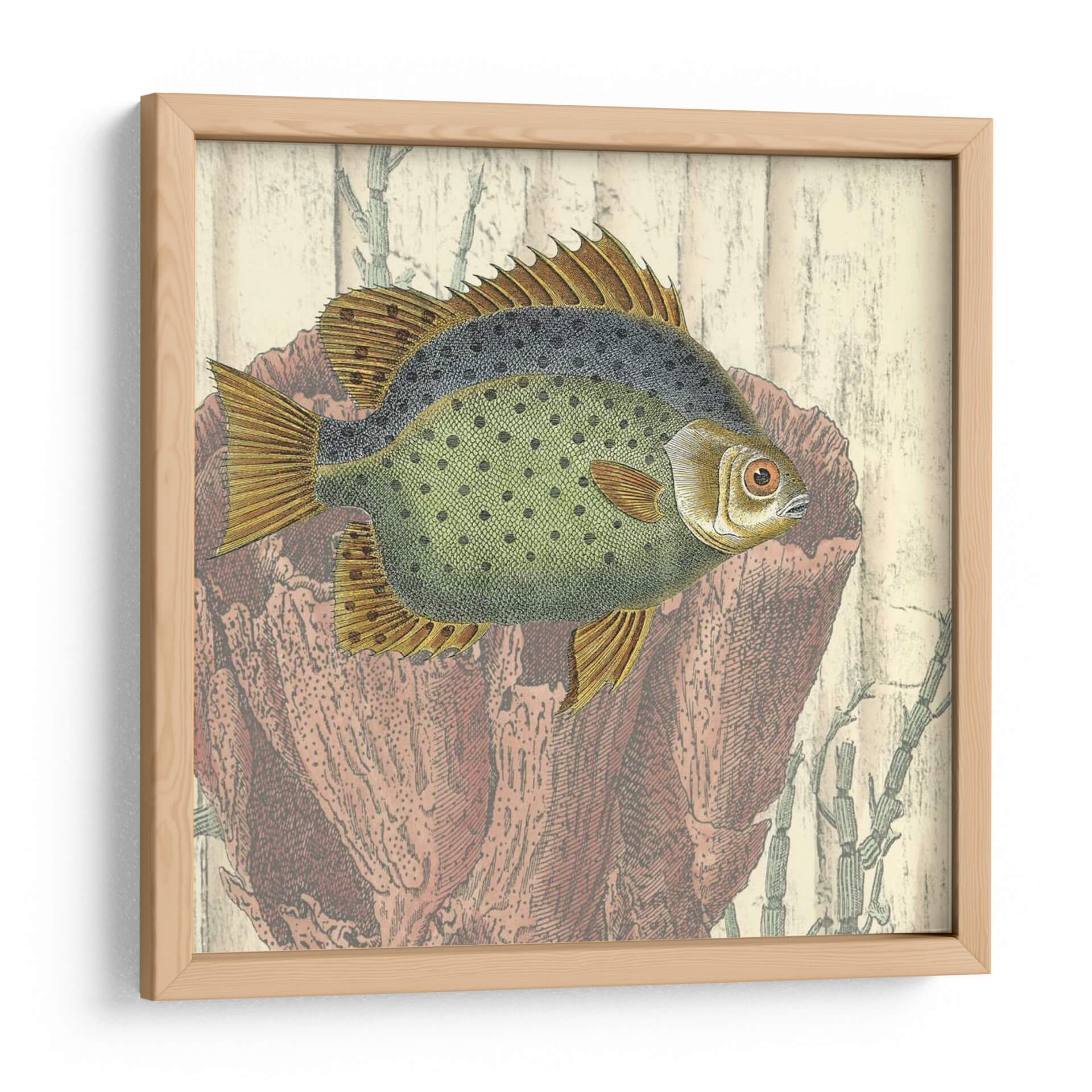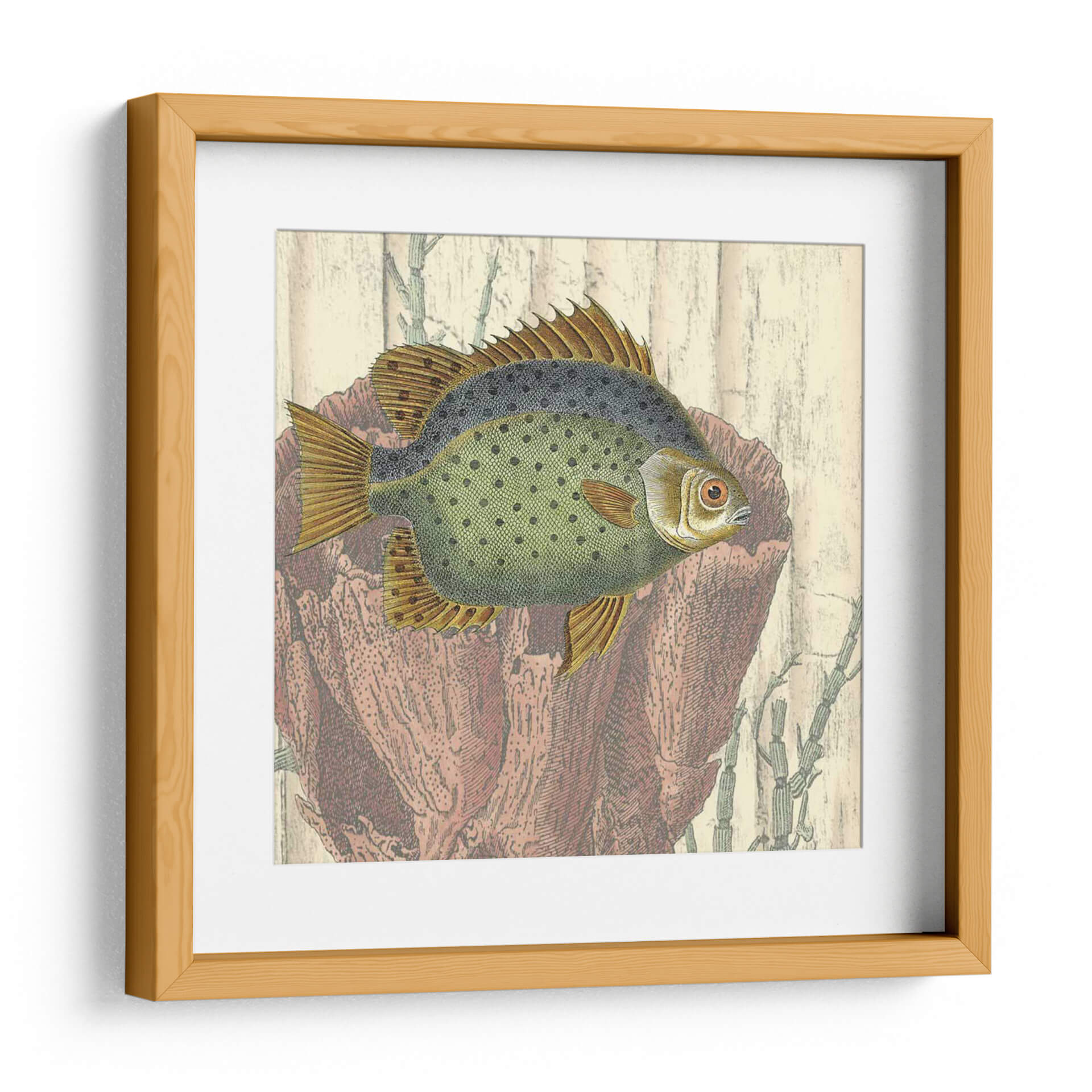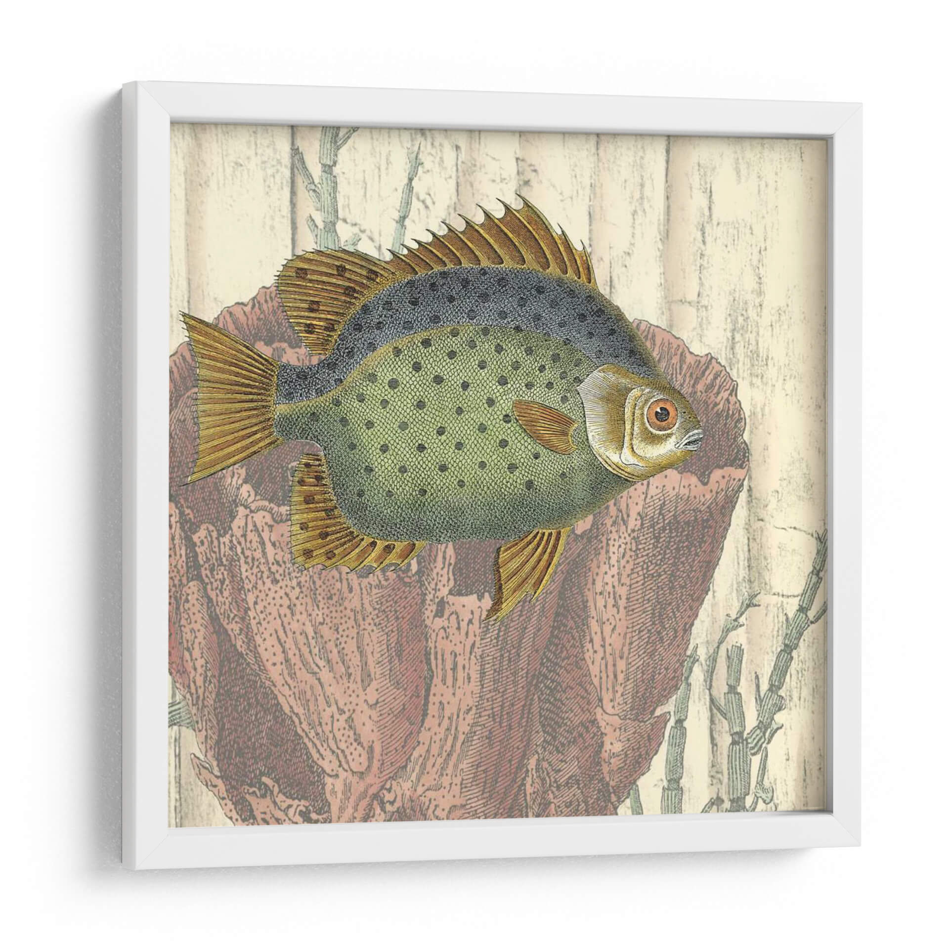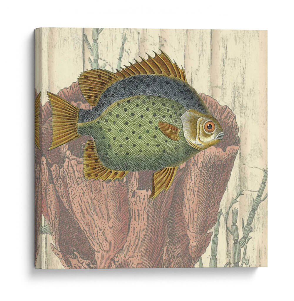 Este cautivador cuadro decorativo, 'Montaje Costero III' de Vision Studio, transporta la serenidad del océano a tu hogar. La obra presenta un detallado grabado de un pez, con un cuerpo verde moteado y aletas doradas, enmarcado por elementos marinos en tonos terracota y beige que evocan la textura de la madera y corales. La paleta de colores, que combina verdes suaves, ocres cálidos y rojos terrosos, crea una atmósfera de tranquilidad y conexión con la naturaleza. El estilo, que recuerda a las ilustraciones científicas antiguas, aporta un toque de nostalgia y elegancia. Ideal para salones, estudios o dormitorios, este cuadro decorativo se integra perfectamente en ambientes que buscan un acento de calma y sofisticación. Añade una pincelada de vida marina y un toque de arte clásico a tu decoración con esta pieza única. Su composición equilibrada y los detalles intrincados invitan a la contemplación, convirtiéndola en un punto focal que inspira paz y admiración.