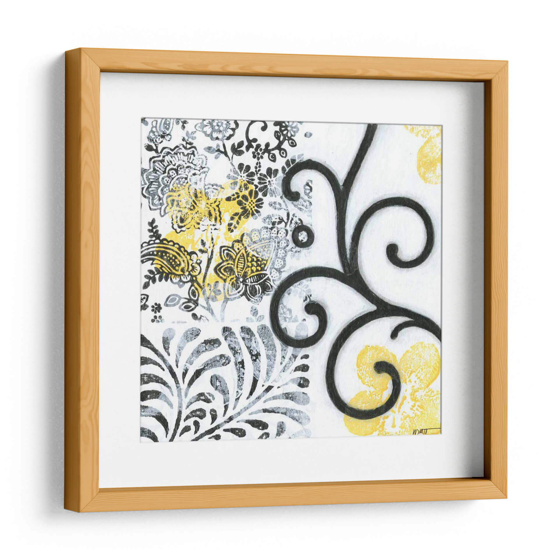 Sumérgete en la elegancia y el dinamismo de "Opulencia II", una obra de arte contemporáneo que fusiona motivos florales y ornamentales con un toque moderno. Esta pieza destaca por su intrincado diseño, donde se entrelazan delicados patrones inspirados en el estilo paisley y florales, contrastando magistralmente con audaces volutas negras que aportan profundidad y movimiento. La paleta de colores, dominada por el blanco, el negro y vibrantes toques de amarillo, crea una atmósfera sofisticada y enérgica, perfecta para cualquier espacio que busque un acento de estilo y carácter. El artista Norman Wyatt Jr. demuestra una habilidad excepcional para combinar elementos tradicionales con una estética contemporánea, resultando en un cuadro decorativo que es a la vez clásico y vanguardista. "Opulencia II" es ideal para infundir vida a salas de estar, estudios o comedores, actuando como un punto focal que invita a la contemplación y al aprecio por el arte detallado. Su composición equilibrada y su paleta de colores lo convierten en una adición versátil y atemporal a tu decoración.